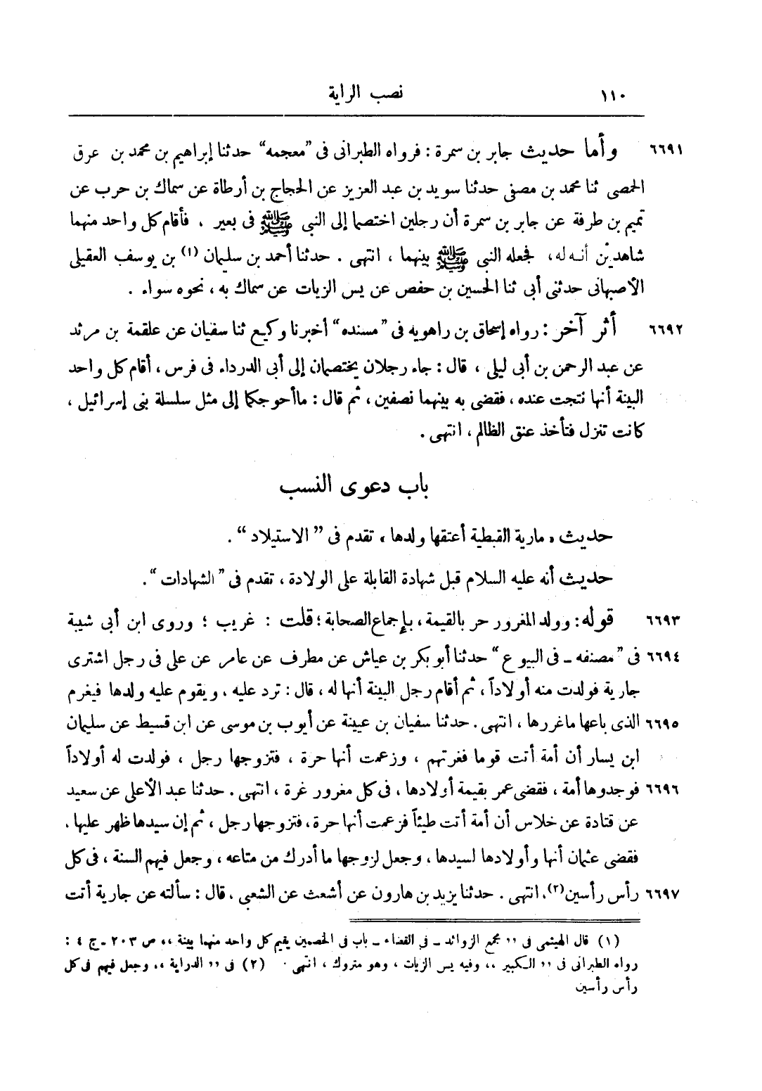 وَأَمَّا حَدِيثُ جَابِرِ بْنِ سَمُرَةَ: فَرَوَاهُ الطَّبَرَانِيُّ فِي مُعْجَمِهِ حَدَّثَنَا إبْرَاهِيمُ بْنُ مُحَمَّدِ بْنِ عَوْفٍ الْحِمْصِيُّ ثَنَا مُحَمَّدُ بْنُ مُصَفَّى حَدَّثَنَا سُوَيْد بْنُ عَبْدِ الْعَزِيزِ عَنْ الْحَجَّاجِ بْنِ أَرْطَاةَ عَنْ سِمَاكِ بْنِ حَرْبٍ عَنْ تَمِيمِ بْنِ طَرَفَةَ عَنْ جَابِرِ بْنِ سَمُرَةَ أَنَّ رَجُلَيْنِ اخْتَصَمَا إلَى النَّبِيِّ صَلَّى اللَّهُ عَلَيْهِ وَسَلَّمَ فِي بَعِيرٍ، فَأَقَامَ كُلُّ وَاحِدٍ مِنْهُمَا شَاهِدَيْنِ بِأَنَّهُ لَهُ، فَجَعَلَهُ النَّبِيُّ صَلَّى اللَّهُ عَلَيْهِ وَسَلَّمَ بَيْنَهُمَا، انْتَهَى. حَدَّثَنَا أَحْمَدُ بْنُ سُلَيْمَانَ1 بْنِ يُوسُفَ الْعُقَيْلِيُّ الْأَصْبَهَانِيُّ حَدَّثَنِي أَبِي ثَنَا الْحُسَيْنُ بْنُ حَفْصٍ عن يس الزَّيَّاتِ عَنْ سِمَاكٍ بِهِ، نَحْوُهُ سَوَاءٌ.