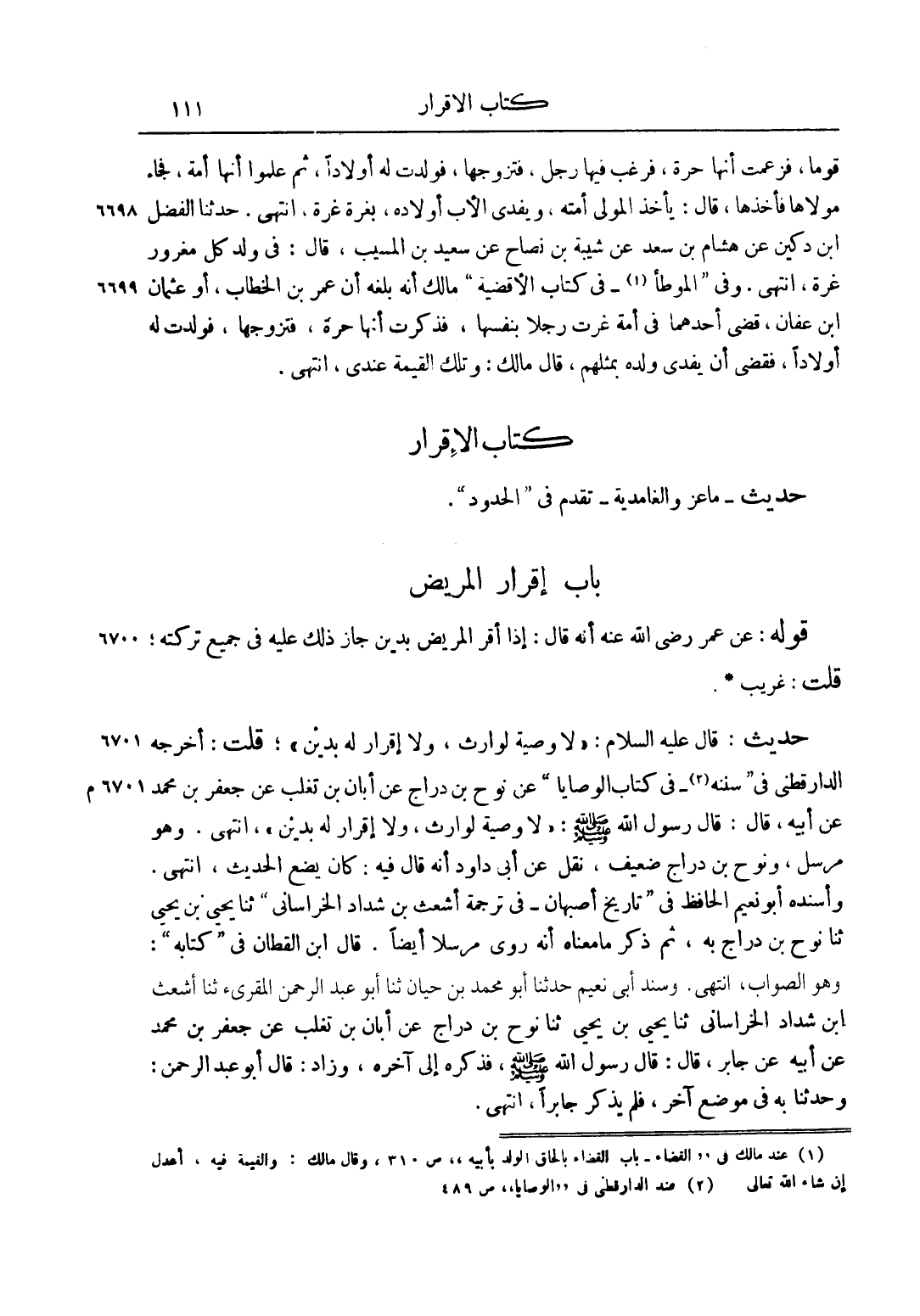 قَوْلُهُ: عَنْ عُمَرَ رضي الله عنه أَنَّهُ قَالَ: إذَا أَقَرَّ الْمَرِيضُ بِدَيْنٍ جَازَ ذَلِكَ عَلَيْهِ فِي جَمِيعِ تَرِكَتِهِ، قُلْت: غَرِيبٌ.