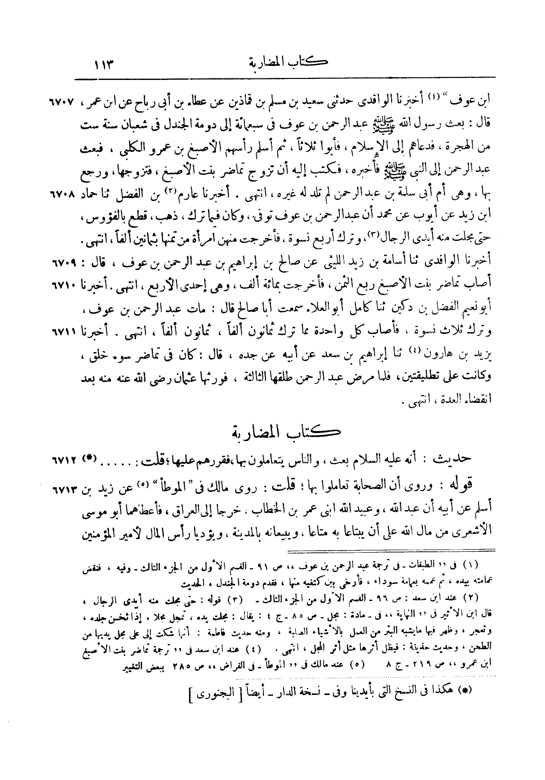 بْنِ عَوْفٍ1 أَخْبَرَنَا الْوَاقِدِيُّ حَدَّثَنِي سَعِيدُ بْنُ مُسْلِمٍ بْنِ قَمَاذِينَ عَنْ عَطَاءِ بْنِ أَبِي رَبَاحٍ عَنْ ابْنِ عُمَرَ، قَالَ: بَعَثَ رَسُولُ اللَّهِ صَلَّى اللَّهُ عَلَيْهِ وَسَلَّمَ عَبْدَ الرَّحْمَنِ بْنَ عَوْفٍ فِي سَبْعِمِائَةٍ إلَى دَوْمَةِ الْجَنْدَلِ فِي شَعْبَانَ سَنَةَ سِتٍّ مِنْ الْهِجْرَةِ، فَدَعَاهُمْ إلَى الْإِسْلَامِ، فَأَبَوْا ثَلَاثًا، ثُمَّ أَسْلَمَ رَأْسُهُمْ الْأَصْبَغُ بْنُ عَمْرٍو الْكَلْبِيُّ، فَبَعَثَ عَبْدُ الرَّحْمَنِ إلَى النَّبِيِّ صَلَّى اللَّهُ عَلَيْهِ وَسَلَّمَ فَأَخْبَرَهُ، فَكَتَبَ إلَيْهِ أَنْ تَزَوَّجْ تُمَاضِرَ بِنْتَ الْأَصْبَغِ، فَتَزَوَّجَهَا، وَرَجَعَ بِهَا، وَهِيَ أُمُّ أَبِي سَلَمَةَ بْنِ عَبْدِ الرَّحْمَنِ لَمْ تَلِدْ لَهُ غَيْرَهُ، انْتَهَى. أَخْبَرَنَا عَارِمُ2 بْنُ الْفَضْلِ ثَنَا حَمَّادُ بْنُ زَيْدٍ عَنْ أَيُّوبَ عَنْ مُحَمَّدٍ أَنَّ عَبْدَ الرَّحْمَنِ بْنَ عَوْفٍ تُوُفِّيَ، وَكَانَ فِيمَا تَرَكَ، ذَهَبٌ، قُطِّعَ بِالْفُؤُوسِ، حَتَّى مَجِلَتْ مِنْهُ أَيْدِي الرِّجَالِ3، وَتَرَكَ أَرْبَعَ نِسْوَةٍ، فَأُخْرِجَتْ مِنْهُنَّ امْرَأَةٌ مِنْ ثُمُنِهَا بِثَمَانِينَ أَلْفًا، انْتَهَى. أَخْبَرَنَا الْوَاقِدِيُّ ثَنَا أُسَامَةُ بْنُ زَيْدٍ اللَّيْثِيُّ عَنْ صَالِحِ بْنِ إبْرَاهِيمَ بْنِ عَبْدِ الرَّحْمَنِ بْنِ عَوْفٍ، قَالَ: أَصَابَ تُمَاضِرَ بِنْتَ الْأَصْبَغِ رُبُعُ الثُّمُنِ، فَأُخْرِجَتْ بِمِائَةِ أَلْفٍ، وَهِيَ إحْدَى الْأَرْبَعِ، انْتَهَى. أَخْبَرَنَا أَبُو نُعَيْمٍ الْفَضْلُ بْنُ دُكَيْنٍ ثَنَا كَامِلٌ أَبُو الْعَلَاءِ سَمِعْت أَبَا صَالِحٍ قَالَ: مَاتَ عَبْدُ الرَّحْمَنِ بْنُ عَوْفٍ، وَتَرَكَ ثَلَاثَ نِسْوَةٍ، فَأَصَابَ كُلَّ وَاحِدَةٍ مِمَّا تَرَكَ ثَمَانُونَ أَلْفًا، ثَمَانُونَ أَلْفًا، انْتَهَى. أَخْبَرَنَا يَزِيدُ بْنُ هَارُونَ4 ثَنَا إبْرَاهِيمُ بْنُ سَعْدٍ عَنْ أَبِيهِ عَنْ جَدِّهِ، قَالَ: كَانَ فِي تُمَاضِرَ سُوءُ خُلُقٍ، وَكَانَتْ عَلَى تَطْلِيقَتَيْنِ، فَلَمَّا مَرِضَ عَبْدُ الرَّحْمَنِ طَلَّقَهَا الثَّالِثَةَ، فَوَرَّثَهَا عُثْمَانُ رضي الله عنه مِنْهُ بَعْدَ انْقِضَاءِ الْعِدَّةِ، انْتَهَى.