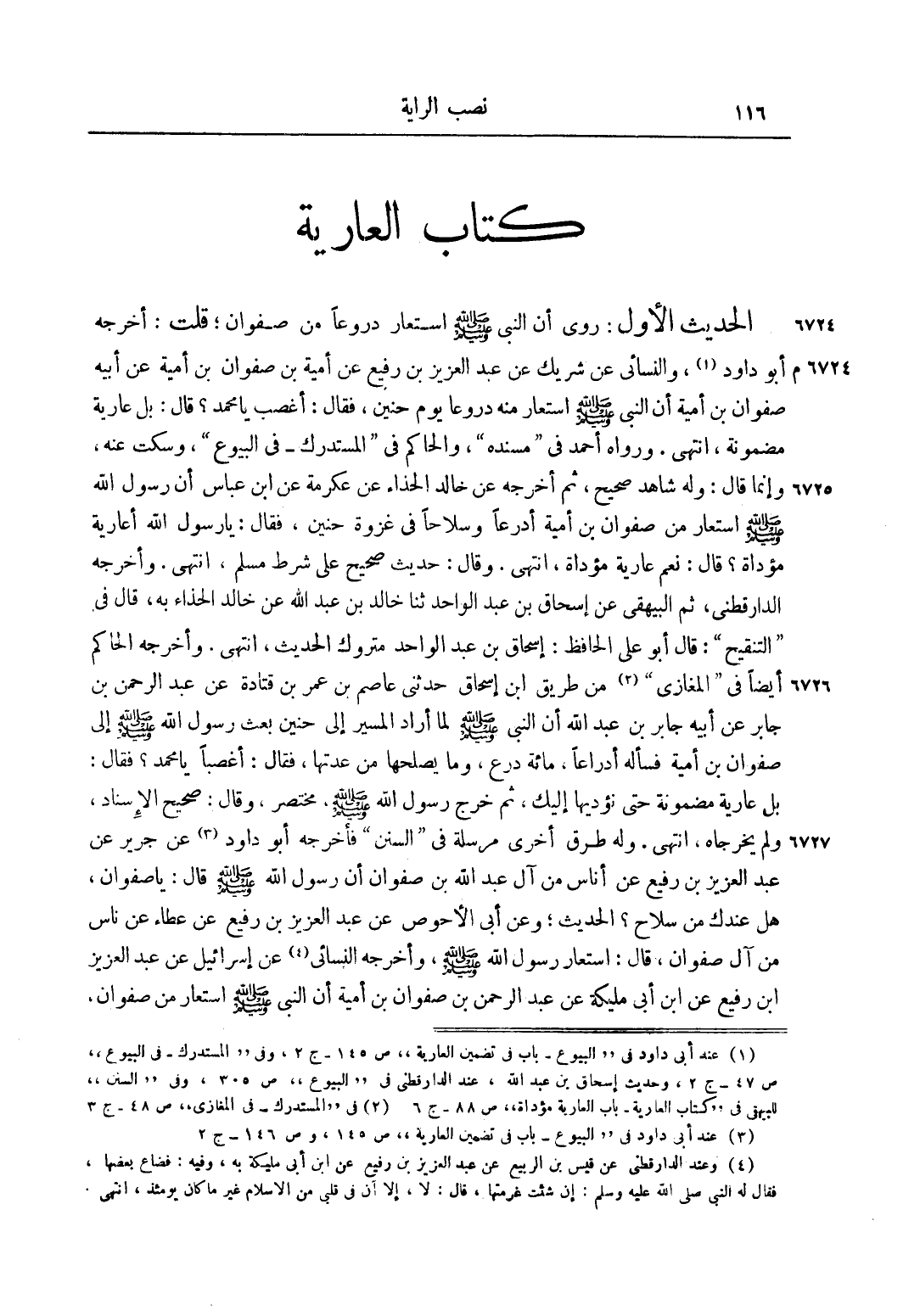 الْحَدِيثُ الْأَوَّلُ: رُوِيَ أَنَّ النَّبِيَّ صَلَّى اللَّهُ عَلَيْهِ وَسَلَّمَ اسْتَعَارَ دُرُوعًا مِنْ صَفْوَانَ، قُلْت: أَخْرَجَهُ أَبُو دَاوُد1 والنسائي عَنْ عَبْدِ الْعَزِيزِ بْنِ رُفَيْعٍ عَنْ أُمَيَّةَ بْنِ صَفْوَانَ بْنِ أُمَيَّةَ عَنْ أَبِيهِ صَفْوَانَ بْنِ أُمَيَّةَ أَنَّ النَّبِيَّ صَلَّى اللَّهُ عَلَيْهِ وَسَلَّمَ اسْتَعَارَ مِنْهُ دُرُوعًا يَوْمَ حُنَيْنٍ، فَقَالَ: أغصب يَا مُحَمَّدُ؟ قَالَ: "بَلْ عَارِيَّةٌ مَضْمُونَةٌ"، انْتَهَى. وَرَوَاهُ أَحْمَدُ فِي مُسْنَدِهِ، وَالْحَاكِمُ فِي الْمُسْتَدْرَكِ فِي الْبُيُوعِ، وَسَكَتَ عَنْهُ، وَإِنَّمَا قَالَ: وَلَهُ شَاهِدٌ صَحِيحٌ، ثُمَّ أَخْرَجَهُ عَنْ خَالِدٍ الْحَذَّاءِ عَنْ عِكْرِمَةَ عَنْ ابْنِ عَبَّاسٍ أَنَّ رَسُولَ اللَّهِ صَلَّى اللَّهُ عَلَيْهِ وَسَلَّمَ اسْتَعَارَ مِنْ صَفْوَانَ بْنِ أُمَيَّةَ أَدْرُعًا وَسِلَاحًا فِي غَزْوَةِ حُنَيْنٍ، فَقَالَ: يَا رَسُولَ اللَّهِ أَعَارِيَّةٌ مُؤَدَّاةٌ؟ قَالَ: "نَعَمْ عَارِيَّةٌ مُؤَدَّاةٌ"، انْتَهَى. وَقَالَ: حَدِيثٌ صَحِيحٌ عَلَى شَرْطِ مُسْلِمٍ، انْتَهَى. وَأَخْرَجَهُ الدَّارَقُطْنِيُّ، ثُمَّ الْبَيْهَقِيُّ عن إسحاق عن عَبْدِ الْوَاحِدِ ثَنَا خَالِدُ بْنُ عَبْدِ اللَّهِ عَنْ خَالِدٍ الْحَذَّاءِ، قَالَ فِي التَّنْقِيحِ: قَالَ أَبُو عَلِيٍّ الْحَافِظُ: إسْحَاقُ بْنُ عَبْدِ الْوَاحِدِ مَتْرُوكُ الْحَدِيثِ، انْتَهَى. وَأَخْرَجَهُ الْحَاكِمُ أَيْضًا فِي الْمَغَازِي2 مِنْ طَرِيقِ ابْنِ إسْحَاقَ حَدَّثَنِي عَاصِمُ بْنُ عُمَرَ بْنِ قَتَادَةَ عَنْ عَبْدِ الرَّحْمَنِ بْنِ جَابِرٍ عَنْ أَبِيهِ جَابِرِ بْنِ عَبْدِ اللَّهِ أَنَّ النَّبِيَّ صَلَّى اللَّهُ عَلَيْهِ وَسَلَّمَ لَمَّا أَرَادَ الْمَسِيرَ إلَى حُنَيْنٍ بَعَثَ رَسُولُ اللَّهِ صَلَّى اللَّهُ عَلَيْهِ وَسَلَّمَ إلَى صَفْوَانَ بْنِ أُمَيَّةَ فَسَأَلَهُ أَدْرَاعًا، مِائَةَ دِرْعٍ، وَمَا يُصْلِحُهَا مِنْ عُدَّتِهَا، فَقَالَ: أَغَصْبًا يَا مُحَمَّدُ؟ فَقَالَ: "بَلْ عَارِيَّةٌ مَضْمُونَةٌ حَتَّى نُؤَدِّيَهَا إلَيْك"، ثُمَّ خَرَجَ رَسُولُ اللَّهِ صَلَّى اللَّهُ عَلَيْهِ وَسَلَّمَ، مُخْتَصَرٌ، وَقَالَ: صَحِيحُ الْإِسْنَادِ، وَلَمْ يُخَرِّجَاهُ، انْتَهَى. وَلَهُ طَرِيقٌ أُخْرَى مُرْسَلَةٌ فِي السُّنَنِ فَأَخْرَجَهُ أَبُو دَاوُد3 عَنْ جَرِيرٍ عَنْ عَبْدِ الْعَزِيزِ بْنِ رُفَيْعٍ عَنْ أُنَاسٍ مِنْ آلِ عَبْدِ اللَّهِ بْنِ صَفْوَانَ أَنَّ رَسُولَ اللَّهِ صَلَّى اللَّهُ عَلَيْهِ وَسَلَّمَ قَالَ: "يَا صَفْوَانُ، هَلْ عِنْدَك مِنْ سِلَاحٍ"؟ الْحَدِيثَ، وَعَنْ أَبِي الْأَحْوَصِ عَنْ عَبْدِ الْعَزِيزِ بْنِ رُفَيْعٍ عَنْ عَطَاءٍ عَنْ نَاسٍ مِنْ آلِ صَفْوَانَ، قَالَ: اسْتَعَارَ رَسُولُ اللَّهِ صَلَّى اللَّهُ عَلَيْهِ وَسَلَّمَ، وَأَخْرَجَهُ النَّسَائِيّ4 عَنْ إسْرَائِيلَ عَنْ عَبْدِ الْعَزِيزِ بْنِ رُفَيْعٍ عَنْ ابْنِ أَبِي مُلَيْكَةَ عَنْ عَبْدِ الرَّحْمَنِ بْنِ صَفْوَانَ بْنِ أُمَيَّةَ أَنَّ النَّبِيَّ صَلَّى اللَّهُ عَلَيْهِ وَسَلَّمَ اسْتَعَارَ مِنْ صَفْوَانَ،