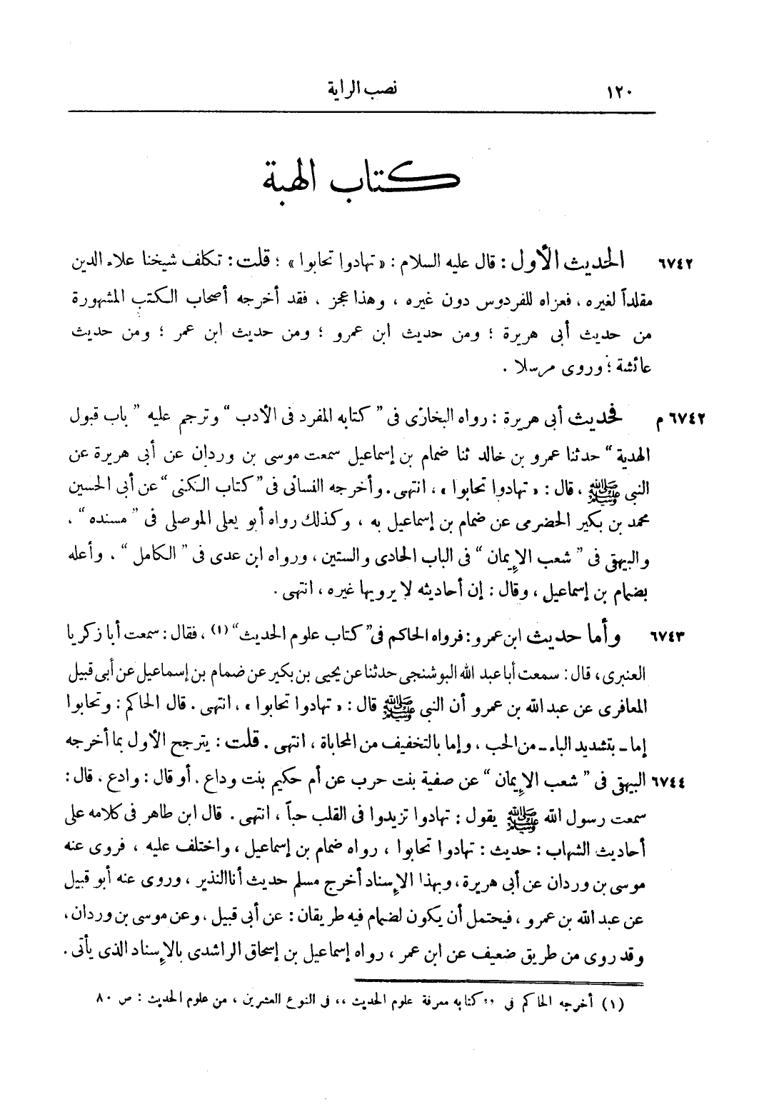 الْحَدِيثُ الْأَوَّلُ: قَالَ عليه السلام: "تَهَادَوْا تَحَابُّوا"، قُلْت تَكَلَّفَ شَيْخُنَا عَلَاءُ الدِّينِ مُقَلِّدًا لِغَيْرِهِ، فَعَزَاهُ لِلْفِرْدَوْسِ دُونَ غَيْرِهِ، وَهَذَا عَجْزٌ، فَقَدْ أَخْرَجَهُ أَصْحَابُ الْكُتُبِ الْمَشْهُورَةِ مِنْ حَدِيثِ أَبِي هُرَيْرَةَ، وَمِنْ حَدِيثِ ابْنِ عَمْرٍو، وَمِنْ حَدِيثِ ابْنِ عُمَرَ، وَمِنْ حَدِيثِ عَائِشَةَ، وَرُوِيَ مُرْسَلًا.