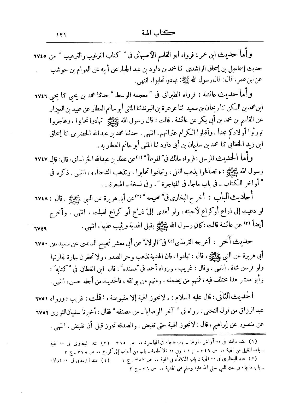 وَأَمَّا حَدِيثُ ابْنِ عُمَرَ: فَرَوَاهُ ابْنُ الْقَاسِمِ الْأَصْبَهَانِيُّ فِي كِتَابِ التَّرْغِيبِ وَالتَّرْهِيبِ مِنْ حَدِيثِ إسْمَاعِيلَ بْنِ إسْحَاقَ الرَّاشِدِيِّ ثَنَا مُحَمَّدُ بْنُ دَاوُد بْنُ عَبْدِ الْجَبَّارِ عَنْ أَبِيهِ عَنْ الْعَوَّامِ بْنِ حَوْشَبٍ عَنْ شَهْرِ بْنِ حَوْشَبٍ عَنْ ابْنِ عُمَرَ، قَالَ: قَالَ رَسُولُ الله صَلَّى اللَّهُ عَلَيْهِ وَسَلَّمَ: "تهادوا تحابو"، انْتَهَى.