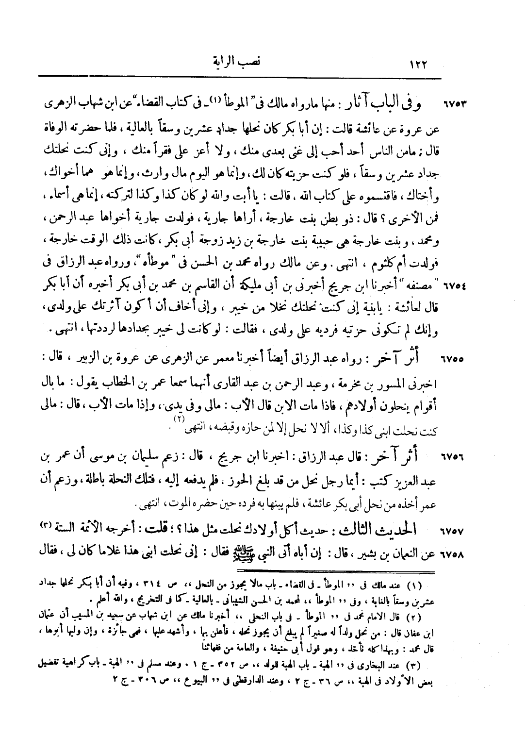 وَفِي الْبَابِ آثَارٌ: مِنْهَا مَا رَوَاهُ مَالِكٌ فِي الْمُوَطَّإِ1 فِي كِتَابِ الْقَضَاءِ عَنْ ابْنِ شِهَابٍ الزُّهْرِيِّ عَنْ عُرْوَةَ عَنْ عَائِشَةَ قَالَتْ: إنَّ أَبَا بَكْرٍ كَانَ نَحَلَهَا جِدَادَ عِشْرِينَ وَسْقًا بِالْعَالِيَةِ، فَلَمَّا حَضَرَتْهُ الْوَفَاةُ قَالَ: مَا مِنْ النَّاسِ أَحَدٌ أَحَبَّ إلَيَّ غِنًى بَعْدِي مِنْك، وَلَا أَعَزَّ عَلَيَّ فَقْرًا مِنْك، وَإِنِّي كُنْت نَحَلْتُك جِدَادَ عِشْرِينَ وَسْقًا، فلو كنت حزيته كَانَ لَك، وَإِنَّمَا هُوَ الْيَوْمَ مَالُ وَارِثٍ، وَإِنَّمَا هُوَ: هُمَا أَخَوَاك، وَأُخْتَاك، فَاقْتَسِمُوهُ عَلَى كِتَابِ اللَّهِ، قَالَتْ: يَا أَبَتِ وَاَللَّهِ لَوْ كَانَ كَذَا وَكَذَا لَتَرَكْته، إنَّمَا هِيَ أَسْمَاءُ، فَمَنْ الْأُخْرَى؟ قَالَ: ذُو بَطْنٍ بِنْتُ خَارِجَةَ، أَرَاهَا جَارِيَةً، فَوُلِدَتْ جَارِيَةً أَخَوَاهَا عَبْدُ الرَّحْمَنِ، وَمُحَمَّدٌ، وَبِنْتُ خَارِجَةَ هِيَ حَبِيبَةُ بِنْتُ خَارِجَةَ بْنِ زَيْدٍ زَوْجَةُ أَبِي بَكْرٍ، كَانَتْ ذَلِكَ الْوَقْتَ خَارِجَةٌ، فَوَلَدَتْ أُمَّ كُلْثُومٍ، انْتَهَى. وَعَنْ مَالِكٍ رَوَاهُ مُحَمَّدُ بْنُ الْحَسَنِ فِي مُوَطَّأَهُ، وَرَوَاهُ عَبْدُ الرَّزَّاقِ فِي مُصَنَّفِهِ أَخْبَرَنَا ابْنُ جُرَيْجٍ أَخْبَرَنِي ابْنُ أَبِي مُلَيْكَةَ أَنَّ الْقَاسِمَ بْنَ مُحَمَّدِ بْنِ أَبِي بَكْرٍ أَخْبَرَهُ أَنَّ أَبَا بَكْرٍ قَالَ لِعَائِشَةَ: يَا بُنَيَّةَ إنِّي كُنْت نَحَلْتُك نَخْلًا مِنْ خَيْبَرَ، وَإِنِّي أَخَافُ أَنْ أَكُونَ آثَرْتُك عَلَى وَلَدِي، وَإِنَّك لَمْ تكوني حزيته فَرُدِّيهِ عَلَى وَلَدِي، فَقَالَتْ: لَوْ كَانَتْ لِي خَيْبَرُ بجدادها لَرَدَدْتهَا، انْتَهَى.