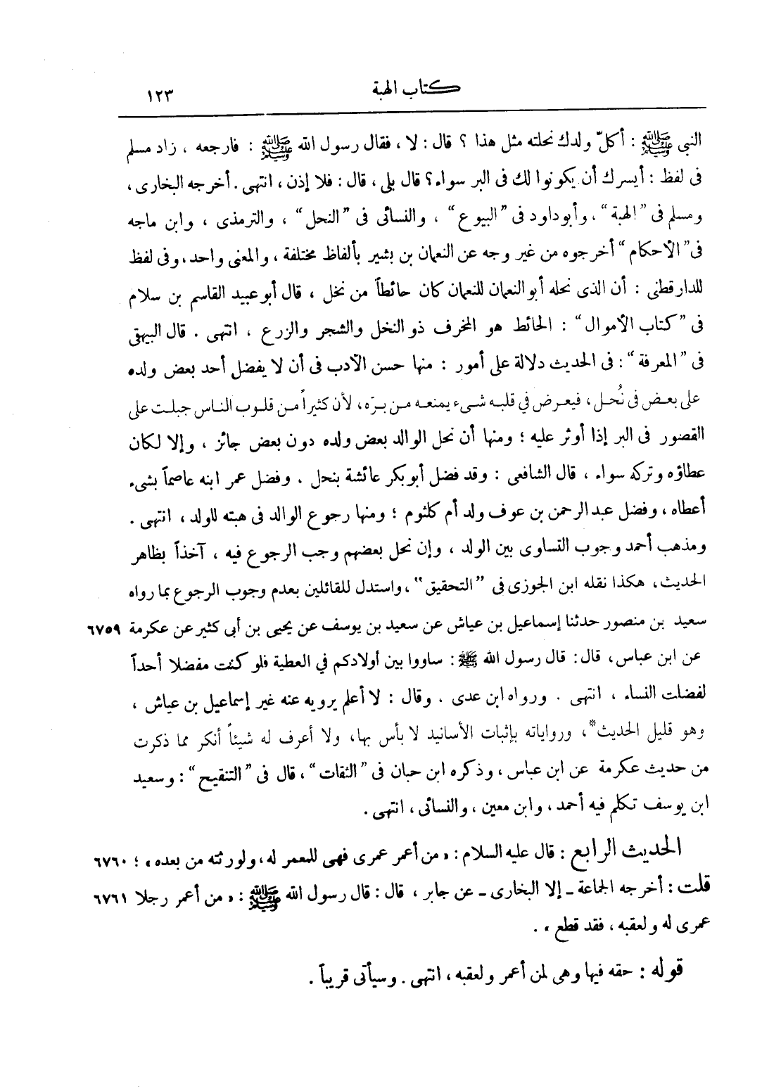 النَّبِيُّ صَلَّى اللَّهُ عَلَيْهِ وَسَلَّمَ: "أَكُلَّ وَلَدِك نَحَلْته مِثْلَ هَذَا"؟ قَالَ: لَا، فَقَالَ رَسُولُ اللَّهِ صَلَّى اللَّهُ عَلَيْهِ وَسَلَّمَ: "فَارْجِعْهُ"، زَادَ مُسْلِمٌ فِي لَفْظٍ: "أَيَسُرُّك أَنْ يَكُونُوا لَك فِي الْبِرِّ سَوَاءٌ"؟ قَالَ بَلَى، قال: "فلا إذن"، انْتَهَى. أَخْرَجَهُ الْبُخَارِيُّ، وَمُسْلِمٌ فِي الْهِبَةِ، وَأَبُو دَاوُد في االبيوع، وَالنَّسَائِيُّ فِي النِّحَلِ، وَالتِّرْمِذِيُّ، وَابْنُ مَاجَهْ فِي الْأَحْكَامِ أَخْرَجُوهُ مِنْ غَيْرِ وَجْهٍ عَنْ النُّعْمَانِ بْنِ بَشِيرٍ بِأَلْفَاظٍ مُخْتَلِفَةٍ، وَالْمَعْنَى وَاحِدٌ، وَفِي لَفْظٍ لِلدَّارَقُطْنِيِّ: أَنَّ الَّذِي نَحَلَهُ أَبُو النُّعْمَانِ لِلنُّعْمَانِ كَانَ حَائِطًا مِنْ نَخْلٍ، قَالَ أَبُو عُبَيْدٍ الْقَاسِمُ بْنُ سَلَّامٍ فِي كِتَابِ الْأَمْوَالِ: الْحَائِطُ هُوَ الْمُخَرَّفُ ذُو النَّخْلِ وَالشَّجَرِ وَالزَّرْعِ، انْتَهَى. قَالَ الْبَيْهَقِيُّ فِي الْمَعْرِفَةِ: فِي الْحَدِيثِ دَلَالَةٌ عَلَى أُمُورٍ: مِنْهَا حُسْنُ الْأَدَبِ فِي أَنْ لَا يُفَضِّلَ أَحَدَ بَعْضِ وَلَدِهِ عَلَى بَعْضٍ فِي كُلٍّ، فَيَعْرِضُ فِي قَلْبِهِ شَيْءٌ يَمْنَعُهُ مِنْ بِرِّهِ، لِأَنَّ كَثِيرًا مِنْ قُلُوبِ النَّاسِ جُبِلَتْ عَلَى الْقُصُورِ فِي الْبِرِّ إذَا أُوثِرَ عَلَيْهِ، وَمِنْهَا أَنَّ نَحْلَ الْوَالِدِ بَعْضَ وَلَدِهِ دُونَ بَعْضٍ جَائِزٌ، وَإِلَّا لَكَانَ عَطَاؤُهُ وَتَرْكُهُ سَوَاءٌ، قَالَ الشَّافِعِيُّ: وَقَدْ فَضَّلَ أَبُو بَكْرٍ عَائِشَةَ بِنِحَلٍ، وَفَضَّلَ عُمَرُ ابْنَهُ عَاصِمًا بِشَيْءٍ أَعْطَاهُ، وَفَضَّلَ عَبْدُ الرَّحْمَنِ بْنِ عَوْفٍ وَلَدَ أُمِّ كُلْثُومٍ، وَمِنْهَا رُجُوعُ الْوَالِدِ فِي هِبَتِهِ لِلْوَلَدِ، انْتَهَى. وَمَذْهَبُ أَحْمَدَ وُجُوبُ التَّسَاوِي بَيْنَ الْوَلَدِ، وَإِنْ نَحَلَ بَعْضَهُمْ وَجَبَ الرُّجُوعُ فِيهِ، أَخْذًا بِظَاهِرِ الْحَدِيثِ، هَكَذَا نَقَلَهُ ابْنُ الْجَوْزِيِّ فِي التَّحْقِيقِ، وَاسْتَدَلَّ لِلْقَائِلَيْنِ بِعَدَمِ وجوب الرجوع بِمَا رَوَاهُ سَعِيدُ بْنُ مَنْصُورٍ حَدَّثَنَا إسْمَاعِيلُ بْنُ عَيَّاشٍ عَنْ سَعِيدِ بْنِ يُوسُفَ عَنْ يَحْيَى بْنِ أَبِي كَثِيرٍ عَنْ عِكْرِمَةَ عَنْ ابْنِ عَبَّاسٍ، قَالَ: قَالَ رَسُولُ اللَّهِ صَلَّى اللَّهُ عَلَيْهِ وَسَلَّمَ: "سَاوُوا بَيْنَ أَوْلَادِكُمْ فِي الْعَطِيَّةِ، فَلَوْ كُنْتُ مُفَضِّلًا أَحَدًا لَفَضَّلْتُ النِّسَاءَ"، انْتَهَى. وَرَوَاهُ ابْنُ عَدِيٍّ، وَقَالَ: لَا أَعْلَمُ يَرْوِيهِ عَنْهُ غَيْرُ إسْمَاعِيلَ بْنَ عَيَّاشٍ، وَهُوَ قَلِيلُ الْحَدِيثِ، وَرِوَايَاتُهُ بِإِثْبَاتِ الْأَسَانِيدِ لَا بَأْسَ بِهَا، وَلَا أَعْرِفُ لَهُ شَيْئًا أَنْكَرُ مِمَّا ذَكَرْت مِنْ حَدِيثِ عِكْرِمَةَ عَنْ ابْنِ عَبَّاسٍ، وَذَكَرَهُ ابْنُ حِبَّانَ فِي الثِّقَاتِ، قَالَ فِي التَّنْقِيحِ: وَسَعِيدُ بْنُ يُوسُفَ تَكَلَّمَ فِيهِ أَحْمَدُ، وَابْنُ مَعِينٍ، وَالنَّسَائِيُّ، انْتَهَى.