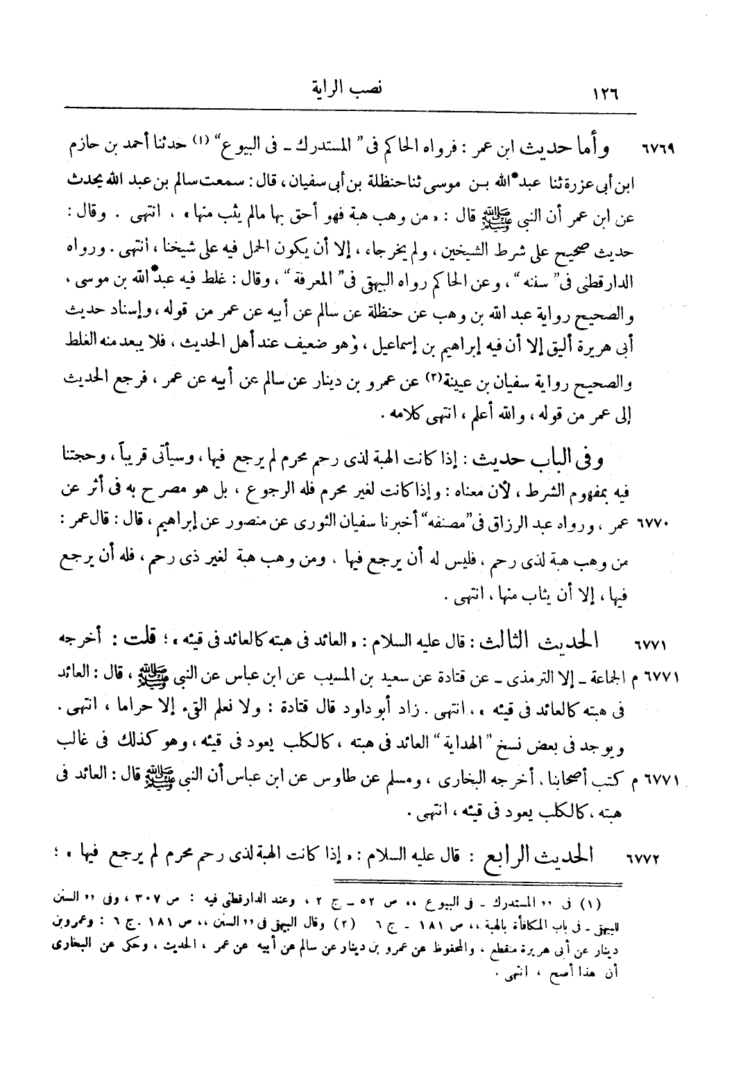 وَأَمَّا حَدِيثُ ابْنِ عُمَرَ: فَرَوَاهُ الْحَاكِمُ فِي الْمُسْتَدْرَكِ فِي الْبُيُوعِ1 حَدَّثَنَا أَحْمَدُ بْنُ حَازِمِ بْنِ أَبِي عَزْرَةَ ثَنَا عَبْدُ اللَّهِ بْنُ مُوسَى ثَنَا حَنْظَلَةُ بْنُ أَبِي سُفْيَانَ، قَالَ: سَمِعْت سَالِمَ بْنَ عَبْدِ اللَّهِ يُحَدِّثُ عَنْ ابْنِ عُمَرَ أَنَّ النَّبِيَّ صَلَّى اللَّهُ عَلَيْهِ وَسَلَّمَ قَالَ: "مَنْ وَهَبَ هِبَةً فَهُوَ أَحَقُّ بِهَا مَا لَمْ يُثَبْ مِنْهَا"، انْتَهَى. وَقَالَ: حَدِيثٌ صَحِيحٌ عَلَى شَرْطِ الشَّيْخَيْنِ، وَلَمْ يُخَرِّجَاهُ، إلَّا أَنْ يَكُونَ الْحَمْلُ فِيهِ عَلَى شَيْخِنَا، انْتَهَى. وَرَوَاهُ الدَّارَقُطْنِيُّ فِي سُنَنِهِ، وَعَنْ الْحَاكِمِ رَوَاهُ الْبَيْهَقِيُّ فِي الْمَعْرِفَةِ، وَقَالَ: غَلِطَ فِيهِ عَبْدُ اللَّهِ بْنُ مُوسَى، وَالصَّحِيحُ رِوَايَةُ عَبْدِ اللَّهِ بْنِ وَهْبٍ عَنْ حَنْظَلَةَ عَنْ سَالِمٍ عَنْ أَبِيهِ عَنْ عُمَرَ مِنْ قَوْلِهِ، وَإِسْنَادُ حَدِيثِ أَبِي هُرَيْرَةَ أَلْيَقُ إلَّا أَنَّ فِيهِ إبْرَاهِيمَ بْنَ إسْمَاعِيلَ، وَهُوَ ضَعِيفٌ عِنْدَ أَهْلِ الْحَدِيثِ، فَلَا يَبْعُدُ مِنْهُ الْغَلَطُ وَالصَّحِيحُ رِوَايَةُ سُفْيَانَ بْنِ عُيَيْنَةَ2 عَنْ عَمْرِو بْنِ دِينَارٍ عَنْ سَالِمٍ عَنْ أَبِيهِ عَنْ عُمَرَ، فَرَجَعَ الْحَدِيثُ إلَى عُمَرَ مِنْ قَوْلِهِ، وَاَللَّهُ أَعْلَمُ، انْتَهَى كَلَامُهُ.