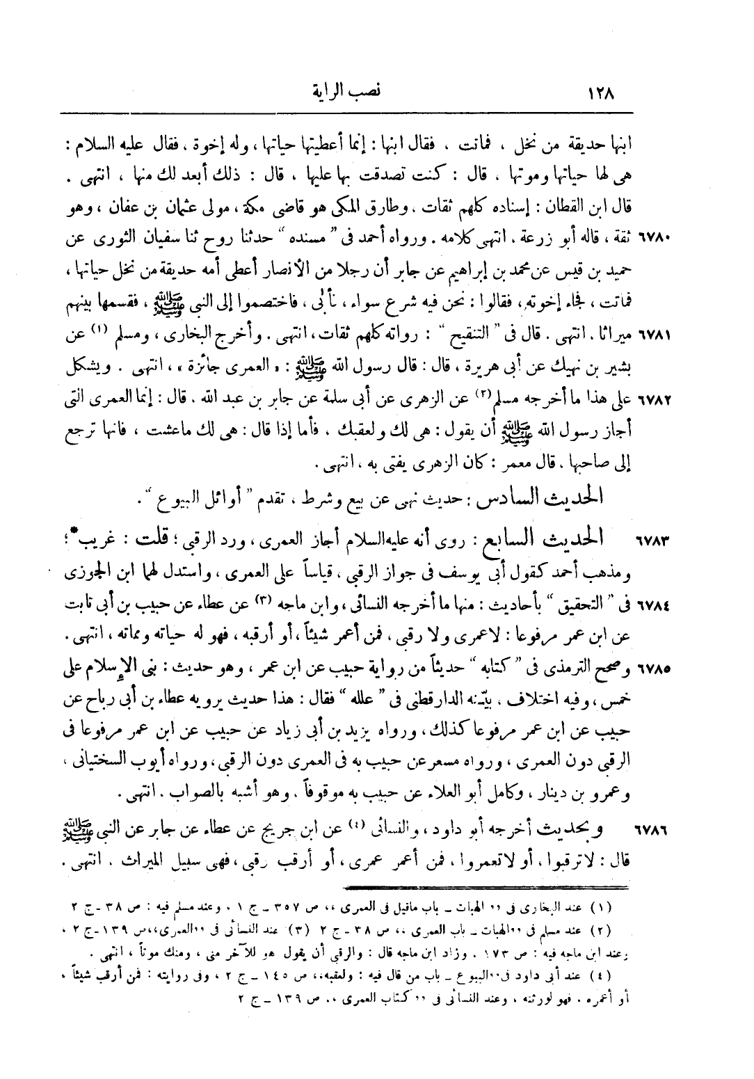 الْحَدِيثُ السَّابِعُ: رُوِيَ أَنَّهُ عليه السلام أَجَازَ الْعُمْرَى، وَرَدَّ الرُّقْبَى، قُلْت: غَرِيبٌ، وَمَذْهَبُ أَحْمَدَ كَقَوْلِ أَبِي يُوسُفَ فِي جَوَازِ الرُّقْبَى، قِيَاسًا عَلَى الْعُمْرَى، وَاسْتَدَلَّ لَهُمَا ابْنُ الْجَوْزِيِّ فِي التَّحْقِيقِ بِأَحَادِيثَ: مِنْهَا مَا أَخْرَجَهُ النَّسَائِيُّ، وَابْنُ مَاجَهْ3 عَنْ عَطَاءٍ عَنْ حَبِيبِ بْنِ أَبِي ثَابِتٍ عَنْ ابْنِ عُمَرَ مَرْفُوعًا: لَا عُمْرَى وَلَا رُقْبَى، فَمَنْ أَعْمَرَ شَيْئًا، أَوْ أَرْقَبَهُ، فَهُوَ لَهُ حَيَاتَهُ وَمَمَاتَهُ، انْتَهَى. وَصَحَّحَ التِّرْمِذِيُّ فِي كِتَابِهِ حَدِيثًا مِنْ رِوَايَةِ حَبِيبٍ عَنْ ابْنِ عُمَرَ، وَهُوَ حَدِيثُ: بُنِيَ الْإِسْلَامُ عَلَى خَمْسٍ، وَفِيهِ اخْتِلَافٌ، بَيَّنَهُ الدَّارَقُطْنِيُّ فِي عِلَلِهِ فَقَالَ: هَذَا حَدِيثٌ يَرْوِيه عَطَاءُ بْنُ أَبِي رَبَاحٍ عَنْ حَبِيبٍ عَنْ ابْنِ عُمَرَ مَرْفُوعًا كَذَلِكَ، وَرَوَاهُ يَزِيدُ بْنُ أَبِي زِيَادٍ عَنْ حَبِيبٍ عَنْ ابْنِ عُمَرَ مَرْفُوعًا فِي الرُّقْبَى دُونَ الْعُمْرَى، وَرَوَاهُ مِسْعَرٌ عَنْ حَبِيبٍ بِهِ فِي الْعُمْرَى دُونَ الرُّقْبَى، وَرَوَاهُ أَيُّوبُ السِّخْتِيَانِيُّ، وَعَمْرُو بْنُ دِينَارٍ، وَكَامِلٌ أَبُو الْعَلَاءِ عَنْ حَبِيبٍ بِهِ مَوْقُوفًا، وَهُوَ أَشْبَهُ بِالصَّوَابِ، انْتَهَى.