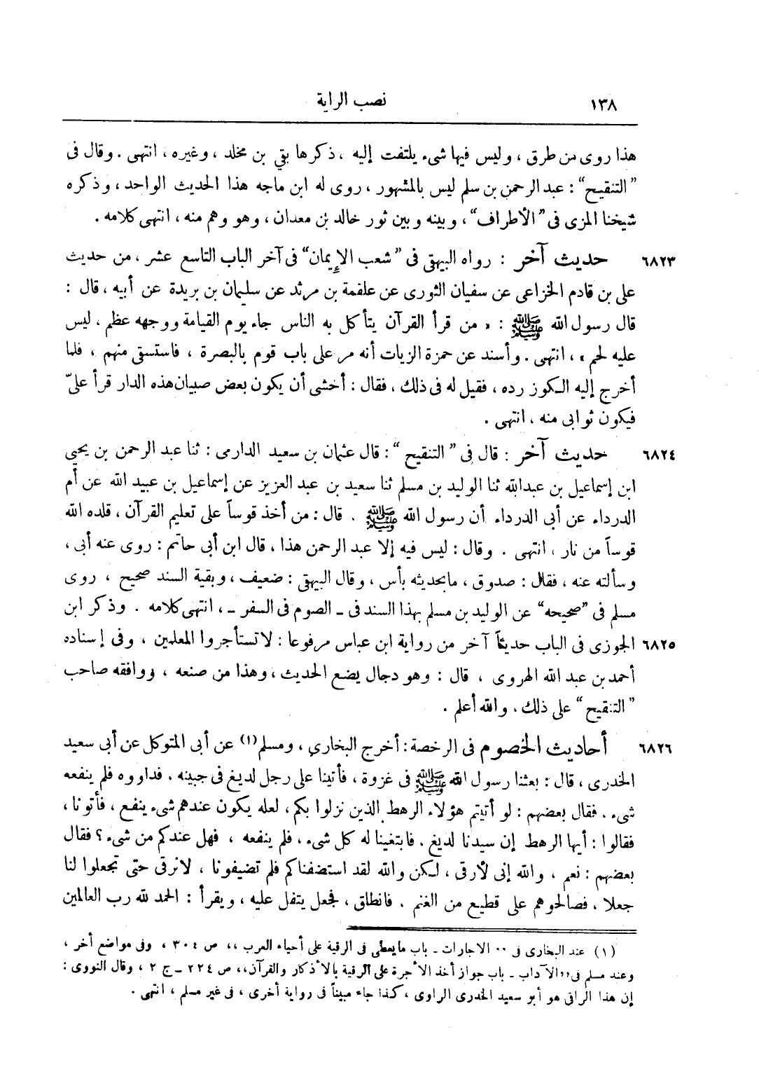 حَدِيثٌ آخَرُ: قَالَ فِي: التَّنْقِيحِ: قَالَ عُثْمَانُ بْنُ سَعِيدٍ الدَّارِمِيُّ: ثَنَا عَبْدُ الرَّحْمَنِ بْنُ يَحْيَى بْنِ إسْمَاعِيلَ بْنِ عَبْدِ اللَّهِ ثَنَا الْوَلِيدُ بْنُ مُسْلِمٍ ثَنَا سَعِيدُ بْنُ عَبْدِ الْعَزِيزِ عَنْ إسْمَاعِيلَ بْنِ عُبَيْدِ اللَّهِ عَنْ أُمِّ الدَّرْدَاءِ عَنْ أَبِي الدَّرْدَاءِ أَنَّ رَسُولَ اللَّهِ صَلَّى اللَّهُ عَلَيْهِ وَسَلَّمَ، قَالَ: "مَنْ أَخَذَ قَوْسًا عَلَى تَعْلِيمِ الْقُرْآنِ، قَلَّدَهُ اللَّهُ قَوْسًا مِنْ نَارٍ"، انْتَهَى. وَقَالَ: لَيْسَ فِيهِ إلَّا عَبْدُ الرَّحْمَنِ هَذَا، قَالَ ابْنُ أَبِي حَاتِمٍ: رُوِيَ عَنْهُ أَبِي، وَسَأَلْته عَنْهُ، فَقَالَ: صَدُوقٌ، مَا بِحَدِيثِهِ بَأْسٌ، وَقَالَ الْبَيْهَقِيُّ: ضَعِيفٌ، وَبَقِيَّةُ السَّنَدِ صَحِيحٌ، رَوَى مُسْلِمٌ فِي صَحِيحِهِ عَنْ الْوَلِيدِ بْنِ مُسْلِمٍ بِهَذَا السَّنَدِ فِي الصَّوْمِ فِي السَّفَرِ، انْتَهَى كَلَامُهُ. وَذَكَرَ ابْنُ الْجَوْزِيِّ فِي الْبَابِ حَدِيثًا آخَرَ مِنْ رِوَايَةِ ابْنِ عَبَّاسٍ مَرْفُوعًا: " لَا تَسْتَأْجِرُوا الْمُعَلِّمِينَ"، وَفِي إسْنَادِهِ أَحْمَدُ بْنُ عَبْدِ اللَّهِ الْهَرَوِيُّ، قَالَ: وَهُوَ دَجَّالٌ يَضَعُ الْحَدِيثَ، وَهَذَا مِنْ صُنْعِهِ، وَوَافَقَهُ صَاحِبُ التَّنْقِيحِ عَلَى ذَلِكَ، وَاَللَّهُ أَعْلَمُ.