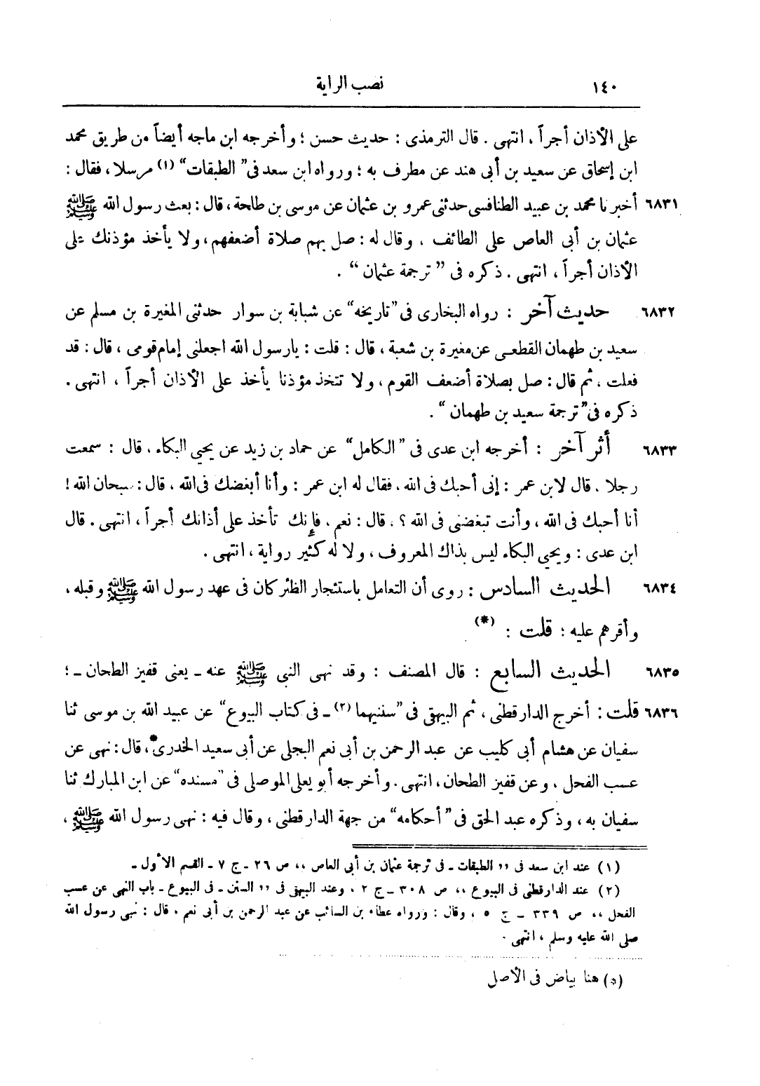 عَلَى الْأَذَانِ أَجْرًا، انْتَهَى. قَالَ التِّرْمِذِيُّ: حَدِيثٌ حَسَنٌ، وَأَخْرَجَهُ ابْنُ مَاجَهْ أَيْضًا مِنْ طَرِيقِ مُحَمَّدِ بْنِ إسْحَاقَ عَنْ سَعِيدِ بْنِ أَبِي هِنْدٍ عَنْ مُطَرِّفٍ بِهِ، وَرَوَاهُ ابْنُ سَعْدٍ فِي الطَّبَقَاتِ1 مُرْسَلًا، فَقَالَ: أَخْبَرَنَا مُحَمَّدُ بْنُ عُبَيْدٍ الطَّنَافِسِيُّ حَدَّثَنِي عَمْرُو بْنُ عُثْمَانَ عَنْ مُوسَى بْنُ طَلْحَةَ، قَالَ: بَعَثَ رَسُولُ اللَّهِ صَلَّى اللَّهُ عَلَيْهِ وَسَلَّمَ عُثْمَانَ بْنَ أَبِي الْعَاصِ عَلَى الطَّائِفِ، وَقَالَ لَهُ: "صَلِّ بِهِمْ صَلَاةَ أَضْعَفِهِمْ، وَلَا يَأْخُذُ مُؤَذِّنُك عَلَى الْأَذَانِ أَجْرًا"، انْتَهَى. ذَكَرَهُ فِي تَرْجَمَةِ عُثْمَانَ.