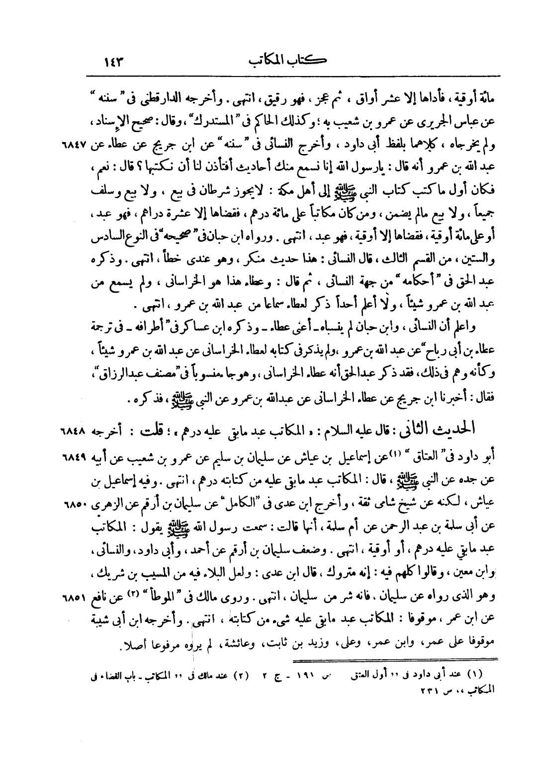 مِائَةِ أُوقِيَّةٍ، فَأَدَّاهَا إلَّا عَشْرَ أَوَاقٍ، ثُمَّ عَجَزَ، فَهُوَ رَقِيقٌ"، انْتَهَى. وَأَخْرَجَهُ الدَّارَقُطْنِيُّ فِي سُنَنِهِ عَنْ عَبَّاسٍ الْجُرَيْرِيِّ عَنْ عَمْرِو بْنِ شُعَيْبٍ بِهِ، وَكَذَلِكَ الْحَاكِمُ فِي الْمُسْتَدْرَكِ، وَقَالَ: صَحِيحُ الْإِسْنَادِ، وَلَمْ يُخَرِّجَاهُ، كِلَاهُمَا بِلَفْظِ أَبِي دَاوُد، وَأَخْرَجَ النَّسَائِيُّ فِي سُنَنِهِ عَنْ ابْنِ جُرَيْجٍ عَنْ عَطَاءٍ عَنْ عَبْدِ اللَّهِ بْنِ عَمْرٍو أَنَّهُ قَالَ: يَا رَسُولَ اللَّهِ إنَّا نَسْمَعُ مِنْك أَحَادِيثَ أَفَتَأْذَنُ لَنَا أَنْ نَكْتُبَهَا؟ قَالَ: "نَعَمْ"، فَكَانَ أَوَّلُ مَا كَتَبَ كِتَابَ النَّبِيِّ صَلَّى اللَّهُ عَلَيْهِ وَسَلَّمَ إلَى أَهْلِ مَكَّةَ: لَا يَجُوزُ شَرْطَانِ فِي بَيْعٍ، وَلَا بَيْعٌ وَسَلَفٌ جَمِيعًا، وَلَا بَيْعُ مَا لَمْ يُضْمَنْ، وَمَنْ كَانَ مُكَاتَبًا عَلَى مِائَةِ دِرْهَمٍ، فَقَضَاهَا إلَّا عَشَرَةَ دَرَاهِمَ، فَهُوَ عَبْدٌ، أَوْ عَلَى مِائَةِ أُوقِيَّةٍ، فَقَضَاهَا إلَّا أُوقِيَّةً، فَهُوَ عَبْدٌ، انْتَهَى. وَرَوَاهُ ابْنُ حِبَّانَ فِي صَحِيحِهِ فِي النَّوْعِ السَّادِسِ وَالسِّتِّينَ، مِنْ الْقِسْمِ الثَّالِثِ، قَالَ النَّسَائِيُّ: هَذَا حَدِيثٌ مُنْكَرٌ، وَهُوَ عِنْدِي خَطَأٌ، انْتَهَى. وَذَكَرَهُ عَبْدُ الْحَقِّ فِي أَحْكَامِهِ مِنْ جِهَةِ النَّسَائِيّ، ثُمَّ قَالَ: وَعَطَاءٌ هَذَا هُوَ الْخُرَاسَانِيُّ، وَلَمْ يَسْمَعْ مِنْ عَبْدِ اللَّهِ بْنِ عَمْرٍو شَيْئًا، وَلَا أَعْلَمُ أَحَدًا ذَكَرَ لِعَطَاءٍ سَمَاعًا مِنْ عَبْدِ اللَّهِ بْنِ عَمْرٍو، انْتَهَى.