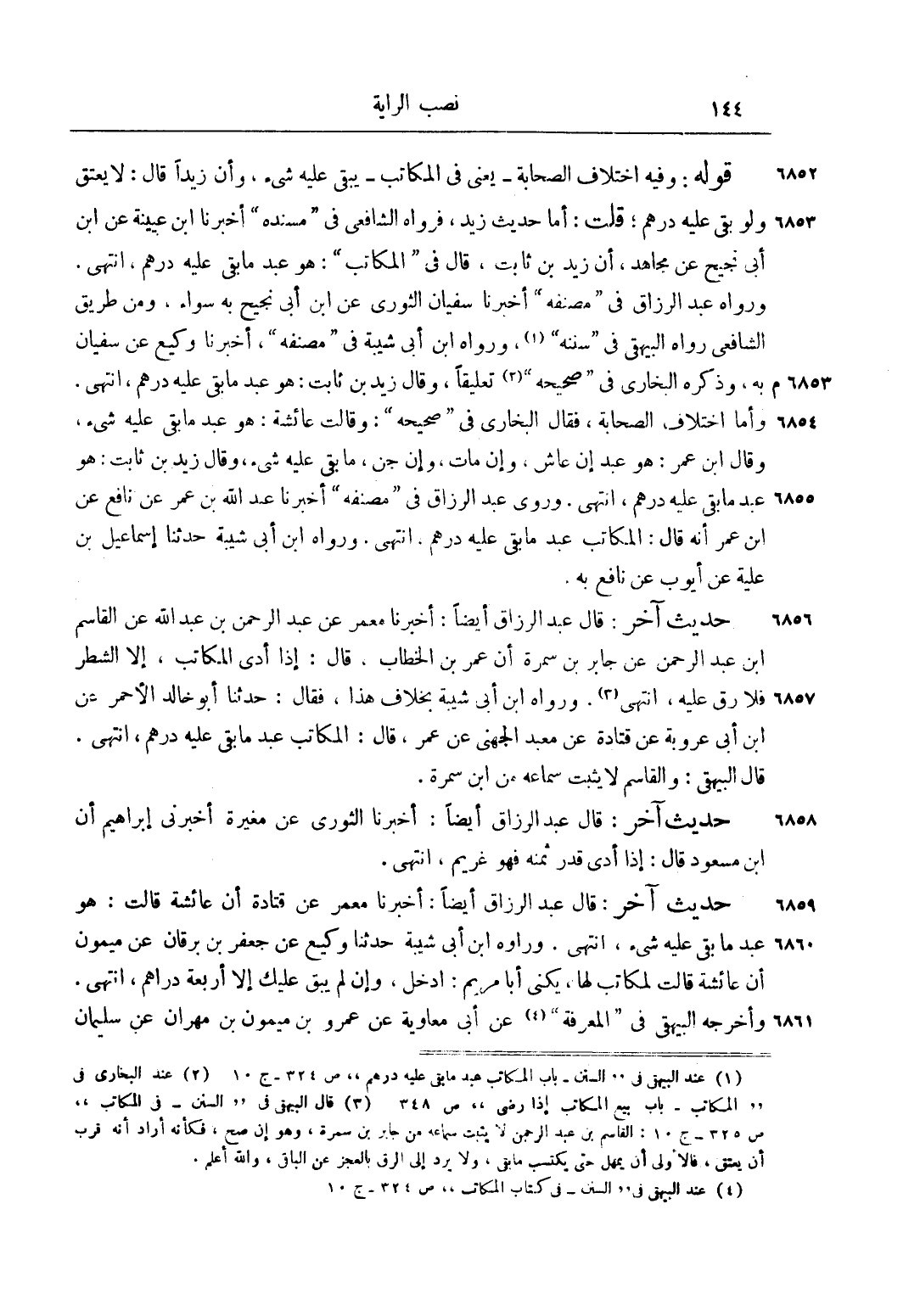 قَوْلُهُ: وَفِيهِ اخْتِلَافُ الصَّحَابَةِ يَعْنِي فِي الْمُكَاتَبِ يَبْقَى عَلَيْهِ شَيْءٌ، وَأَنَّ زَيْدًا قَالَ: لَا يُعْتَقُ وَلَوْ بَقِيَ عَلَيْهِ دِرْهَمٌ، قُلْت: أَمَّا حَدِيثُ زَيْدٍ، فَرَوَاهُ الشَّافِعِيُّ فِي مُسْنَدِهِ أَخْبَرَنَا ابْنُ عُيَيْنَةَ عَنْ ابْنِ أَبِي نَجِيحٍ عَنْ مُجَاهِدٍ، أَنَّ زَيْدَ بْنَ ثَابِتٍ، قَالَ فِي الْمُكَاتَبِ: هُوَ عَبْدٌ مَا بَقِيَ عَلَيْهِ دِرْهَمٌ، انْتَهَى. وَرَوَاهُ عَبْدُ الرَّزَّاقِ فِي مُصَنَّفِهِ أَخْبَرَنَا سُفْيَانُ الثَّوْرِيُّ عَنْ ابْنِ أَبِي نَجِيحٍ بِهِ سَوَاءٌ، وَمِنْ طَرِيقِ الشَّافِعِيِّ رَوَاهُ الْبَيْهَقِيُّ فِي سُنَنِهِ1 وَرَوَاهُ ابْنُ أَبِي شَيْبَةَ فِي مُصَنَّفِهِ، أَخْبَرَنَا وَكِيعٌ عَنْ سُفْيَانَ بِهِ، وَذَكَرَهُ الْبُخَارِيُّ فِي صَحِيحِهِ2 تَعْلِيقًا، وَقَالَ زَيْدُ بْنُ ثَابِتٍ: هُوَ عَبْدٌ مَا بَقِيَ عَلَيْهِ دِرْهَمٌ، انْتَهَى. وَأَمَّا اخْتِلَافُ الصَّحَابَةِ، فَقَالَ الْبُخَارِيُّ فِي صَحِيحِهِ: وَقَالَتْ عَائِشَةُ: هُوَ عَبْدٌ مَا بَقِيَ عَلَيْهِ شَيْءٌ، وَقَالَ ابْنُ عُمَرَ: هُوَ عَبْدٌ إنْ عَاشَ، وَإِنْ مَاتَ، وَإِنْ جُنَّ، مَا بَقِيَ عَلَيْهِ شَيْءٌ، وَقَالَ زَيْدُ بْنُ ثَابِتٍ: هُوَ عَبْدٌ مَا بَقِيَ عَلَيْهِ دِرْهَمٌ، انْتَهَى. وَرَوَى عَبْدُ الرَّزَّاقِ فِي مُصَنَّفِهِ أَخْبَرَنَا عَبْدُ اللَّهِ بْنُ عُمَرَ عَنْ نَافِعٍ عَنْ ابْنِ عُمَرَ أَنَّهُ قَالَ: الْمُكَاتَبُ عَبْدٌ مَا بَقِيَ عَلَيْهِ دِرْهَمٌ، انْتَهَى. وَرَوَاهُ ابْنُ أَبِي شَيْبَةَ حَدَّثَنَا إسْمَاعِيلُ ابْنُ عُلَيَّةَ عَنْ أَيُّوبَ عَنْ نَافِعٍ بِهِ.