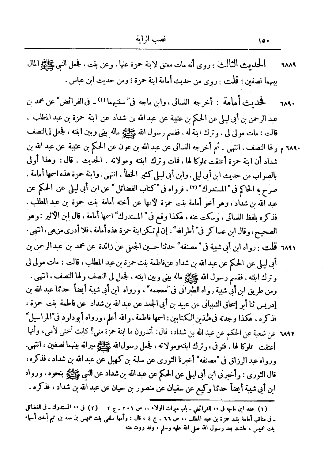 فَحَدِيثُ أُمَامَةَ: أَخْرَجَهُ النَّسَائِيُّ، وَابْنُ مَاجَهْ فِي سُنَنَيْهِمَا1 فِي الْفَرَائِضِ عَنْ مُحَمَّدِ بْنِ عَبْدِ الرَّحْمَنِ بْنِ أَبِي لَيْلَى عَنْ الْحَكَمِ بْنِ عُتَيْبَةَ عَنْ عَبْدِ اللَّهِ بْنِ شَدَّادٍ عَنْ ابْنَةِ حَمْزَةَ بْنِ عَبْدِ الْمُطَّلِبِ، قَالَتْ: مَاتَ مَوْلًى لِي، وَتَرَكَ ابْنَةً لَهُ، فَقَسَّمَ رَسُولُ اللَّهِ صَلَّى اللَّهُ عَلَيْهِ وَسَلَّمَ مَالَهُ بَيْنِي وَبَيْنَ ابْنَتِهِ، فَجَعَلَ لِي النِّصْفَ وَلَهَا النِّصْفَ، انْتَهَى. ثُمَّ أَخْرَجَهُ النَّسَائِيُّ عَنْ عَبْدِ اللَّهِ بْنِ عَوْنٍ عَنْ الْحَكَمِ بْنِ عُتَيْبَةَ عَنْ عَبْدِ اللَّهِ بْنِ شَدَّادٍ أَنَّ ابْنَةَ حَمْزَةَ أَعْتَقَتْ مَمْلُوكًا لَهَا، فَمَاتَ وَتَرَكَ ابْنَتَهُ وَمَوْلَاتَهُ، الْحَدِيثَ. قَالَ: وَهَذَا أَوْلَى بِالصَّوَابِ مِنْ حَدِيثِ ابْنِ أَبِي لَيْلَى، وَابْنُ أَبِي لَيْلَى كَثِيرُ الْخَطَإِ، انْتَهَى. وَابْنَةُ حَمْزَةَ هذا اسْمُهَا أُمَامَةُ، صَرَّحَ بِهِ الْحَاكِمُ فِي الْمُسْتَدْرَكِ2 فَرَوَاهُ فِي كِتَابِ الْفَضَائِلِ عَنْ ابْنِ أَبِي لَيْلَى عَنْ الْحَكَمِ عَنْ عَبْدِ اللَّهِ بْنِ شَدَّادٍ، وَهُوَ أَخُو أُمَامَةَ بِنْتِ حَمْزَةَ لِأُمِّهَا عَنْ أُخْتِهِ أُمَامَةَ بِنْتِ حَمْزَةَ بْنِ عَبْدِ الْمُطَّلِبِ، فَذَكَرَهُ بِلَفْظِ النَّسَائِيّ، وَسَكَتَ عَنْهُ، هَكَذَا وَقَعَ فِي الْمُسْتَدْرَكِ اسْمُهَا أُمَامَةُ، قَالَ ابْنُ الْأَثِيرِ: وَهُوَ الصَّحِيحُ، وَقَالَ ابْنُ عَسَاكِرَ فِي أَطْرَافِهِ: إنْ لَمْ تَكُنْ ابْنَةُ حَمْزَةَ هَذِهِ أُمَامَةَ، فَلَا أَدْرِي مَنْ هِيَ، انْتَهَى. قُلْت: رَوَاهُ ابْنُ أَبِي شَيْبَةَ فِي مُصَنَّفِهِ حَدَّثَنَا حُسَيْنٌ الْجُعْفِيُّ عَنْ زَائِدَةَ عَنْ مُحَمَّدِ بْنِ عَبْدِ الرَّحْمَنِ بْنِ أَبِي لَيْلَى عَنْ الْحَكَمِ عَنْ عَبْدِ اللَّهِ بْنِ شَدَّادٍ عَنْ فَاطِمَةَ بِنْتِ حَمْزَةَ بْنِ عَبْدِ الْمُطَّلِبِ، قَالَتْ: مَاتَ مَوْلًى لِي وَتَرَكَ ابْنَتَهُ، فَقَسَّمَ رَسُولُ اللَّهِ صَلَّى اللَّهُ عَلَيْهِ وَسَلَّمَ مَالَهُ بَيْنِي وَبَيْنَ ابْنَتِهِ، فَجَعَلَ لِي النِّصْفَ وَلَهَا النِّصْفَ، انْتَهَى. وَمِنْ طَرِيقِ ابْنِ أَبِي شَيْبَةَ رَوَاهُ الطَّبَرَانِيُّ فِي مُعْجَمِهِ، وَرَوَاهُ ابْنُ أَبِي شَيْبَةَ أَيْضًا حَدَّثَنَا عَبْدُ اللَّهِ بْنُ إدْرِيسَ ثَنَا أَبُو إسْحَاقَ الشَّيْبَانِيُّ عَنْ عُبَيْدِ بْنِ أَبِي الْجَعْدِ عَنْ عَبْدِ اللَّهِ بْنِ شَدَّادٍ عَنْ فَاطِمَةَ بِنْتِ حَمْزَةَ، فَذَكَرَهُ، هَكَذَا وَجَدْته فِي هَذَيْنِ الْكِتَابَيْنِ: اسْمُهَا فَاطِمَةُ، وَاَللَّهُ أَعْلَمُ، وَرَوَاهُ أَبُو دَاوُد فِي الْمَرَاسِيلِ عَنْ شُعْبَةَ عَنْ الْحَكَمِ عَنْ عَبْدِ اللَّهِ بْنِ شَدَّادٍ، قَالَ: أَتَدْرُونَ مَا ابْنَةُ حَمْزَةَ؟ كَانَتْ أُخْتِي لِأُمِّي، وَأَنَّهَا لَأَعْتَقَتْ مَمْلُوكًا لَهَا، فَتُوُفِّيَ، وَتَرَكَ ابْنَتَهُ وَمَوْلَاتَهُ، فَجَعَلَ رَسُولُ اللَّهِ صَلَّى اللَّهُ عَلَيْهِ وَسَلَّمَ مِيرَاثَهُ بَيْنَهُمَا نِصْفَيْنِ، انْتَهَى. وَرَوَاهُ عَبْدُ الرَّزَّاقِ فِي مُصَنَّفِهِ أَخْبَرَنَا الثَّوْرِيُّ عَنْ سَلَمَةَ بْنِ كُهَيْلٍ عَنْ عَبْدِ اللَّهِ بْنِ شَدَّادٍ، فَذَكَرَهُ، قَالَ الثَّوْرِيُّ: وَأَخْبَرَنِي ابْنُ أَبِي لَيْلَى عَنْ الْحَكَمِ عَنْ عَبْدِ اللَّهِ بْنِ شَدَّادٍ عَنْ النَّبِيِّ صَلَّى اللَّهُ عَلَيْهِ وَسَلَّمَ بِنَحْوِهِ، وَرَوَاهُ ابْنُ أَبِي شَيْبَةَ أَيْضًا حَدَّثَنَا وَكِيعٌ عَنْ سُفْيَانَ عَنْ مَنْصُورِ بْنِ حَيَّانٍ عَنْ عَبْدِ اللَّهِ بْنِ شَدَّادٍ، فَذَكَرَهُ.