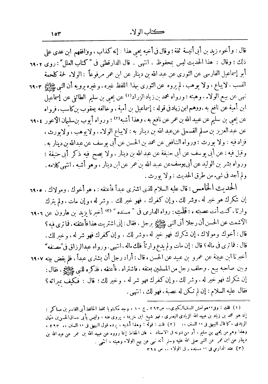 2 قلت: قوله: وهذا أشبه، يرده قول البيهقي في السنن293، وهذا وهم من يحيى بن سليم، أو من دونه في الإسناد، فإن الحفاظ إنما رووه عن عبيد الله بن عمر عن عبد الله ابن دينار عن ابن عمر عن النبي صَلَّى اللَّهُ عَلَيْهِ وَسَلَّمَ أنه نهى عن بيع الولاء وهبته، انتهى.