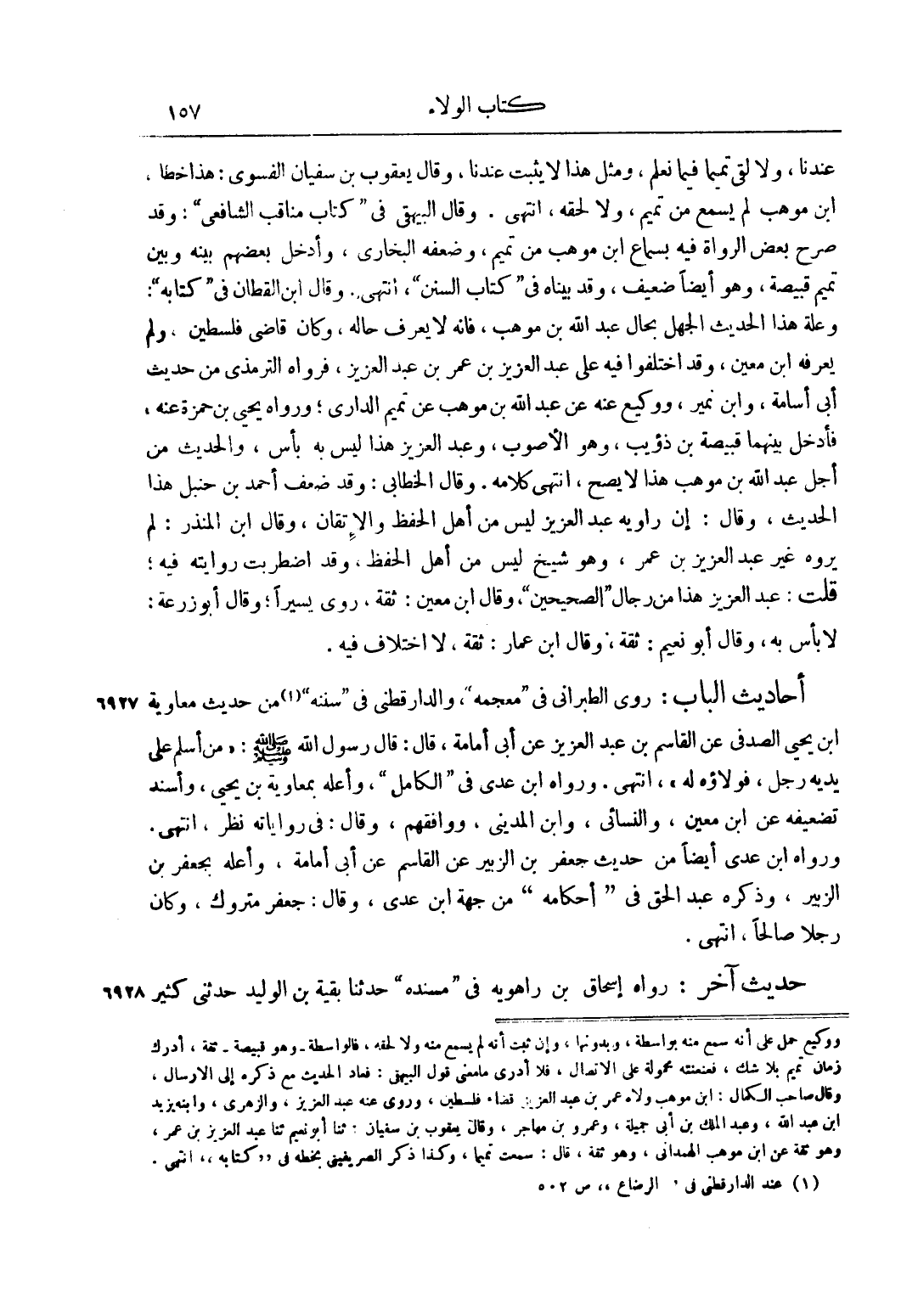 عِنْدَنَا، وَلَا لَقِيَ تَمِيمًا فِيمَا نَعْلَمُ، وَمِثْلُ هَذَا لَا يَثْبُتُ عِنْدَنَا، وَقَالَ يَعْقُوبُ بْنُ سُفْيَانَ الْفَسَوِيُّ: هَذَا خَطَأٌ، ابْنُ مَوْهَبٍ لَمْ يَسْمَعْ مِنْ تَمِيمٍ، وَلَا لَحِقَهُ، انْتَهَى. وَقَالَ الْبَيْهَقِيُّ فِي كِتَابِ مَنَاقِبِ الشَّافِعِيِّ: وَقَدْ صَرَّحَ بَعْضُ الرُّوَاةِ فِيهِ بِسَمَاعِ ابْنِ مَوْهَبٍ مِنْ تَمِيمٍ، وَضَعَّفَهُ الْبُخَارِيُّ، وَأَدْخَلَ بَعْضُهُمْ بَيْنَهُ وَبَيْنَ تَمِيمٍ قَبِيصَةَ، وَهُوَ أَيْضًا ضَعِيفٌ، وَقَدْ بَيَّنَّاهُ فِي كِتَابِ السُّنَنِ، انْتَهَى. وَقَالَ ابْنُ الْقَطَّانِ فِي كِتَابِهِ: وَعِلَّةُ هَذَا الْحَدِيثِ الْجَهْلُ بِحَالِ عَبْدِ اللَّهِ بْنِ مَوْهَبٍ، فَإِنَّهُ لَا يُعْرَفُ حَالُهُ، وَكَانَ قَاضِي فِلَسْطِينَ، وَلَمْ يَعْرِفْهُ ابْنُ مَعِينٍ، وَقَدْ اخْتَلَفُوا فِيهِ عَلَى عَبْدِ الْعَزِيزِ بْنِ عُمَرَ بْنِ عَبْدِ الْعَزِيزِ، فَرَوَاهُ التِّرْمِذِيُّ مِنْ حَدِيثِ أَبِي أُسَامَةَ، وَابْنِ نُمَيْرٍ، وَوَكِيعٍ عَنْهُ عَنْ عَبْدِ اللَّهِ بْنِ مَوْهَبٍ عَنْ تَمِيمٍ الدَّارِيِّ، وَرَوَاهُ يَحْيَى بْنُ حَمْزَةَ عَنْهُ، فَأَدْخَلَ بَيْنَهُمَا قَبِيصَةَ بْنَ ذُؤَيْبٍ، وَهُوَ الْأَصْوَبُ، وَعَبْدُ الْعَزِيزِ هَذَا لَيْسَ بِهِ بَأْسٌ، وَالْحَدِيثُ مِنْ أَجْلِ عَبْدِ اللَّهِ بْنِ مَوْهَبٍ هَذَا لَا يَصِحُّ، انْتَهَى كَلَامُهُ. وَقَالَ الْخَطَّابِيُّ: وَقَدْ ضَعَّفَ أَحْمَدُ بْنُ حَنْبَلٍ هَذَا الْحَدِيثَ، وَقَالَ: إنَّ رَاوِيَهُ عَبْدَ الْعَزِيزِ لَيْسَ مِنْ أَهْلِ الْحِفْظِ وَالْإِتْقَانِ، وَقَالَ ابْنُ الْمُنْذِرِ: لَمْ يَرْوِهِ غَيْرُ عَبْدِ الْعَزِيزِ بْنِ عُمَرَ، وَهُوَ شَيْخٌ لَيْسَ مِنْ أَهْلِ الْحِفْظِ، وَقَدْ اضْطَرَبَتْ رِوَايَتُهُ فِيهِ، قُلْت: عَبْدُ الْعَزِيزِ هَذَا مِنْ رِجَالِ الصَّحِيحَيْنِ، وَقَالَ ابْنُ مَعِينٍ: ثِقَةٌ، رَوَى يَسِيرًا، وَقَالَ أَبُو زُرْعَةَ: لَا بَأْسَ بِهِ، وَقَالَ أَبُو نُعَيْمٍ: ثِقَةٌ، وَقَالَ ابْنُ عَمَّارٍ: ثِقَةٌ، لَا اخْتِلَافَ فِيهِ.