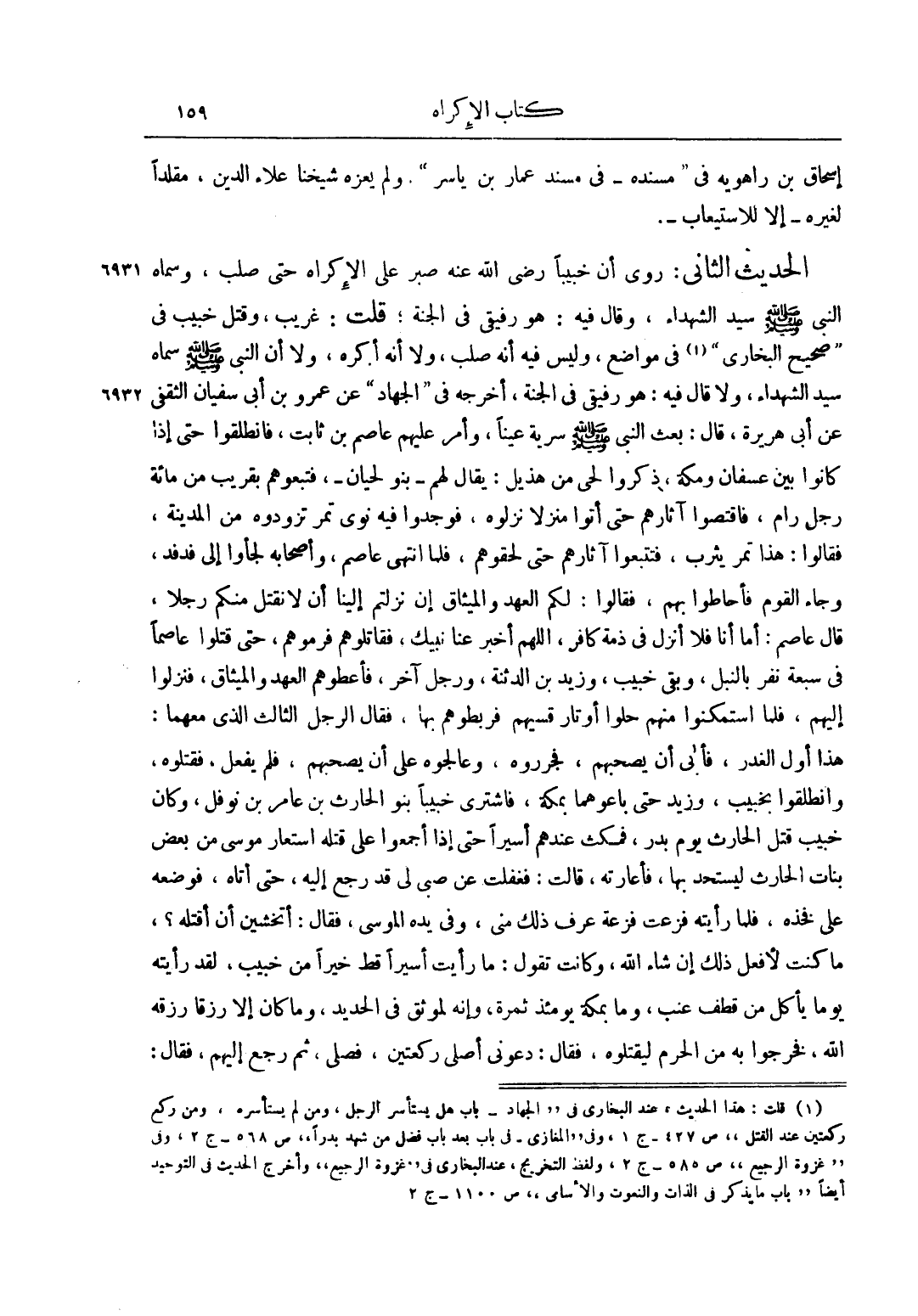 الْحَدِيثُ الثَّانِي: رُوِيَ أَنَّ خُبَيْبًا رضي الله عنه صَبَرَ عَلَى الإكراه حَتَّى صُلِبَ، وَسَمَّاهُ النَّبِيُّ صَلَّى اللَّهُ عَلَيْهِ وَسَلَّمَ سَيِّدَ الشُّهَدَاءِ، وَقَالَ فِيهِ: "هُوَ رَفِيقِي فِي الْجَنَّةِ"، قُلْت: غَرِيبٌ، وَقَتْلُ خُبَيْبِ فِي صَحِيحِ الْبُخَارِيِّ1 فِي مَوَاضِعَ، وَلَيْسَ فِيهِ أَنَّهُ صُلِبَ، وَلَا أَنَّهُ أُكْرِهَ، وَلَا أَنَّ النَّبِيَّ صَلَّى اللَّهُ عَلَيْهِ وَسَلَّمَ سَمَّاهُ سَيِّدَ الشُّهَدَاءِ، وَلَا قَالَ فِيهِ: هُوَ رَفِيقِي فِي الْجَنَّةِ، أَخْرَجَهُ فِي الْجِهَادِ عَنْ عَمْرِو بْنِ أَبِي سُفْيَانَ الثَّقَفِيِّ عَنْ أَبِي هُرَيْرَةَ، قَالَ: بَعَثَ النَّبِيُّ صَلَّى اللَّهُ عَلَيْهِ وَسَلَّمَ سَرِيَّةً عَيْنًا، وَأَمَّرَ عَلَيْهِمْ عَاصِمَ بْنَ ثَابِتٍ، فَانْطَلَقُوا حَتَّى إذَا كَانُوا بَيْنَ عُسْفَانَ وَمَكَّةَ، ذُكِرُوا لِحَيٍّ مِنْ هُذَيْلٍ: يُقَالُ لَهُمْ بَنُو لِحْيَانَ فَتَبِعُوهُمْ بِقَرِيبٍ مِنْ مِائَةِ رَجُلٍ رَامٍ، فَاقْتَصُّوا آثَارَهُمْ حَتَّى أَتَوْا مَنْزِلًا نَزَلُوهُ، فَوَجَدُوا فِيهِ نَوَى تَمْرٍ تَزَوَّدُوهُ مِنْ الْمَدِينَةِ، فَقَالُوا: هَذَا تَمْرُ يثرب، فتبعوا آثَارَهُمْ حَتَّى لَحِقُوهُمْ، فَلَمَّا انتهى عاصم، وأصحابه لجأوا إلَى فَدْفَدٍ، وَجَاءَ الْقَوْمُ فَأَحَاطُوا بِهِمْ، فَقَالُوا: لَكُمْ الْعَهْدُ وَالْمِيثَاقُ إنْ نَزَلْتُمْ إلَيْنَا أَنْ لَا نَقْتُلَ مِنْكُمْ رَجُلًا، قَالَ عَاصِمٌ: أَمَّا أَنَا فَلَا أَنْزِلُ فِي ذِمَّةِ كَافِرٍ، اللَّهُمَّ أَخْبِرْ عَنَّا نَبِيَّك، فَقَاتَلُوهُمْ فَرَمَوْهُمْ، حَتَّى قَتَلُوا عَاصِمًا فِي سَبْعَةِ نَفَرٍ بِالنَّبْلِ، وَبَقِيَ خُبَيْبِ، وَزَيْدُ بْنُ الدِّثْنَةِ، وَرَجُلٌ آخَرُ، فَأَعْطَوْهُمْ الْعَهْدَ وَالْمِيثَاقَ، فَنَزَلُوا إلَيْهِمْ، فَلَمَّا اسْتَمْكَنُوا مِنْهُمْ حَلُّوا أَوْتَارَ قِسِيِّهِمْ فَرَبَطُوهُمْ بِهَا، فَقَالَ الرَّجُلُ الثَّالِثُ الَّذِي مَعَهُمَا: هَذَا أَوَّلُ الْغَدْرِ، فأبى أن يصحبهم، فجروه، وَعَالَجُوهُ عَلَى أَنْ يَصْحَبَهُمْ، فَلَمْ يَفْعَلْ، فَقَتَلُوهُ، وَانْطَلَقُوا بِخُبَيْبٍ، وَزَيْدٍ حَتَّى بَاعُوهُمَا بِمَكَّةَ، فَاشْتَرَى خُبَيْبًا بَنُو الْحَارِثِ بْنِ عَامِرٍ بْنِ نَوْفَلٍ، وَكَانَ خُبَيْبِ قَتَلَ الْحَارِثَ يَوْمَ بَدْرٍ، فَمَكَثَ عِنْدَهُمْ أَسِيرًا حَتَّى إذَا أَجْمَعُوا عَلَى قَتْلِهِ اسْتَعَارَ مُوسًى مِنْ بَعْضِ بَنَاتِ الْحَارِثِ لِيَسْتَحِدَّ بِهَا، فَأَعَارَتْهُ، قَالَتْ: فَغَفَلْت عَنْ صَبِيٍّ لِي قَدْ رَجَعَ إلَيْهِ، حَتَّى أَتَاهُ، فَوَضَعَهُ عَلَى فَخِذِهِ، فَلَمَّا رَأَيْته فَزِعْت فَزْعَةً عَرَفَ ذَلِكَ مِنِّي، وَفِي يَدِهِ الْمُوسَى، فَقَالَ: أَتَخْشَيْنَ أَنْ أَقْتُلَهُ؟، مَا كُنْت لِأَفْعَلَ ذَلِكَ إنْ شَاءَ اللَّهُ، وَكَانَتْ تَقُولُ: مَا رَأَيْت أَسِيرًا قَطُّ خَيْرًا مِنْ خُبَيْبِ، لَقَدْ رَأَيْته يَوْمًا يَأْكُلُ مِنْ قِطْفِ عِنَبٍ، وَمَا بِمَكَّةَ يومئذ تمرة، وَإِنَّهُ لَمُوَثَّقٌ فِي الْحَدِيدِ، وَمَا كَانَ إلَّا رِزْقًا رَزَقَهُ اللَّهُ، فَخَرَجُوا بِهِ مِنْ الْحَرَمِ لِيَقْتُلُوهُ، فَقَالَ: دَعُونِي أُصَلِّي رَكْعَتَيْنِ، فَصَلَّى، ثُمَّ رَجَعَ إلَيْهِمْ، فَقَالَ: