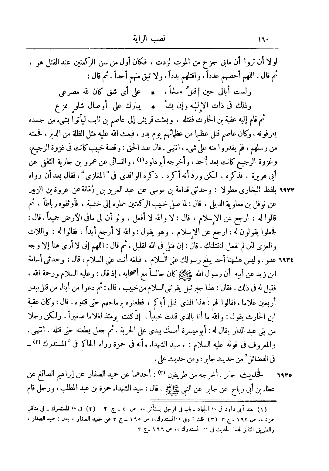 فَحَدِيثُ جَابِرٍ: أَخْرَجَهُ مِنْ طَرِيقَيْنِ3: أَحَدُهُمَا عَنْ حُمَيْدٍ الصَّفَّارِ عَنْ إبْرَاهِيمَ الصَّائِغِ عَنْ عَطَاءِ بْنِ أَبِي رَبَاحٍ عَنْ جَابِرٍ عَنْ النَّبِيِّ صَلَّى اللَّهُ عَلَيْهِ وَسَلَّمَ، قَالَ: "سَيِّدُ الشُّهَدَاءِ حَمْزَةُ بْنُ عَبْدِ الْمُطَّلِبِ، وَرَجُلٌ قَامَ