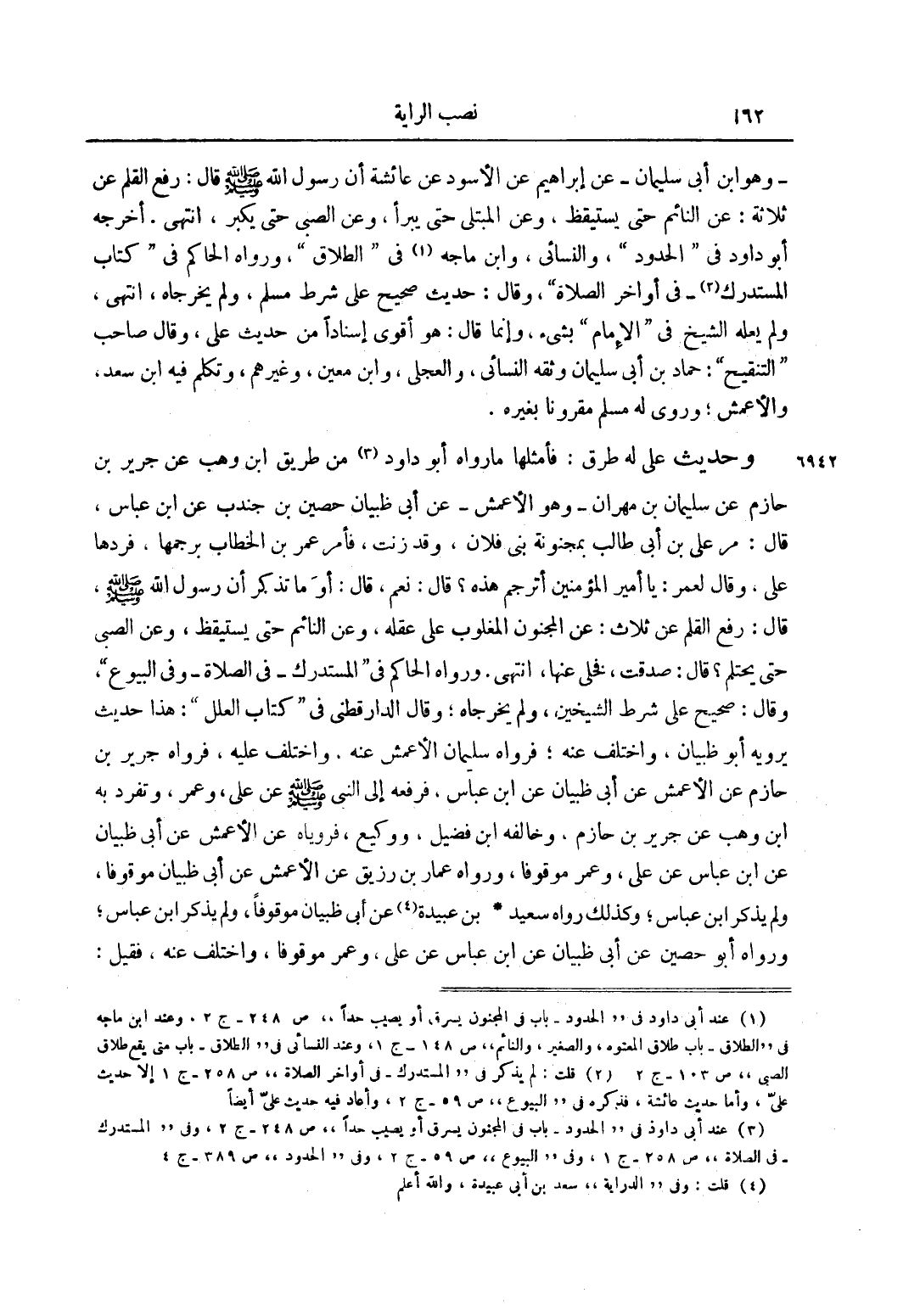 وَحَدِيثُ عَلِيٍّ لَهُ طُرُقٌ: فَأَمْثَلُهَا مَا رَوَاهُ أَبُو دَاوُد3 مِنْ طَرِيقِ ابْنِ وَهْبٍ عَنْ جَرِيرِ بْنِ حَازِمٍ عَنْ سُلَيْمَانَ بْنِ مِهْرَانَ وَهُوَ الْأَعْمَشُ عَنْ أَبِي ظَبْيَانَ حُصَيْنِ بْنِ جُنْدُبٍ عَنْ ابْنِ عَبَّاسٍ، قَالَ: مَرَّ عَلِيُّ بْنُ أَبِي طَالِبٍ بِمَجْنُونَةِ بَنِي فُلَانٍ، وَقَدْ زَنَتْ، فَأَمَرَ عُمَرُ بْنُ الْخَطَّابِ بِرَجْمِهَا، فَرَدَّهَا عَلِيٌّ، وَقَالَ لِعُمَرَ: يَا أَمِيرَ الْمُؤْمِنِينَ أَتَرْجُمُ هَذِهِ؟ قَالَ: نَعَمْ، قَالَ: أوَ ما تذكر قول رَسُولَ اللَّهِ صَلَّى اللَّهُ عَلَيْهِ وَسَلَّمَ، قَالَ: "رُفِعَ الْقَلَمُ عَنْ ثَلَاثٍ: عَنْ الْمَجْنُونِ الْمَغْلُوبِ عَلَى عَقْلِهِ، وَعَنْ النَّائِمِ حَتَّى يَسْتَيْقِظَ، وَعَنْ الصَّبِيِّ حَتَّى يَحْتَلِمَ"؟ قَالَ: صَدَقْتَ، فَخَلَّى عَنْهَا، انْتَهَى. وَرَوَاهُ الْحَاكِمُ فِي الْمُسْتَدْرَكِ فِي الصَّلَاةِ وَفِي الْبُيُوعِ، وَقَالَ: صَحِيحٌ عَلَى شَرْطِ الشَّيْخَيْنِ، وَلَمْ يُخَرِّجَاهُ، وَقَالَ الدَّارَقُطْنِيُّ فِي كِتَابِ الْعِلَلِ: هَذَا حَدِيثٌ يَرْوِيهِ أَبُو ظَبْيَانَ، وَاخْتُلِفَ عَنْهُ، فَرَوَاهُ سُلَيْمَانُ الْأَعْمَشُ عَنْهُ، وَاخْتُلِفَ عَلَيْهِ، فَرَوَاهُ جَرِيرُ بْنُ حَازِمٍ عَنْ الْأَعْمَشِ عَنْ أَبِي ظَبْيَانَ عَنْ ابْنِ عَبَّاسٍ، فَرَفَعَهُ إلَى النَّبِيِّ صَلَّى اللَّهُ عَلَيْهِ وَسَلَّمَ عَنْ عَلِيٍّ، وَعُمَرَ، وَتَفَرَّدَ بِهِ ابْنُ وَهْبٍ عَنْ جَرِيرِ بْنِ حَازِمٍ، وَخَالَفَهُ ابْنُ فُضَيْلٍ، وَوَكِيعٌ، فَرَوَاهُ عَنْ الْأَعْمَشِ عَنْ أَبِي ظَبْيَانَ عَنْ ابْنِ عَبَّاسٍ عَنْ عَلِيٍّ، وَعُمَرَ مَوْقُوفًا، وَرَوَاهُ عَمَّارُ بْنُ رُزَيْقٍ عَنْ الْأَعْمَشِ عَنْ أَبِي ظَبْيَانَ مَوْقُوفًا، وَلَمْ يَذْكُرْ ابْنَ عَبَّاسٍ، وَكَذَلِكَ رَوَاهُ سَعِيدُ بْنُ عُبَيْدَةَ4 عَنْ أَبِي ظَبْيَانَ مَوْقُوفًا، وَلَمْ يَذْكُرْ ابْنَ عَبَّاسٍ، وَرَوَاهُ أَبُو حُصَيْنٍ عَنْ أَبِي ظَبْيَانَ عَنْ ابْنِ عَبَّاسٍ عَنْ عَلِيٍّ، وَعُمَرَ مَوْقُوفًا، وَاخْتُلِفَ عَنْهُ، فَقِيلَ: