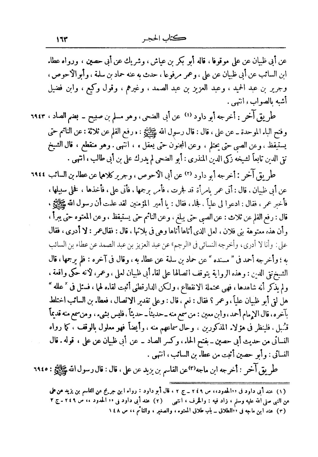 طَرِيقٌ آخَرُ: أَخْرَجَهُ أَبُو دَاوُد2 عَنْ أَبِي الْأَحْوَصِ، وَجَرِيرٍ كِلَاهُمَا عَنْ عَطَاءِ بْنِ السَّائِبِ عَنْ أَبِي ظَبْيَانَ، قَالَ: أُتِيَ عُمَرُ بِامْرَأَةٍ قَدْ فَجَرَتْ، فَأَمَرَ بِرَجْمِهَا، فَأَتَى عَلِيٌّ، فَأَخَذَهَا، فَخَلَّى سَبِيلَهَا، فَأُخْبِرَ عُمَرُ، فَقَالَ: اُدْعُوا لِي عَلِيًّا، فَجَاءَ، فَقَالَ: يَا أَمِيرَ الْمُؤْمِنِينَ لَقَدْ عَلِمْتَ أَنَّ رَسُولَ اللَّهِ صَلَّى اللَّهُ عَلَيْهِ وَسَلَّمَ، قَالَ: "رُفِعَ الْقَلَمُ عَنْ ثَلَاثٍ: عَنْ الصَّبِيِّ حَتَّى يَبْلُغَ، وَعَنْ النَّائِمِ حَتَّى يَسْتَيْقِظَ، وَعَنْ الْمَعْتُوهِ حَتَّى يَبْرَأَ"، وَأَنَّ هَذِهِ مَعْتُوهَةُ بَنِي فُلَانٍ، لَعَلَّ الَّذِي أَتَاهَا أَتَاهَا وَهِيَ فِي بَلَائِهَا، قَالَ: فَقَالَ عُمَرُ: لَا أَدْرِي، فَقَالَ عَلِيٌّ: وَأَنَا أَدْرِي، وَأَخْرَجَهُ النَّسَائِيُّ فِي الرَّجْمِ عَنْ عَبْدِ الْعَزِيزِ بْنِ عَبْدِ الصَّمَدِ عَنْ عَطَاءِ بْنِ السَّائِبِ بِهِ، وَأَخْرَجَهُ أَحْمَدُ فِي مُسْنَدِهِ عَنْ حَمَّادِ بْنِ سَلَمَةَ عَنْ عَطَاءٍ بِهِ، وَقَالَ فِي آخِرِهِ: فَلَمْ يَرْجُمْهَا، قَالَ الشَّيْخُ تَقِيُّ الدِّينِ: وَهَذِهِ الرِّوَايَةُ يَتَوَقَّفُ اتِّصَالُهَا عَلَى لِقَاءِ أَبِي ظَبْيَانَ لِعَلِيٍّ، وَعُمَرَ، لِأَنَّهُ حَكَى وَاقِعَةً، وَلَمْ يَذْكُرْ أَنَّهُ شَاهَدَهَا، فَهِيَ مُحْتَمِلَةُ الِانْقِطَاعِ، وَلَكِنَّ الدَّارَقُطْنِيّ أَثْبَتَ لِقَاءَهُ لَهُمَا، فَسُئِلَ فِي عِلَلِهِ هَلْ لَقِيَ أَبُو ظَبْيَانَ عَلِيًّا، وَعُمَرَ؟ فَقَالَ: نَعَمْ، قَالَ: وَعَلَى تَقْدِيرِ الِاتِّصَالِ، فَعَطَاءُ بْنُ السَّائِبِ اخْتَلَطَ بِآخِرِهِ، قَالَ الْإِمَامُ أَحْمَدُ، وَابْنُ مَعِينٍ: مَنْ سمع منه حديثاً حَدِيثًا، فَلَيْسَ بِشَيْءٍ، وَمَنْ سَمِعَ مِنْهُ قَدِيمًا قُبِلَ، فَلْيُنْظَرْ فِي هَؤُلَاءِ الْمَذْكُورِينَ، وَحَالِ سَمَاعِهِمْ مِنْهُ، وَأَيْضًا فَهُوَ مَعْلُولٌ بِالْوَقْفِ، كَمَا رَوَاهُ النَّسَائِيُّ مِنْ حَدِيثِ أَبِي حُصَيْنٍ بِفَتْحِ الْحَاءِ، وَكَسْرِ الصَّادِ عَنْ أَبِي ظَبْيَانَ عَنْ عَلِيٍّ، قَوْلُهُ: قَالَ النَّسَائِيُّ: وَأَبُو حُصَيْنٍ أَثْبَتُ مِنْ عَطَاءِ بْنِ السَّائِبِ، انْتَهَى.