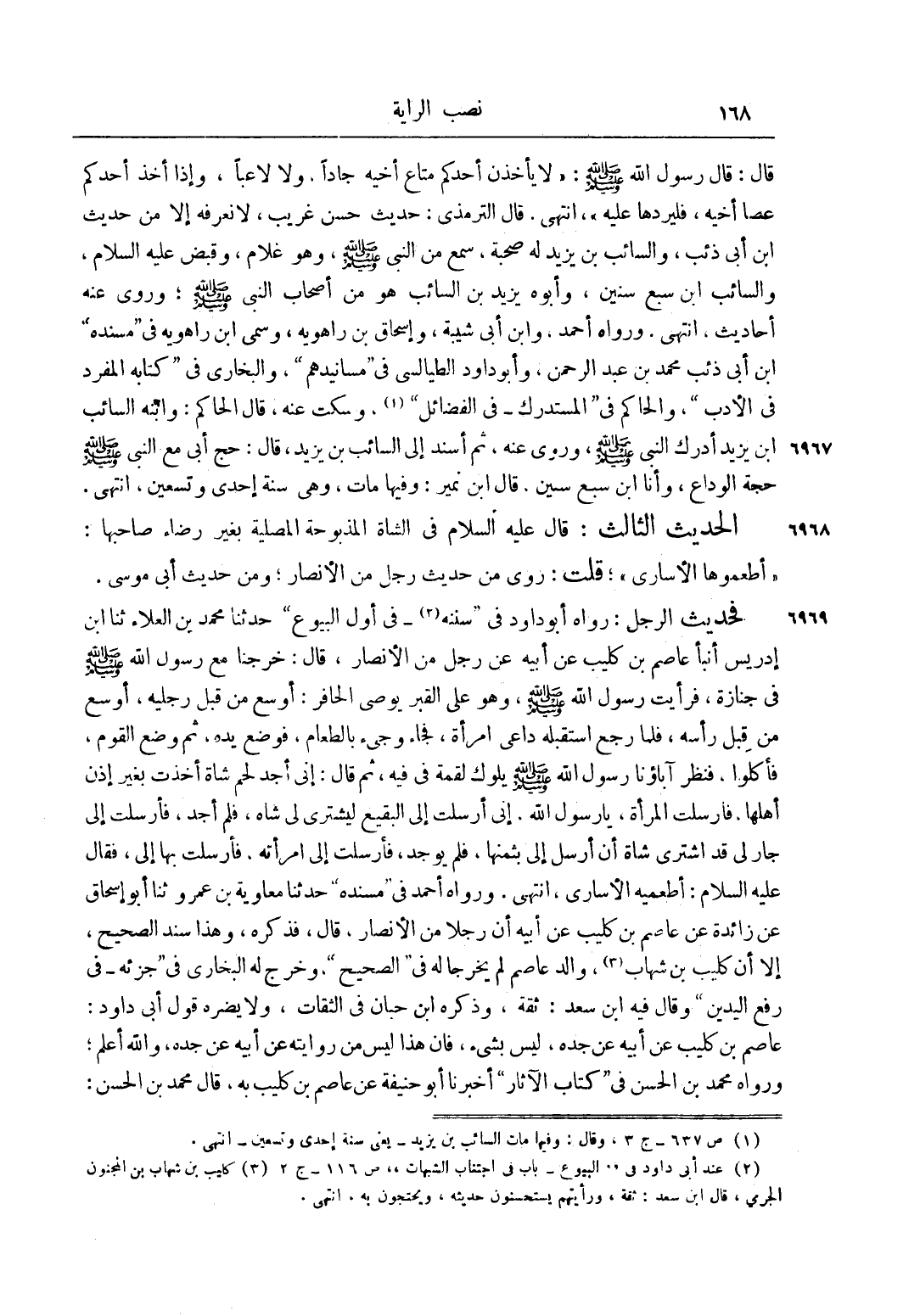 قَالَ: قَالَ رَسُولُ اللَّهِ صَلَّى اللَّهُ عَلَيْهِ وَسَلَّمَ: "لَا يَأْخُذَنَّ أَحَدُكُمْ مَتَاعَ أَخِيهِ جَادًّا، وَلَا لَاعِبًا، وَإِذَا أَخَذَ أَحَدُكُمْ عَصَا أَخِيهِ، فَلْيَرُدَّهَا عَلَيْهِ"، انْتَهَى. قَالَ التِّرْمِذِيُّ: حَدِيثٌ حَسَنٌ غَرِيبٌ، لَا نَعْرِفُهُ إلَّا مِنْ حَدِيثِ ابْنِ أَبِي ذِئْبٍ، وَالسَّائِبُ بْنُ يَزِيدَ لَهُ صُحْبَةٌ، سَمِعَ مِنْ النَّبِيِّ صَلَّى اللَّهُ عَلَيْهِ وَسَلَّمَ، وَهُوَ غُلَامٌ، وَقُبِضَ عليه السلام، وَالسَّائِبُ ابْنُ سَبْعِ سِنِينَ، وَأَبُوهُ يَزِيدُ بْنُ السَّائِبِ هُوَ مِنْ أَصْحَابِ النَّبِيِّ صَلَّى اللَّهُ عَلَيْهِ وَسَلَّمَ، وَرَوَى عَنْهُ أَحَادِيثَ، انْتَهَى. وَرَوَاهُ أَحْمَدُ، وَابْنُ أَبِي شَيْبَةَ، وَإِسْحَاقُ بْنُ رَاهْوَيْهِ، وَسَمَّى ابْنُ رَاهْوَيْهِ فِي مُسْنَدِهِ ابْنَ أَبِي ذِئْبٍ مُحَمَّدَ بْنَ عَبْدِ الرَّحْمَنِ، وَأَبُو دَاوُد الطَّيَالِسِيُّ فِي مَسَانِيدِهِمْ، وَالْبُخَارِيُّ فِي كتابه المفرد في الأدب، وَالْحَاكِمُ فِي الْمُسْتَدْرَكِ فِي الْفَضَائِلِ1 وَسَكَتَ عَنْهُ، قَالَ الْحَاكِمُ: وَابْنُهُ السَّائِبُ بْنُ يَزِيدَ أَدْرَكَ النَّبِيَّ صَلَّى اللَّهُ عَلَيْهِ وَسَلَّمَ، وَرَوَى عَنْهُ، ثُمَّ أَسْنَدَ إلَى السَّائِبِ بْنِ يَزِيدَ، قَالَ: حَجَّ أَبِي مَعَ النَّبِيِّ صَلَّى اللَّهُ عَلَيْهِ وَسَلَّمَ حَجَّةَ الْوَدَاعِ، وَأَنَا ابْنُ سَبْعِ سِنِينَ، قَالَ ابْنُ نُمَيْرٍ: وَفِيهَا مَاتَ، وَهِيَ سَنَةُ إحْدَى وَتِسْعِينَ، انْتَهَى.