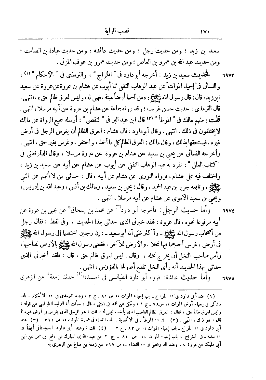 فَحَدِيثُ سَعِيدِ بْنِ زَيْدٍ: أَخْرَجَهُ أَبُو دَاوُد فِي الْخَرَاجِ، وَالتِّرْمِذِيُّ فِي الْأَحْكَامِ1 وَالنَّسَائِيُّ فِي إحْيَاءِ الْمَوَاتِ عَنْ عَبْدِ الْوَهَّابِ الثَّقَفِيِّ ثَنَا أَيُّوبُ عَنْ هِشَامِ بْنِ عُرْوَةَ عَنْ عُرْوَةَ عَنْ سَعِيدِ بْنِ زَيْدٍ، قَالَ: قَالَ رَسُولُ اللَّهِ صَلَّى اللَّهُ عَلَيْهِ وَسَلَّمَ: "مَنْ أحيى أَرْضًا مَيِّتَةً، فَهِيَ لَهُ، وَلَيْسَ لِعِرْقٍ ظَالِمٍ حَقٌّ"، انْتَهَى. قَالَ التِّرْمِذِيُّ: حَدِيثٌ حَسَنٌ غَرِيبٌ، وَقَدْ رَوَاهُ جَمَاعَةٌ عَنْ هِشَامِ بْنِ عُرْوَةَ عَنْ أَبِيهِ مُرْسَلًا، انْتَهَى. قُلْتُ: مِنْهُمْ مَالِكٌ فِي الْمُوَطَّإِ2 قَالَ ابْنُ عَبْدِ الْبَرِّ فِي التَّقَصِّي: أَرْسَلَهُ جَمِيعُ الرُّوَاةِ عَنْ مَالِكٍ لَا يَخْتَلِفُونَ فِي ذَلِكَ، انْتَهَى. وَقَالَ أَبُو دَاوُد: قَالَ هِشَامٌ: الْعِرْقُ الظَّالِمُ أَنْ يَغْرِسَ الرَّجُلُ فِي أَرْضِ غَيْرِهِ، فَيَسْتَحِقَّهَا بِذَلِكَ، وَقَالَ مَالِكٌ: الْعِرْقُ الظَّالِمُ كُلُّ مَا أُخِذَ، وَاحْتُفِرَ، وَغُرِسَ بِغَيْرِ حَقٍّ، انْتَهَى. وَأَخْرَجَهُ النَّسَائِيّ عَنْ يَحْيَى بْنِ سَعِيدٍ عَنْ هِشَامِ بْنِ عُرْوَةَ عَنْ عُرْوَةَ مُرْسَلًا، وَقَالَ الدَّارَقُطْنِيُّ فِي كِتَابِ الْعِلَلِ: تَفَرَّدَ بِهِ عَبْدُ الْوَهَّابِ الثَّقَفِيُّ عَنْ أَيُّوبَ عَنْ هِشَامٍ عَنْ أَبِيهِ عَنْ سَعِيدِ بْنِ زَيْدٍ، وَاخْتُلِفَ فِيهِ عَلَى هِشَامٍ، فَرَوَاهُ الثَّوْرِيُّ عَنْ هِشَامٍ عَنْ أَبِيهِ، قَالَ: حَدَّثَنِي مَنْ لَا أَتَّهِمُ عَنْ النَّبِيِّ صَلَّى اللَّهُ عَلَيْهِ وَسَلَّمَ، وَتَابَعَهُ جَرِيرُ بْنُ عَبْدِ الْحَمِيدِ، وَقَالَ: يَحْيَى بْنُ سَعِيدٍ، وَمَالِكُ بْنُ أَنَسٍ، وَعَبْدُ اللَّهِ بْنُ إدْرِيسَ، وَيَحْيَى بْنُ سَعِيدٍ الْأُمَوِيُّ عَنْ هِشَامٍ عَنْ أَبِيهِ مُرْسَلًا، انْتَهَى.
