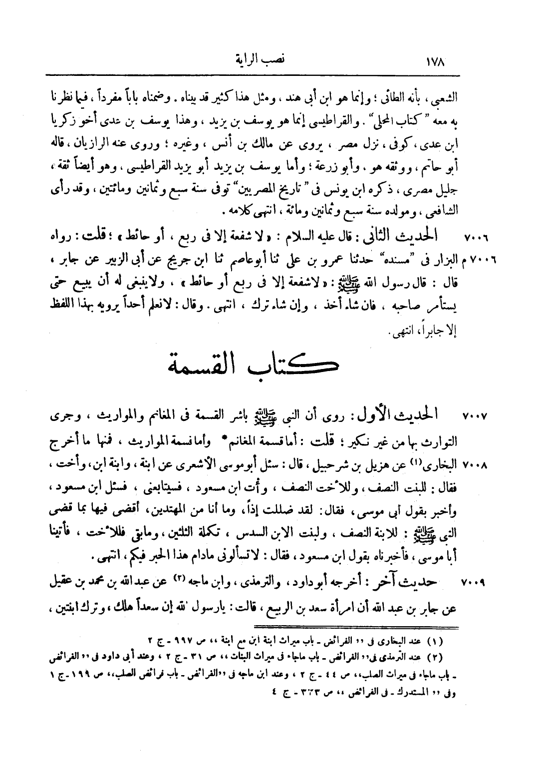 الْحَدِيثُ الْأَوَّلُ: رُوِيَ أَنَّ النَّبِيَّ صَلَّى اللَّهُ عَلَيْهِ وَسَلَّمَ بَاشَرَ الْقِسْمَةَ فِي الْمَغَانِمِ وَالْمَوَارِيثِ، وَجَرَى التَّوَارُثُ بِهَا مِنْ غَيْرِ نَكِيرٍ، قُلْت: أَمَّا قِسْمَةُ الْمَغَانِمِ، وَأَمَّا قِسْمَةُ الْمَوَارِيثِ، فَمِنْهَا مَا أَخْرَجَ الْبُخَارِيُّ1 عَنْ هُذَيْلِ بْنِ شُرَحْبِيلَ، قَالَ: سُئِلَ أَبُو مُوسَى الْأَشْعَرِيُّ عَنْ ابْنَةٍ، وَابْنَةِ ابْنٍ، وَأُخْتٍ، فَقَالَ: لِلْبِنْتِ النِّصْفُ، وَلِلْأُخْتِ النِّصْفُ، وَأْتِ ابْنَ مَسْعُودٍ، فَسَيُتَابِعُنِي، فَسُئِلَ ابْنُ مَسْعُودٍ، وَأُخْبِرَ بِقَوْلِ أبي موسى، فقال لقد ضَلَلْت إذًا، وَمَا أَنَا مِنْ الْمُهْتَدِينَ، أَقْضِي فِيهَا بِمَا قَضَى النَّبِيُّ صَلَّى اللَّهُ عَلَيْهِ وَسَلَّمَ: لِلِابْنَةِ النِّصْفُ، وَلِبِنْتِ الِابْنِ السُّدُسُ، تَكْمِلَةَ الثُّلُثَيْنِ، وَمَا بَقِيَ فَلِلْأُخْتِ، فَأَتَيْنَا أَبَا مُوسَى، فَأَخْبَرْنَاهُ بِقَوْلِ ابْنِ مَسْعُودٍ، فَقَالَ: لَا تَسْأَلُونِي مَا دَامَ هَذَا الْحَبْرُ فِيكُمْ، انْتَهَى.