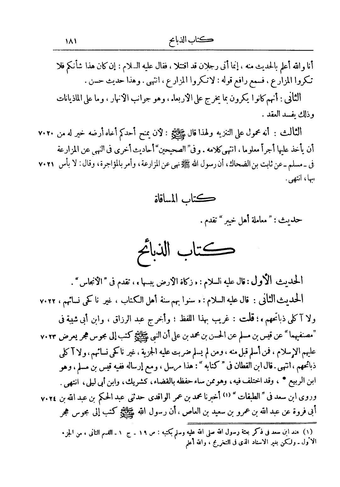 الْحَدِيثُ الثَّانِي: قَالَ عليه السلام: "سُنُّوا بِهِمْ سُنَّةَ أَهْلِ الْكِتَابِ، غَيْرَ نَاكِحِي نِسَائِهِمْ، وَلَا آكِلِي ذَبَائِحِهِمْ"، قُلْت: غَرِيبٌ بِهَذَا اللَّفْظِ، وَأَخْرَجَ عَبْدُ الرَّزَّاقِ، وَابْنُ أَبِي شَيْبَةَ فِي مُصَنَّفَيْهِمَا عَنْ قَيْسِ بْنِ مُسْلِمٍ عَنْ الْحَسَنِ بْنِ مُحَمَّدِ بْنِ عَلِيٍّ أَنَّ النَّبِيَّ صَلَّى اللَّهُ عَلَيْهِ وَسَلَّمَ كَتَبَ إلَى مَجُوسِ هَجَرَ يَعْرِضُ عَلَيْهِمْ الْإِسْلَامَ، فَمَنْ أَسْلَمَ قُبِلَ مِنْهُ، وَمَنْ لَمْ يُسْلِمْ ضُرِبَتْ عَلَيْهِ الْجِزْيَةُ، غَيْرَ نَاكِحِي نِسَائِهِمْ، وَلَا آكِلِي ذَبَائِحِهِمْ، انْتَهَى. قَالَ ابْنُ الْقَطَّانِ فِي كِتَابِهِ: هَذَا مُرْسَلٌ، وَمَعَ إرْسَالِهِ فَفِيهِ قَيْسُ بْنُ مُسْلِمٍ، وَهُوَ ابْنُ الرَّبِيعِ، وَقَدْ اُخْتُلِفَ فِيهِ، وَهُوَ مِمَّنْ سَاءَ حِفْظُهُ بِالْقَضَاءِ، كَشَرِيكٍ، وَابْنِ أَبِي لَيْلَى، انْتَهَى. وَرَوَى ابْنُ سَعْدٍ فِي الطَّبَقَاتِ1 أَخْبَرَنَا مُحَمَّدُ بْنُ عُمَرَ الْوَاقِدِيُّ حَدَّثَنِي عَبْدُ الْحَكَمِ بْنُ عَبْدِ اللَّهِ بْنِ أَبِي فَرْوَةَ عَنْ عَبْدِ اللَّهِ بْنِ عَمْرِو بْنِ سَعِيدِ بْنِ الْعَاصِ، أَنَّ رَسُولَ اللَّهِ صَلَّى اللَّهُ عَلَيْهِ وَسَلَّمَ كَتَبَ إلَى مَجُوسٍ هَجَرَ