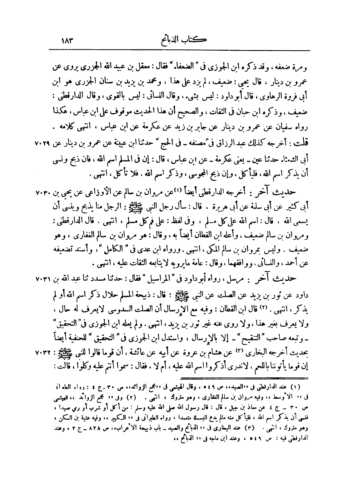 3 عند البخاري في الذبائح والصيد باب ذبيحة الأعراب ص 828 ج 2، وعند الدارقطني فيه: ص 549، وعند ابن ماجه في الذبائح.