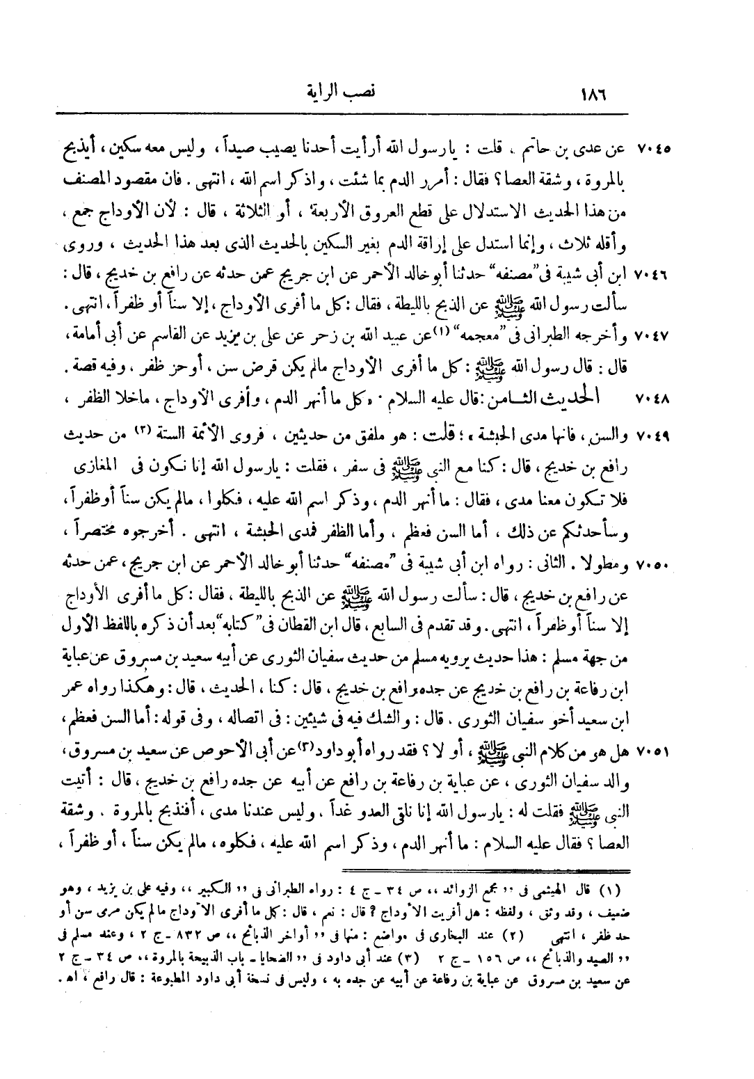 عَنْ عَدِيِّ بْنِ حَاتِمٍ، قُلْت: يَا رَسُولَ اللَّهِ أَرَأَيْت أَحَدَنَا يُصِيبُ صَيْدًا، وَلَيْسَ مَعَهُ سِكِّينٌ، أَيُذْبَحُ بِالْمَرْوَةِ، وَشِقَّةِ الْعَصَا؟ فَقَالَ: "أَمْرِرْ الدَّمَ بِمَا شِئْت، وَاذْكُرْ اسْمَ اللَّهِ"، انْتَهَى. فَإِنَّ مَقْصُودَ الْمُصَنِّفِ مِنْ هَذَا الْحَدِيثِ الِاسْتِدْلَال عَلَى قَطْعِ الْعُرُوقِ الْأَرْبَعَةِ، أَوْ الثَّلَاثَةِ، قَالَ: لِأَنَّ الْأَوْدَاجَ جَمْعٌ، وَأَقَلُّهُ ثَلَاثٌ، وَإِنَّمَا اسْتَدَلَّ عَلَى إرَاقَةِ الدَّمِ بِغَيْرِ السِّكِّينِ بِالْحَدِيثِ الَّذِي بَعْدَ هَذَا الْحَدِيثِ، وَرَوَى ابْنُ أَبِي شَيْبَةَ فِي مُصَنَّفِهِ حَدَّثَنَا أَبُو خَالِدٍ الْأَحْمَرُ عَنْ ابْنِ جُرَيْجٍ عَمَّنْ حَدَّثَهُ عَنْ رَافِعِ بْنِ خَدِيجٍ، قَالَ: سَأَلْت رَسُولَ اللَّهِ صَلَّى اللَّهُ عَلَيْهِ وَسَلَّمَ عَنْ الذَّبْحِ بِاللِّيطَةِ، فَقَالَ: "كُلُّ مَا أَفْرَى الْأَوْدَاجَ، إلَّا سِنًّا أَوْ ظُفُرًا"، انْتَهَى. وَأَخْرَجَهُ الطَّبَرَانِيُّ فِي مُعْجَمِهِ1 عَنْ عُبَيْدِ اللَّهِ بْنِ زَحْرٍ عَنْ عَلِيِّ بْنِ يَزِيدَ عَنْ الْقَاسِمِ عَنْ أَبِي أُمَامَةَ، قَالَ: قَالَ رَسُولُ اللَّهِ صَلَّى اللَّهُ عَلَيْهِ وَسَلَّمَ: "كُلُّ مَا أَفْرَى الْأَوْدَاجَ مَا لَمْ يَكُنْ قَرْضَ سِنٍّ، أَوْ جَزَّ ظُفُرٍ"، وَفِيهِ قِصَّةٌ.