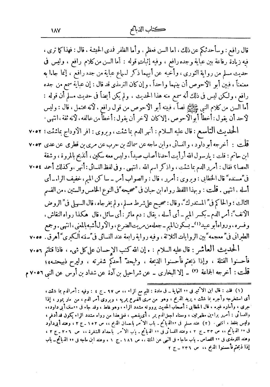 قَالَ رَافِعٌ: وَسَأُحَدِّثُكُمْ عَنْ ذَلِكَ، أَمَّا السِّنُّ فَعَظْمٌ، وَأَمَّا الظُّفُرُ فَمُدَى الْحَبَشَةِ، قَالَ: فَهَذَا كَمَا تَرَى، فِيهِ زِيَادَةُ رِفَاعَةَ بَيْنَ عَبَايَةَ وَجَدِّهِ رَافِعٍ، وَفِيهِ إثْبَاتُ قَوْلِهِ: أَمَّا السِّنُّ مِنْ كَلَامِ رَافِعٍ، وَلَيْسَ فِي حَدِيثِ مُسْلِمٍ مِنْ رِوَايَةِ الثَّوْرِيِّ، وَأَخِيهِ عَنْ أَبِيهِمَا ذِكْرٌ لِسَمَاعِ عَبَايَةَ مِنْ جَدِّهِ رَافِعٍ، إنَّمَا جَاءَا بِهِ مُعَنْعَنًا، فَبَيَّنَ أَبُو الْأَحْوَصِ أَنَّ بَيْنَهُمَا وَاحِدًا، وَإِنْ كَانَ التِّرْمِذِيُّ قَدْ قَالَ: إنَّ عَبَايَةَ سَمِعَ مِنْ جَدِّهِ رَافِعٍ، وَلَكِنْ لَيْسَ فِي ذَلِكَ أَنَّهُ سَمِعَ مِنْهُ هَذَا الْحَدِيثَ، وَلَمْ يَكُنْ أَيْضًا فِي حَدِيثِ مُسْلِمٍ أَنَّ قَوْلَهُ: أُمًّا السِّنُّ مِنْ كَلَامِ النَّبِيِّ صَلَّى اللَّهُ عَلَيْهِ وَسَلَّمَ نَصًّا، فَبَيَّنَهُ أَبُو الْأَحْوَصِ مِنْ قَوْلِ رَافِعٍ، لِأَنَّهُ مُحْتَمَلٌ، قَالَ: وَلَيْسَ لِأَحَدٍ أَنْ يَقُولَ: أَخْطَأَ أَبُو الْأَحْوَصِ، إلَّا كَانَ الْآخَرُ أَنْ يَقُولَ: أَخْطَأَ مَنْ خَالَفَهُ، لِأَنَّهُ ثِقَةٌ، انْتَهَى.