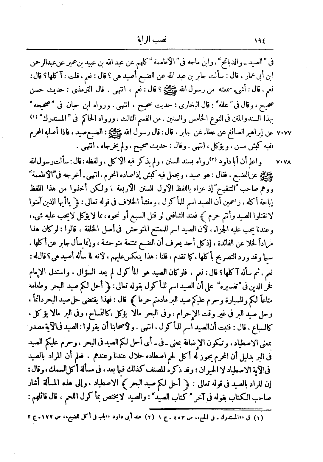 فِي الصَّيْدِ وَالذَّبَائِحِ، وَابْنُ مَاجَهْ فِي الْأَطْعِمَةِ كُلُّهُمْ عَنْ عَبْدِ اللَّهِ بْنِ عُبَيْدِ بْنِ عُمَيْرِ عَنْ عَبْدِ الرَّحْمَنِ بْنِ أَبِي عَمَّارٍ، قَالَ: سَأَلْت جَابِرَ بْنَ عَبْدِ اللَّهِ عَنْ الضَّبُعِ أَصَيْدٌ هِيَ؟ قَالَ: نَعَمْ، قُلْت: آكُلُهَا؟ قَالَ: نَعَمْ، قَالَ: أَشَيْءٌ سَمِعْته مِنْ رَسُولِ اللَّهِ صَلَّى اللَّهُ عَلَيْهِ وَسَلَّمَ؟ قَالَ: نَعَمْ، انْتَهَى. قَالَ التِّرْمِذِيُّ: حَدِيثٌ حَسَنٌ صَحِيحٌ، وَقَالَ فِي عِلَلِهِ: قَالَ الْبُخَارِيُّ: حَدِيثٌ صَحِيحٌ، انْتَهَى. وَرَوَاهُ ابْنُ حِبَّانَ فِي صَحِيحِهِ بِهَذَا السَّنَدِ وَالْمَتْنِ فِي النَّوْعِ الْخَامِسِ وَالسِّتِّينَ، مِنْ الْقِسْمِ الثَّالِثِ، وَرَوَاهُ الْحَاكِمُ فِي الْمُسْتَدْرَكِ1 عَنْ إبْرَاهِيمَ الصَّائِغِ عَنْ عَطَاءٍ عَنْ جَابِرٍ، قَالَ: قَالَ رَسُولُ اللَّهِ صَلَّى اللَّهُ عَلَيْهِ وَسَلَّمَ: "الضَّبُعُ صَيْدٌ، فَإِذَا أَصَابَهُ الْمُحْرِمُ فَفِيهِ كَبْشٌ مُسِنٌّ، وَيُؤْكَلُ"، انْتَهَى. وَقَالَ: حَدِيثٌ صَحِيحٌ، وَلَمْ يُخَرِّجَاهُ، انْتَهَى.