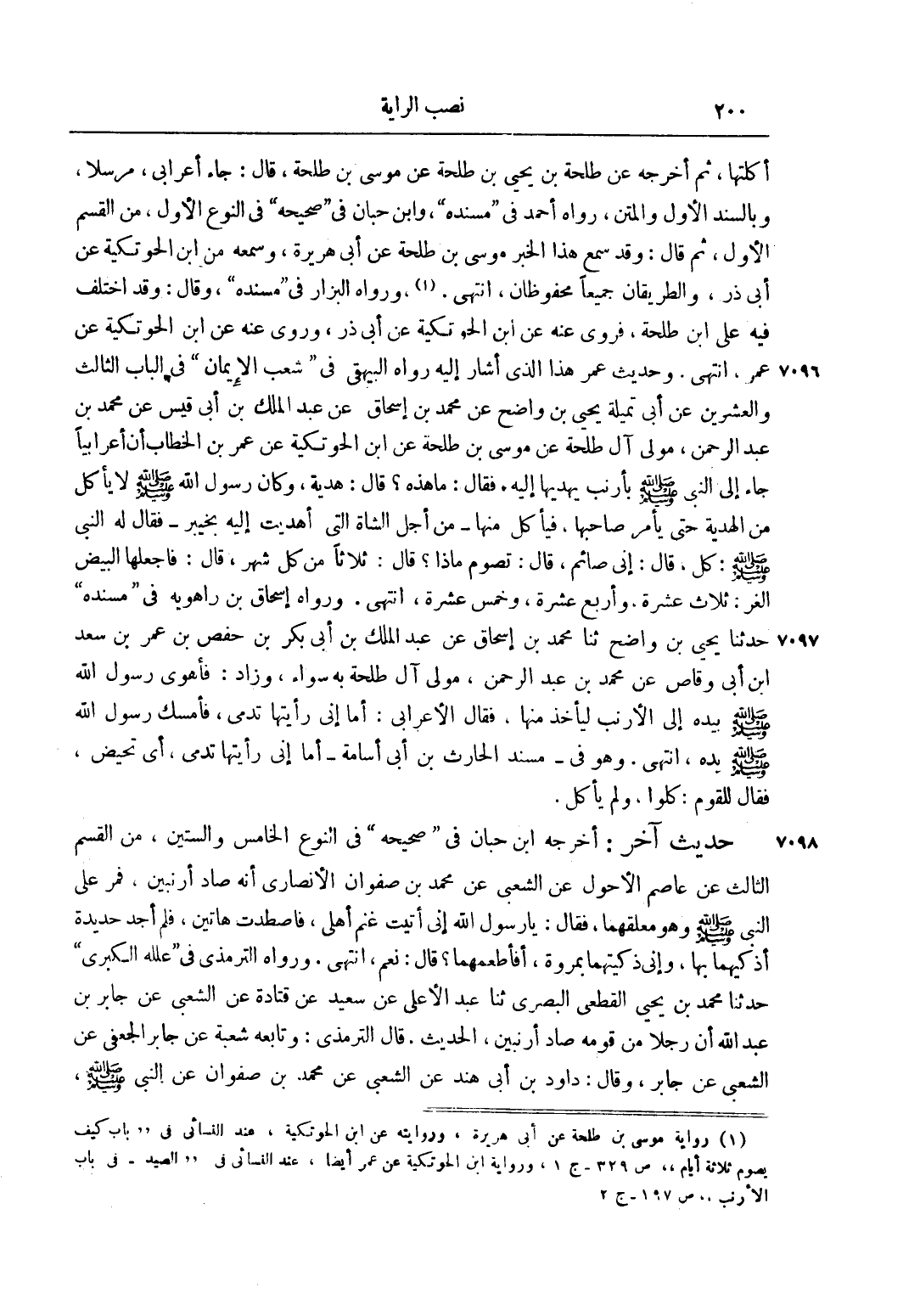 أَكَلْتهَا"، ثُمَّ أَخْرَجَهُ عَنْ طَلْحَةَ بْنِ يَحْيَى بْنِ طَلْحَةَ عَنْ مُوسَى بْنِ طَلْحَةَ، قَالَ: جَاءَ أَعْرَابِيٌّ، مُرْسَلًا، وَبِالسَّنَدِ الْأَوَّلِ وَالْمَتْنِ، َرَوَاهُ أَحْمَدُ فِي مُسْنَدِهِ، وَابن حِبَّانَ فِي صَحِيحِهِ فِي النَّوْعِ الْأَوَّلِ، مِنْ الْقِسْمِ الْأَوَّلِ، ثُمَّ قَالَ: وَقَدْ سَمِعَ هَذَا الْخَبَرَ مُوسَى بْنُ طَلْحَةَ عَنْ أَبِي هُرَيْرَةَ، وَسَمِعَهُ عَنْ ابْنِ الْحَوْتَكِيَّةِ عَنْ أَبِي ذَرٍّ، وَالطَّرِيقَانِ جَمِيعًا مَحْفُوظَانِ، انْتَهَى.1 وَرَوَاهُ الْبَزَّارُ فِي مُسْنَدِهِ، وَقَالَ: وَقَدْ اخْتَلَفَ فِيهِ عَلِيُّ بْنُ طَلْحَةَ، فَرُوِيَ عَنْهُ عَنْ ابْنِ الْحَوْتَكِيَّةِ عَنْ أَبِي ذَرٍّ، وَرَوَى عَنْهُ عَنْ ابْنِ الْحَوْتَكِيَّةِ عَنْ عُمَرَ، انْتَهَى. وَحَدِيثُ عُمَرَ هَذَا الَّذِي أَشَارَ إلَيْهِ رَوَاهُ الْبَيْهَقِيُّ فِي شُعَبِ الْإِيمَانِ فِي الْبَابِ الثَّالِثِ وَالْعِشْرِينَ عَنْ أَبِي تُمَيْلَةَ يَحْيَى بْنِ وَاضِحٍ عَنْ مُحَمَّدِ بْنِ إسْحَاقَ عَنْ عَبْدِ الْمَلِكِ بْنِ أَبِي قَيْسٍ عَنْ مُحَمَّدِ بْنِ عَبْدِ الرَّحْمَنِ، مَوْلَى آلِ طَلْحَةَ عَنْ مُوسَى بْنِ طَلْحَةَ عَنْ ابْنِ الْحَوْتَكِيَّةِ عَنْ عُمَرَ بْنِ الْخَطَّابِ أَنَّ أَعْرَابِيًّا جَاءَ إلَى النَّبِيِّ صَلَّى اللَّهُ عَلَيْهِ وَسَلَّمَ بِأَرْنَبٍ يُهْدِيهَا إلَيْهِ، فَقَالَ: "مَا هَذِهِ"؟ قَالَ: هَدِيَّةٌ، وَكَانَ رَسُولُ اللَّهِ صَلَّى اللَّهُ عَلَيْهِ وَسَلَّمَ لَا يَأْكُلُ مِنْ الْهَدِيَّةِ حَتَّى يَأْمُرَ صَاحِبَهَا، فَيَأْكُلَ مِنْهَا مِنْ أَجْلِ الشَّاةِ الَّتِي أُهْدِيَتْ إلَيْهِ بِخَيْبَرَ فَقَالَ لَهُ النَّبِيُّ صَلَّى اللَّهُ عَلَيْهِ وَسَلَّمَ: " كُلْ"، قَالَ: إنِّي صَائِمٌ، قَالَ: "تَصُومُ مَاذَا"؟ قَالَ: ثَلَاثًا مِنْ كُلِّ شَهْرٍ، قَالَ: "فَاجْعَلْهَا الْبِيضَ الْغُرَّ: ثَلَاثَ عَشْرَةَ، وَأَرْبَعَ عَشْرَةَ، وَخَمْسَ عَشْرَةَ"، انْتَهَى. وَرَوَاهُ إسْحَاقُ بْنُ رَاهْوَيْهِ فِي مُسْنَدِهِ حَدَّثَنَا يَحْيَى بْنُ وَاضِحٍ ثَنَا مُحَمَّدُ بْنُ إسْحَاقَ عَنْ عَبْدِ الْمَلِكِ بْنِ أَبِي بَكْرِ بْنِ حَفْصِ بْنِ عُمَرَ بْنِ سَعْدِ بْنِ أَبِي وَقَّاصٍ عَنْ مُحَمَّدِ بْنِ عَبْدِ الرَّحْمَنِ، مَوْلَى آلِ طَلْحَةَ بِهِ سَوَاءً، وَزَادَ: فَأَهْوَى رَسُولُ اللَّهِ صَلَّى اللَّهُ عَلَيْهِ وَسَلَّمَ بِيَدِهِ إلَى الْأَرْنَبِ لِيَأْخُذَ مِنْهَا، فَقَالَ الْأَعْرَابِيُّ: أَمَا إنِّي رَأَيْتهَا تُدْمِي، فَأَمْسَكَ رَسُولُ اللَّهِ صَلَّى اللَّهُ عَلَيْهِ وَسَلَّمَ يَدَهُ، انْتَهَى. وَهُوَ فِي مُسْنَدِ الْحَارِثِ بْنِ أَبِي أُسَامَةَ أَمَا إنِّي رَأَيْتهَا تُدْمِي، أَيْ تَحِيضُ، فَقَالَ لِلْقَوْمِ: "كُلُوا"، وَلَمْ يَأْكُلْ.