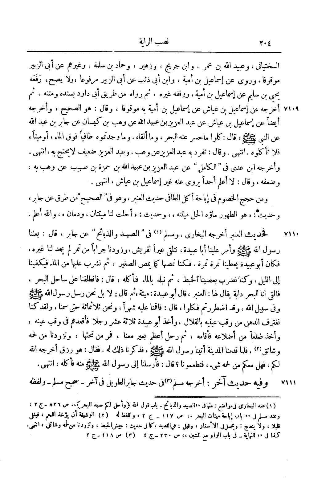 السِّخْتِيَانِيُّ، وَعُبَيْدُ اللَّهِ بْنُ عُمَرَ، وَابْنُ جُرَيْجٍ، وَزُهَيْرٌ، وَحَمَّادُ بْنُ سَلَمَةَ، وَغَيْرُهُمْ عَنْ أَبِي الزُّبَيْرِ مَوْقُوفًا، وَرُوِيَ عَنْ إسْمَاعِيلَ بْنِ أُمَيَّةَ، وَابْنِ أَبِي ذِئْبٍ عَنْ أَبِي الزُّبَيْرِ مَرْفُوعًا، وَلَا يَصِحُّ رَفَعَهُ، يَحْيَى بْنُ سُلَيْمٍ عَنْ إسْمَاعِيلَ بْنِ أُمَيَّةَ، وَوَقَّفَهُ غَيْرُهُ، ثُمَّ رَوَاهُ مِنْ طَرِيقِ أَبِي دَاوُد بِسَنَدِهِ وَمَتْنِهِ، ثُمَّ أَخْرَجَهُ عَنْ إسْمَاعِيلَ بْنِ عَيَّاشٍ عَنْ إسْمَاعِيلَ بْنِ أُمَيَّةَ بِهِ مَوْقُوفًا، وَقَالَ: هو الصحيح، وأخرجه أَيْضًا عَنْ إسْمَاعِيلَ بْنِ عَيَّاشٍ عَنْ عَبْدِ الْعَزِيزِ بْنِ عَبْدِ اللَّهِ عَنْ وَهْبِ بْنِ كَيْسَانَ عَنْ جَابِرِ بْنِ عَبْدِ اللَّهِ عَنْ النَّبِيِّ صَلَّى اللَّهُ عَلَيْهِ وَسَلَّمَ، قَالَ: "كُلُوا مَا حَسَرَ عَنْهُ الْبَحْرُ، وَمَا أَلْقَاهُ، وَمَا وَجَدْتُمُوهُ طَافِيًا فَوْقَ الْمَاءِ، أَوْ مَيْتًا، فَلَا تَأْكُلُوهُ"، انْتَهَى. وَقَالَ: تَفَرَّدَ بِهِ عَبْدُ الْعَزِيزِ عَنْ وَهْبٍ، وَعَبْدُ الْعَزِيزِ ضَعِيفٌ لَا يُحْتَجُّ بِهِ، انْتَهَى. وَأَخْرَجَهُ ابْنُ عَدِيٍّ فِي الْكَامِلِ عَنْ عَبْدِ الْعَزِيزِ بْنِ عَبْدِ اللَّهِ بْنِ حَمْزَةَ بْنِ صُهَيْبٍ عَنْ وَهْبٍ بِهِ، وَضَعَّفَهُ، وَقَالَ: لَا أَعْلَمُ أَحَدًا يَرْوِي عَنْهُ غَيْرَ إسْمَاعِيلَ بْنِ عَيَّاشٍ، انْتَهَى.
