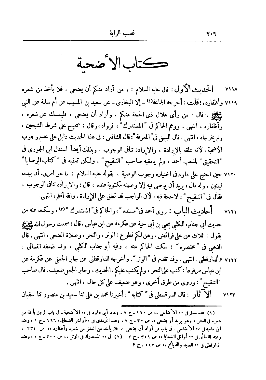 الْحَدِيثُ الْأَوَّلُ: قَالَ عليه السلام: "مَنْ أَرَادَ مِنْكُمْ أَنْ يُضَحِّيَ، فَلَا يَأْخُذْ مِنْ شَعْرِهِ وَأَظْفَارِهِ"، قُلْتُ: أَخْرَجَهُ الْجَمَاعَةُ1 إلَّا الْبُخَارِيَّ عَنْ سَعِيدِ بْنِ الْمُسَيِّبِ عَنْ أُمِّ سَلَمَةَ عَنْ النَّبِيِّ صَلَّى اللَّهُ عَلَيْهِ وَسَلَّمَ، قَالَ: "مَنْ رَأَى هِلَالَ ذِي الْحِجَّةِ مِنْكُمْ، وَأَرَادَ أَنْ يُضَحِّيَ، فَلْيُمْسِكْ عَنْ شَعْرِهِ، وَأَظْفَارِهِ"، انْتَهَى. وَوَهَمَ الْحَاكِمُ فِي الْمُسْتَدْرَكِ، فَرَوَاهُ، وَقَالَ: صَحِيحٌ عَلَى شَرْطِ الشَّيْخَيْنِ، وَلَمْ يُخْرِجَاهُ، انْتَهَى. قَالَ الْبَيْهَقِيُّ فِي الْمَعْرِفَةِ: قَالَ الشَّافِعِيُّ: فِي هَذَا الْحَدِيثِ دَلِيلٌ عَلَى عَدَمِ وُجُوبِ الْأُضْحِيَّةِ، لِأَنَّهُ عَلَّقَهُ بِالْإِرَادَةِ، وَالْإِرَادَةُ تُنَافِي الْوُجُوبَ، وَبِذَلِكَ أَيْضًا اسْتَدَلَّ ابْنُ الْجَوْزِيِّ فِي التَّحْقِيقِ لِمَذْهَبِ أَحْمَدَ، وَلَمْ يَتَعَقَّبْهُ صَاحِبُ التَّنْقِيحِ، وَلَكِنْ تَعَقَّبَهُ فِي كِتَابِ الْوَصَايَا حِينَ احْتَجَّ عَلَى دَاوُد فِي اخْتِيَارِهِ وُجُوبَ الْوَصِيَّةِ، بِقَوْلِهِ عليه السلام: "مَا حَقُّ امْرِئٍ أَنْ يَبِيتَ لَيْلَتَيْنِ، وَلَهُ مَالٌ، يُرِيدُ أَنْ يُوصِيَ فِيهِ إلَّا وَصِيَّتُهُ مَكْتُوبَةٌ عِنْدَهُ"، قَالَ: وَالْإِرَادَةُ تُنَافِي االوجوب، فَقَالَ فِي التَّنْقِيحِ: لَا حُجَّةَ فِيهِ، لِأَنَّ الْوَاجِبَ قَدْ تَعَلَّقَ عَلَى الْإِرَادَةِ، وَاَللَّهُ أَعْلَمُ، انْتَهَى.