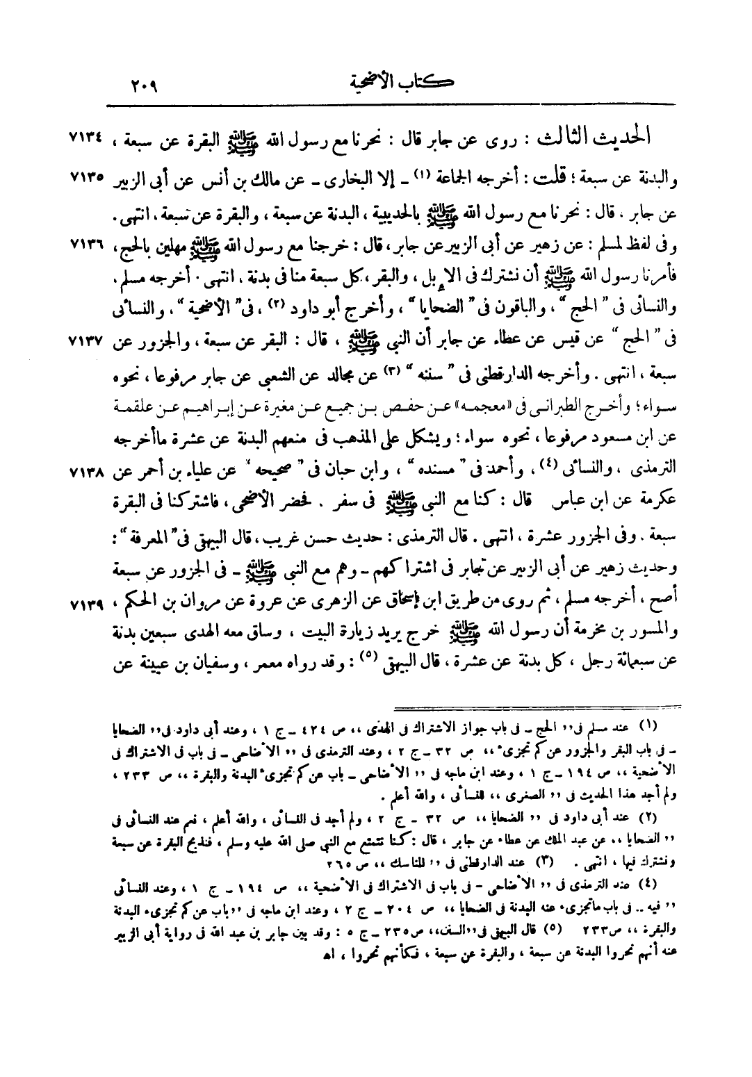 5 عند الترمذي في الأضاحي في باب في الاشتراك في الأضحية ص 194 ج 1، وعند النسائي فيه في باب ما تجزئ عنه البدنة في الضحايا ص 204 ج 2، وعند ابن ماجه في باب عن كم تجزئ البدنة والبقرة ص 233.