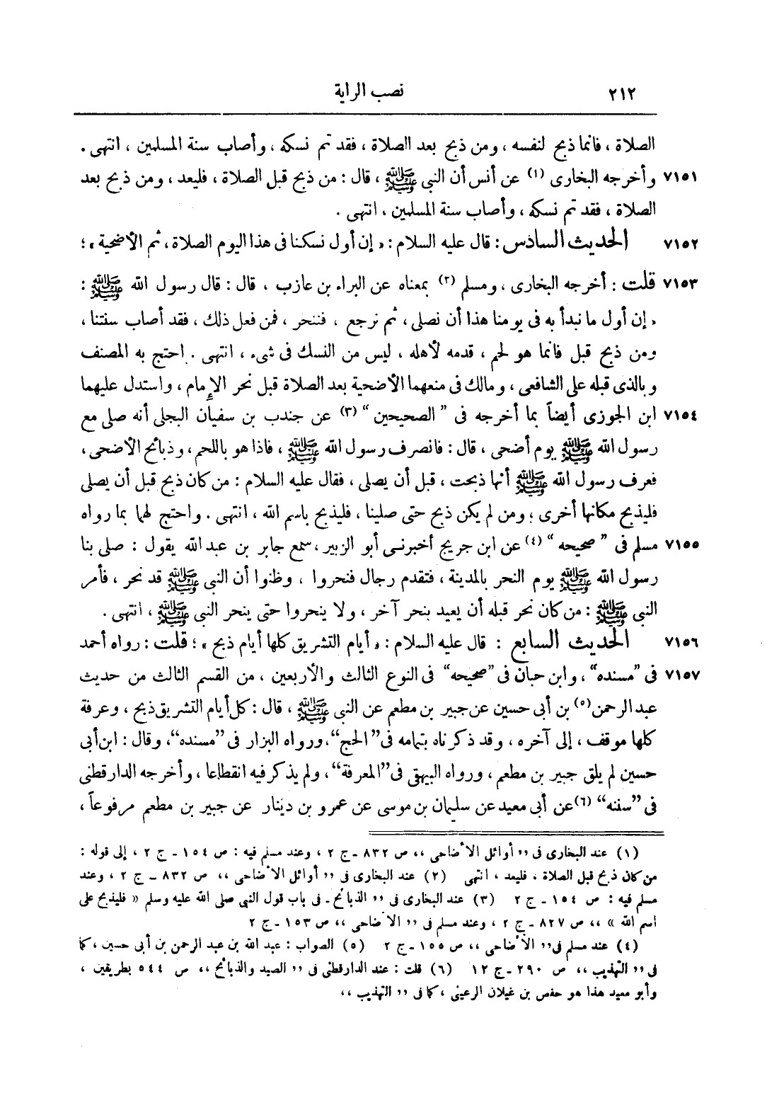 قُلْتُ: أَخْرَجَهُ الْبُخَارِيُّ، وَمُسْلِمٌ2 بِمَعْنَاهُ عَنْ الْبَرَاءِ بْنِ عَازِبٍ، قَالَ: قَالَ رَسُولُ اللَّهِ صَلَّى اللَّهُ عَلَيْهِ وَسَلَّمَ: "إنَّ أَوَّلَ مَا نَبْدَأُ بِهِ فِي يَوْمِنَا هَذَا أَنْ نُصَلِّيَ، ثُمَّ نَرْجِعَ، فَنَنْحَرَ، فَمَنْ فَعَلَ ذَلِكَ، فَقَدْ أَصَابَ سُنَّتَنَا، وَمَنْ ذَبَحَ قَبْلُ فَإِنَّمَا هُوَ لَحْمٌ، قَدَّمَهُ لِأَهْلِهِ، لَيْسَ مِنْ النُّسُكِ فِي شَيْءٍ"، انْتَهَى. احْتَجَّ بِهِ الْمُصَنِّفُ وَبِاَلَّذِي قَبْلَهُ عَلَى الشَّافِعِيِّ، وَمَالِكٍ فِي مَنْعِهِمَا الْأُضْحِيَّةَ بَعْدَ الصَّلَاةِ قَبْلَ نَحْرِ الْإِمَامِ، وَاسْتَدَلَّ عَلَيْهِمَا ابْنُ الْجَوْزِيِّ أَيْضًا بِمَا أَخْرَجَهُ فِي الصَّحِيحَيْنِ3 عَنْ جُنْدُبِ بْنِ سُفْيَانَ الْبَجَلِيِّ أَنَّهُ صَلَّى مَعَ رَسُولِ اللَّهِ صَلَّى اللَّهُ عَلَيْهِ وَسَلَّمَ يَوْمَ أَضْحَى، قَالَ: فَانْصَرَفَ رَسُولُ اللَّهِ صَلَّى اللَّهُ عَلَيْهِ وَسَلَّمَ فَإِذَا هُوَ بِاللَّحْمِ، وَذَبَائِحِ الْأَضْحَى، فَعَرَفَ رَسُولُ اللَّهِ صَلَّى اللَّهُ عَلَيْهِ وَسَلَّمَ أَنَّهَا ذُبِحَتْ، قَبْلَ أَنْ يُصَلِّيَ، فَقَالَ عليه السلام: "مَنْ كَانَ ذَبَحَ قَبْلَ أَنْ يُصَلِّيَ فَلْيَذْبَحْ مَكَانَهَا أُخْرَى، وَمَنْ لَمْ يَكُنْ ذَبَحَ حَتَّى صَلَّيْنَا، فَلْيَذْبَحْ بِاسْمِ اللَّهِ"، انْتَهَى. وَاحْتَجَّ لَهُمَا بِمَا رَوَاهُ مُسْلِمٌ فِي صَحِيحِهِ4 عَنْ ابْنِ جُرَيْجٍ أَخْبَرَنِي، أَبُو الزُّبَيْرِ، سَمِعَ جَابِرَ بْنَ عَبْدِ اللَّهِ يَقُولُ: صَلَّى بِنَا رَسُولُ اللَّهِ صَلَّى اللَّهُ عَلَيْهِ وَسَلَّمَ يَوْمَ النَّحْرِ بِالْمَدِينَةِ، فَتَقَدَّمَ رِجَالٌ فَنَحَرُوا، وَظَنُّوا أَنَّ النَّبِيَّ صَلَّى اللَّهُ عَلَيْهِ وَسَلَّمَ قَدْ نَحَرَ، فَأَمَرَ النَّبِيُّ صَلَّى اللَّهُ عَلَيْهِ وَسَلَّمَ: مَنْ كَانَ نَحَرَ قَبْلَهُ أَنْ يُعِيدَ بِنَحْرٍ آخَرَ، وَلَا تَنْحَرُوا حَتَّى يَنْحَرَ النَّبِيُّ صَلَّى اللَّهُ عَلَيْهِ وَسَلَّمَ، انْتَهَى.