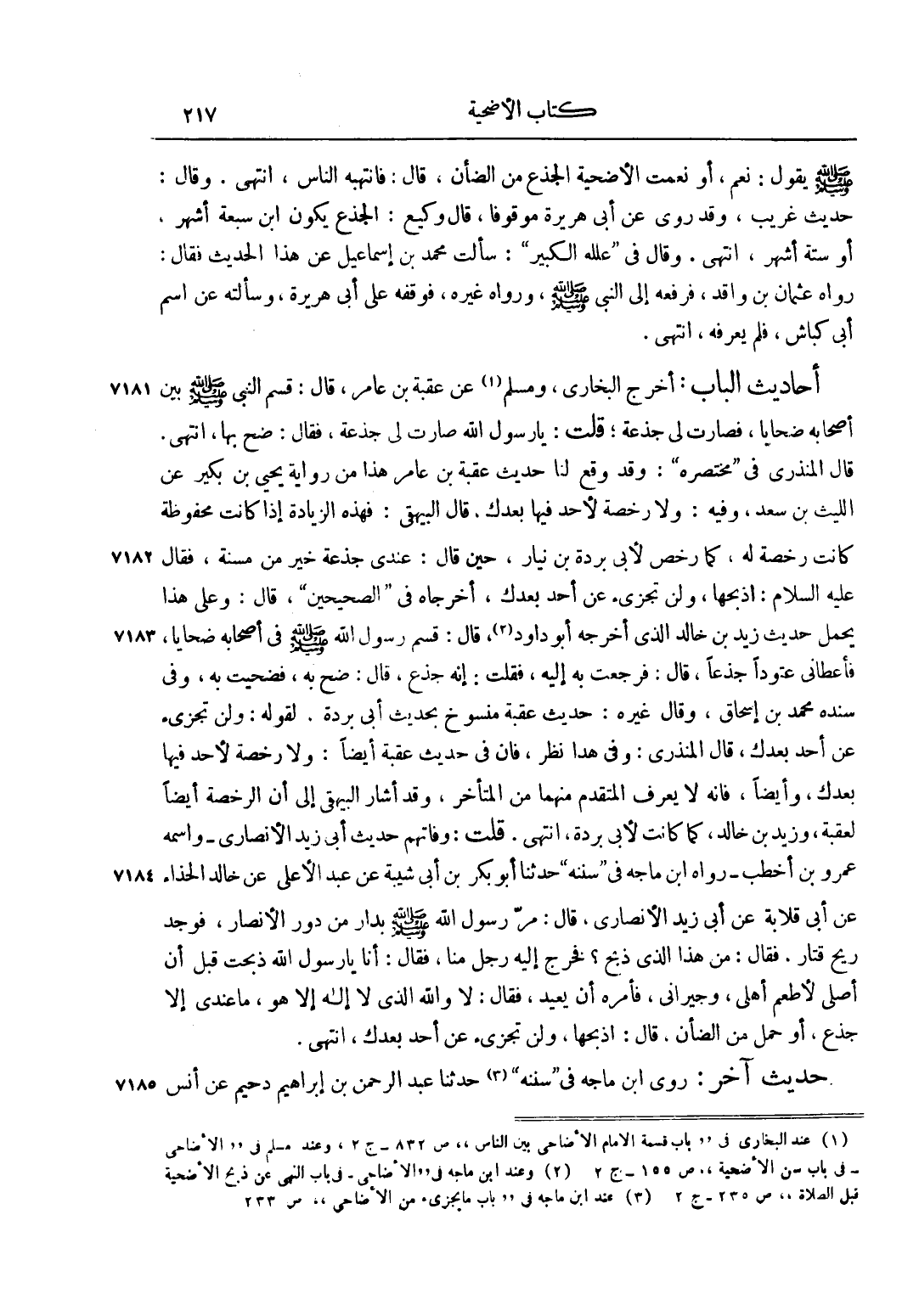 أَحَادِيثُ الْبَابِ: أَخْرَجَ الْبُخَارِيُّ، وَمُسْلِمٌ1 عَنْ عُقْبَةَ بْنِ عَامِرٍ، قَالَ: قَسَّمَ النَّبِيُّ صَلَّى اللَّهُ عَلَيْهِ وَسَلَّمَ بَيْنَ أَصْحَابِهِ ضَحَايَا، فَصَارَتْ لِي جَذَعَةٌ، قُلْت: يَا رَسُولَ اللَّهِ صَارَتْ لِي جَذَعَةٌ، فَقَالَ: "ضَحِّ بِهَا"، انْتَهَى. قَالَ الْمُنْذِرِيُّ فِي مختصره: وقد رقع لَنَا حَدِيثُ عُقْبَةَ بْنِ عَامِرٍ هَذَا مِنْ رِوَايَةِ يَحْيَى بْنِ بُكَيْر عَنْ اللَّيْثِ بْنِ سَعْدٍ، وَفِيهِ: وَلَا رُخْصَةَ لِأَحَدٍ فِيهَا بَعْدَك، قَالَ الْبَيْهَقِيُّ: فَهَذِهِ الزِّيَادَةُ إذَا كَانَتْ مَحْفُوظَةً كَانَتْ رُخْصَةً لَهُ، كَمَا رَخَّصَ لِأَبِي بُرْدَةَ بْنِ نِيَارٍ، حِينَ قَالَ: عِنْدِي جَذَعَةٌ خَيْرٌ مِنْ مُسِنَّةٍ، فَقَالَ عليه السلام: "اذْبَحْهَا، وَلَنْ تُجْزِئَ عَنْ أَحَدٍ بَعْدَك"، أَخْرَجَاهُ فِي الصَّحِيحَيْنِ، قَالَ: وَعَلَى هَذَا يُحْمَلُ حَدِيثُ زَيْدِ بْنِ خَالِدٍ الَّذِي أَخْرَجَهُ أَبُو دَاوُد2 قَالَ: قَسَّمَ رَسُولُ اللَّهِ صَلَّى اللَّهُ عَلَيْهِ وَسَلَّمَ فِي أَصْحَابِهِ ضَحَايَا، فَأَعْطَانِي عَتُودًا جَذَعًا، قَالَ: فَرَجَعْتُ بِهِ إلَيْهِ، فَقُلْت: إنَّهُ جَذَعٌ، قَالَ: "ضَحِّ بِهِ"، فَضَحَّيْتُ بِهِ، وَفِي سَنَدِهِ مُحَمَّدُ بْنُ إسْحَاقَ، وَقَالَ غَيْرُهُ: حَدِيثُ عُقْبَةَ مَنْسُوخٌ بِحَدِيثِ أَبِي بُرْدَةَ، لِقَوْلِهِ: "وَلَنْ تُجْزِئَ عَنْ أَحَدٍ بَعْدَك"، قَالَ الْمُنْذِرِيُّ: وَفِي هذا نظر، فإن ففي حَدِيثِ عُقْبَةَ أَيْضًا: وَلَا رُخْصَةَ لِأَحَدٍ فِيهَا بَعْدَك، وَأَيْضًا، فَإِنَّهُ لَا يُعْرَفُ الْمُتَقَدِّمُ مِنْهُمَا مِنْ الْمُتَأَخِّرِ، وَقَدْ أَشَارَ الْبَيْهَقِيُّ إلَى أن الرخضة أَيْضًا لِعُقْبَةَ، وَزَيْدِ بْنِ خَالِدٍ، كَمَا كَانَتْ لِأَبِي بُرْدَةَ، انْتَهَى. قُلْت: وَفَاتَهُمْ حديث أبي زيد الْأَنْصَارِيِّ وَاسْمُهُ عَمْرُو بْنُ أَخْطَبَ رَوَاهُ ابْنُ مَاجَهْ فِي سُنَنِهِ حَدَّثَنَا أَبُو بَكْرِ بْنُ أَبِي شَيْبَةَ عَنْ عَبْدِ الْأَعْلَى عَنْ خَالِدٍ الْحَذَّاءِ عَنْ أَبِي قِلَابَةَ عَنْ أَبِي زَيْدٍ الْأَنْصَارِيِّ، قَالَ: مَرَّ رَسُولُ اللَّهِ صَلَّى اللَّهُ عَلَيْهِ وَسَلَّمَ بِدَارٍ مِنْ دُورِ الأنصار، فوجد ريح قتارة فَقَالَ: "مَنْ هَذَا الَّذِي ذَبَحَ"؟ فَخَرَجَ إلَيْهِ رَجُلٌ مِنَّا، فَقَالَ: أَنَا يَا رَسُولَ اللَّهِ ذَبَحْتُ قَبْلَ أَنْ أُصَلِّيَ لِأُطْعِمَ أَهْلِي، وَجِيرَانِي، فَأَمَرَهُ أَنْ يُعِيدَ، فَقَالَ: لَا وَاَللَّهِ الَّذِي لَا إلَهَ إلَّا هُوَ، مَا عِنْدِي إلَّا جَذَعٌ، أَوْ حَمَلٌ مِنْ الضَّأْنِ، قَالَ: "اذْبَحْهَا، وَلَنْ تُجْزِئَ عَنْ أَحَدٍ بَعْدَك"، انْتَهَى.