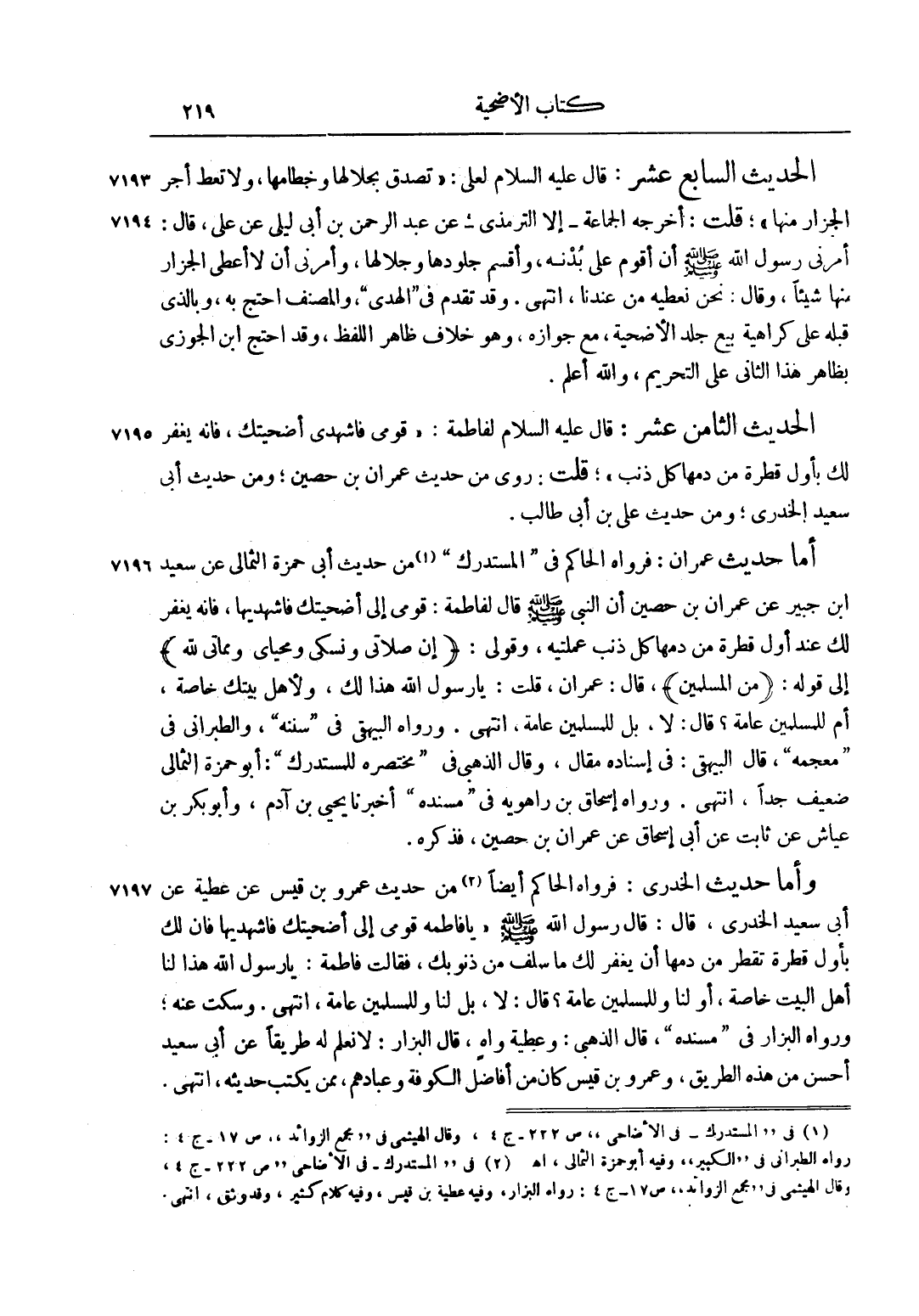 أَمَّا حَدِيثُ عِمْرَانَ: فَرَوَاهُ الْحَاكِمُ فِي الْمُسْتَدْرَكِ1 مِنْ حَدِيثِ أَبِي حَمْزَةَ الثُّمَالِيِّ عَنْ سَعِيدِ بْنِ جُبَيْرٍ عَنْ عِمْرَانَ بْنِ حُصَيْنٍ أَنَّ النَّبِيَّ صَلَّى اللَّهُ عَلَيْهِ وَسَلَّمَ قَالَ لِفَاطِمَةَ: "قُومِي إلَى أُضْحِيَّتِك فَاشْهَدِيهَا، فَإِنَّهُ يُغْفَرُ لَكِ عِنْدَ أَوَّلِ قَطْرَةٍ مِنْ دَمِهَا كُلُّ ذَنْبٍ عَمِلْتِيهِ، وَقُولِي: " {إنَّ صَلَاتِي وَنُسُكِي وَمَحْيَايَ وَمَمَاتِي لِلَّهِ} إلى قوله: {مِنَ الْمُسْلِمِينَ} "، قَالَ: عِمْرَانُ، قُلْت: يَا رَسُولَ اللَّهِ هَذَا لَك، وَلِأَهْلِ بَيْتِك خَاصَّةً، أَمْ لِلْمُسْلِمِينَ عَامَّةً؟ قَالَ: "لَا، بَلْ لِلْمُسْلِمِينَ عَامَّةً"، انْتَهَى. وَرَوَاهُ الْبَيْهَقِيُّ فِي سُنَنِهِ، وَالطَّبَرَانِيُّ فِي مُعْجَمِهِ، قَالَ الْبَيْهَقِيُّ: فِي إسْنَادِهِ مَقَالٌ، وَقَالَ الذَّهَبِيُّ فِي مُخْتَصَرِهِ لِلْمُسْتَدْرَكِ: أَبُو حَمْزَةَ الثُّمَالِيُّ ضَعِيفٌ جِدًّا، انْتَهَى. وَرَوَاهُ إسْحَاقُ بْنُ رَاهْوَيْهِ فِي مُسْنَدِهِ أَخْبَرَنَا يَحْيَى بْنُ آدَمَ، وَأَبُو بَكْرِ بْنُ عَيَّاشٍ عَنْ ثَابِتٍ عَنْ أَبِي إسْحَاقَ عَنْ عِمْرَانَ بْنِ حُصَيْنٍ، فَذَكَرَهُ.