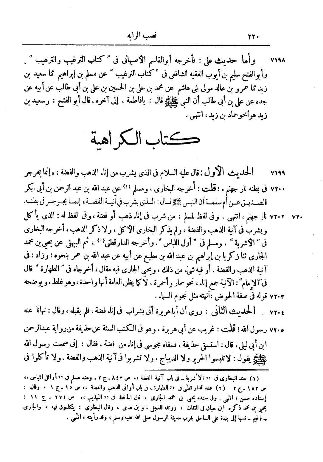 الْحَدِيثُ الثَّانِي: رُوِيَ أَنَّ أَبَا هُرَيْرَةَ أُتِيَ بِشَرَابٍ فِي إنَاءِ فِضَّةٍ،، فَلَمْ يَقْبَلْهُ، وَقَالَ: نَهَانَا عَنْهُ رَسُولُ اللَّهِ، قُلْت: غَرِيبٌ عَنْ أَبِي هُرَيْرَةَ، وَهُوَ فِي الْكُتُبِ السِّتَّةِ عَنْ حُذَيْفَةَ مِنْ رِوَايَةِ عَبْدِ الرَّحْمَنِ بْنِ أَبِي لَيْلَى، قَالَ: اسْتَسْقَى حُذَيْفَةُ، فَسَقَاهُ مَجُوسِيٌّ فِي إنَاءٍ مِنْ فِضَّةٍ، فَقَالَ: إنِّي سَمِعْتُ رَسُولُ اللَّهِ صَلَّى اللَّهُ عَلَيْهِ وَسَلَّمَ يَقُولُ: "لَا تَلْبَسُوا الْحَرِيرَ وَلَا الدِّيبَاجَ، وَلَا تَشْرَبُوا فِي آنِيَةِ الذَّهَبِ وَالْفِضَّةِ، وَلَا تَأْكُلُوا فِي