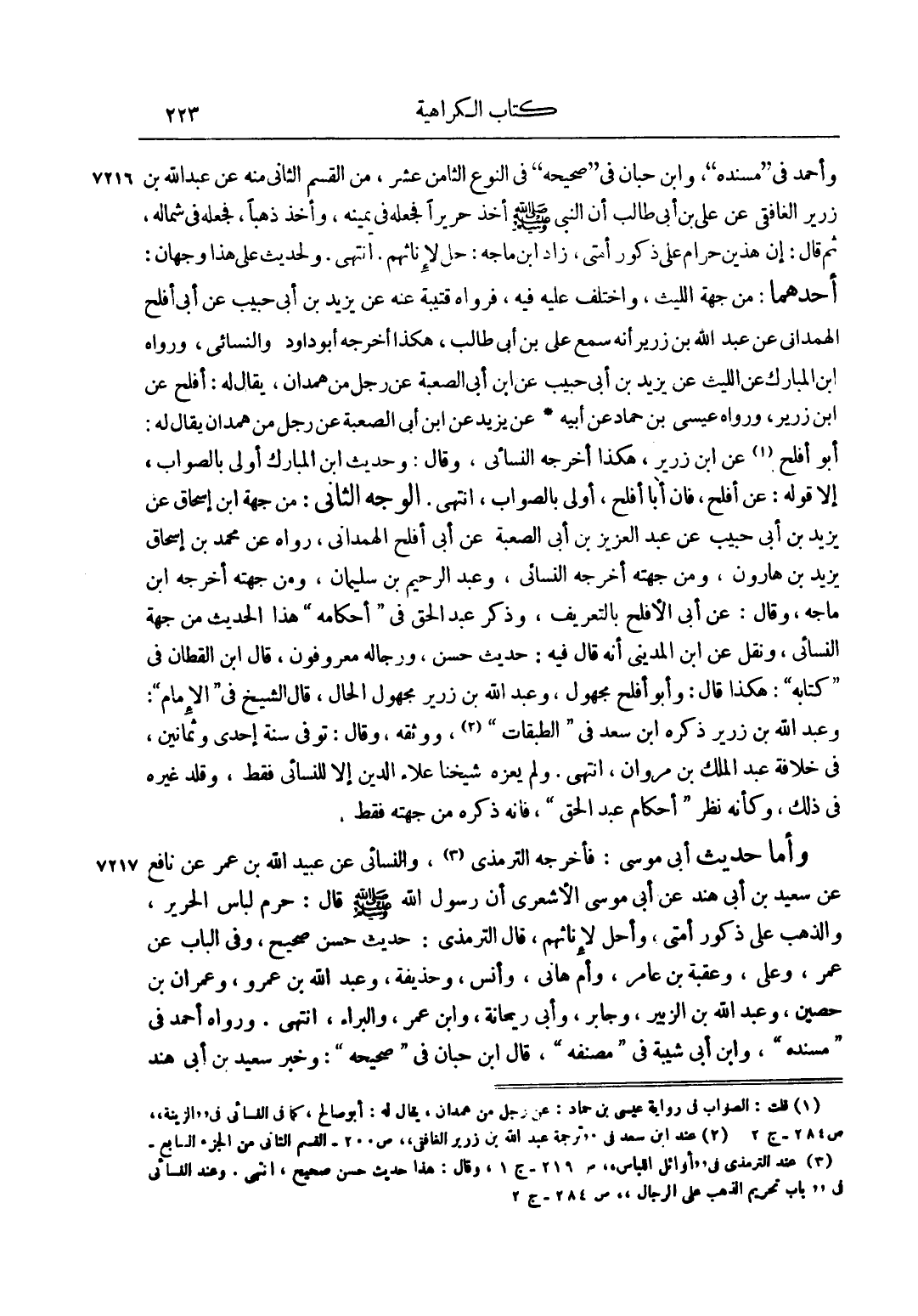 وَأَحْمَدُ فِي مُسْنَدِهِ، وَابْنُ حِبَّانَ فِي صَحِيحِهِ فِي النَّوْعِ الثَّامِنِ عَشَرَ، مِنْ الْقِسْمِ الثَّانِي مِنْهُ عَنْ عَبْدِ اللَّهِ بْنِ زُرَيْرٍ الْغَافِقِيِّ عَنْ عَلِيِّ بْنِ أَبِي طَالِبٍ أَنَّ النَّبِيَّ صَلَّى اللَّهُ عَلَيْهِ وَسَلَّمَ أَخَذَ حَرِيرًا فَجَعَلَهُ فِي يَمِينِهِ، وَأَخَذَ ذَهَبًا، فَجَعَلَهُ فِي شِمَالِهِ، ثُمَّ قَالَ: "إنَّ هَذَيْنِ حَرَامٌ عَلَى ذُكُورِ أُمَّتِي"، زَادَ ابْنُ مَاجَهْ: "حِلٌّ لِإِنَاثِهِمْ". انْتَهَى. وَلِحَدِيثِ عَلِيٍّ هَذَا وَجْهَانِ: أَحَدُهُمَا: مِنْ جِهَةِ اللَّيْثِ، وَاخْتُلِفَ عَلَيْهِ فِيهِ، فَرَوَاهُ قُتَيْبَةُ عَنْهُ عَنْ يَزِيدَ بْنِ أَبِي حَبِيبٍ عَنْ أَبِي أَفْلَحَ الْهَمْدَانِيِّ عَنْ عَبْدِ اللَّهِ بْنِ زُرَيْرٍ أَنَّهُ سَمِعَ عَلِيَّ بْنَ أَبِي طَالِبٍ هَكَذَا، هَكَذَا أَخْرَجَهُ أَبُو دَاوُد، وَالنَّسَائِيُّ، وَرَوَاهُ ابْنُ الْمُبَارَكِ عَنْ اللَّيْثِ عَنْ يَزِيدَ بْنِ أَبِي حَبِيبٍ عَنْ ابْنِ أَبِي الصَّعْبَةَ عَنْ رَجُلٍ مِنْ هَمْدَانَ، يُقَالُ لَهُ: أَفْلَحُ عَنْ ابْنِ زُرَيْرٍ، وَرَوَاهُ عِيسَى بْنُ حَمَّادٍ عَنْ أَبِيهِ عَنْ يَزِيدَ عَنْ ابْنِ أَبِي الصَّعْبَةِ عَنْ رَجُلٍ مِنْ هَمْدَانَ يُقَالُ لَهُ: أَبُو أَفْلَحَ1 عَنْ ابْنِ زُرَيْرٍ، هَكَذَا أَخْرَجَهُ النَّسَائِيُّ، وَقَالَ: وَحَدِيثُ ابْنِ الْمُبَارَكِ أَوْلَى بِالصَّوَابِ، إلَّا قَوْلَهُ: عَنْ أَفْلَحَ، فَإِنَّ أَبَا أَفْلَحَ، أَوْلَى بِالصَّوَابِ، انْتَهَى. الْوَجْهُ الثَّانِي: مِنْ جِهَةِ ابْنِ إسْحَاقَ عَنْ يَزِيدَ بْنِ أَبِي حَبِيبٍ عَنْ عَبْدِ الْعَزِيزِ بْنِ أَبِي الصَّعْبَةِ عَنْ أَبِي أَفْلَحَ الْهَمْدَانِيِّ، رَوَاهُ عَنْ مُحَمَّدِ بْنِ إسْحَاقَ يَزِيدُ بْنُ هَارُونَ، وَمِنْ جِهَتِهِ أَخْرَجَهُ النَّسَائِيُّ، وَعَبْدُ الرَّحِيمِ بْنُ سُلَيْمَانَ، وَمِنْ جِهَتِهِ أَخْرَجَهُ ابْنُ مَاجَهْ، وَقَالَ: عَنْ أَبِي الْأَفْلَحِ بِالتَّعْرِيفِ، وَذَكَرَ عَبْدُ الْحَقِّ فِي أَحْكَامِهِ هَذَا الْحَدِيثَ مِنْ جِهَةِ النَّسَائِيّ، وَنَقَلَ عَنْ ابْنِ الْمَدِينِيِّ أَنَّهُ قَالَ فِيهِ: حَدِيثٌ حَسَنٌ، وَرِجَالُهُ مَعْرُوفُونَ، قَالَ ابْنُ الْقَطَّانِ فِي كِتَابِهِ: هَكَذَا قَالَ: وَأَبُو أَفْلَحَ مَجْهُولٌ، وَعَبْدُ اللَّهِ بْنُ زُرَيْرٍ مَجْهُولُ الْحَالِ، قَالَ الشَّيْخُ فِي الْإِمَامِ: وَعَبْدُ اللَّهِ بْنُ زُرَيْرٍ ذَكَرَهُ ابْنُ سَعْدٍ فِي الطَّبَقَاتِ2 وَوَثَّقَهُ، وَقَالَ: تُوُفِّيَ سَنَةَ إحْدَى وَثَمَانِينَ، فِي خِلَافَةِ عَبْدِ الْمَلِكِ بْنِ مَرْوَانَ، انْتَهَى. وَلَمْ يَعْزُهُ شَيْخُنَا عَلَاءُ الدِّينِ إلَّا لِلنَّسَائِيِّ فَقَطْ، وَقَلَّدَ غَيْرَهُ فِي ذَلِكَ، وَكَأَنَّهُ نَظَرَ أَحْكَامَ عَبْدِ الْحَقِّ، فَإِنَّهُ ذَكَرَهُ مِنْ جِهَتِهِ فَقَطْ.