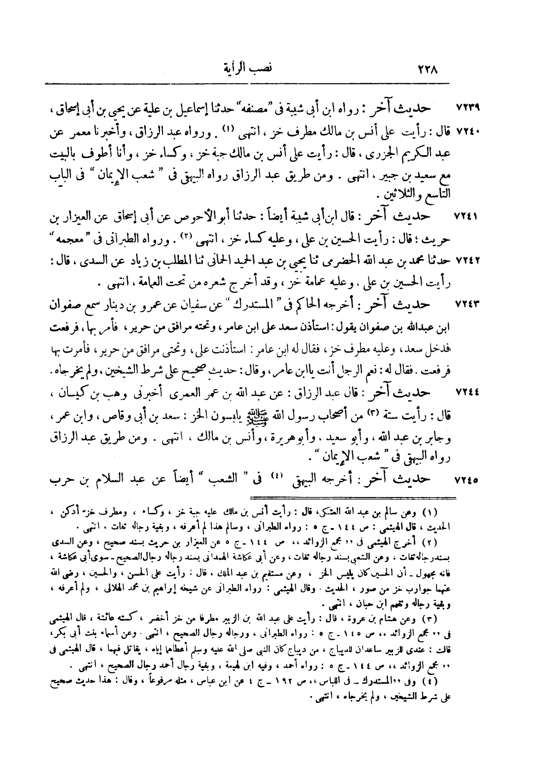حَدِيثٌ آخَرُ: رَوَاهُ ابْنُ أَبِي شَيْبَةَ فِي مُصَنَّفِهِ حَدَّثَنَا إسْمَاعِيلُ ابْنُ عُلَيَّةَ عَنْ يَحْيَى بْنِ أَبِي إسْحَاقَ، قَالَ: رَأَيْتُ عَلَى أَنَسِ بْنِ مَالِكٍ مُطْرَفَ خَزٍّ، انْتَهَى1 وَرَوَاهُ عَبْدُ الرَّزَّاقِ، وَأَخْبَرَنَا مَعْمَرٌ عَنْ عَبْدِ الْكَرِيمِ الْجَزَرِيِّ، قَالَ: رَأَيْت عَلَى أَنَسِ بْنِ مَالِكٍ جُبَّةَ خَزٍّ، وَكِسَاءَ خَزٍّ، وَأَنَا أَطُوفُ بِالْبَيْتِ مَعَ سَعِيدِ بْنِ جُبَيْرٍ، انْتَهَى. وَمِنْ طَرِيقِ عَبْدِ الرَّزَّاقِ رَوَاهُ الْبَيْهَقِيُّ فِي شُعَبِ الْإِيمَانِ فِي الْبَابِ التَّاسِعِ وَالثَّلَاثِينَ.