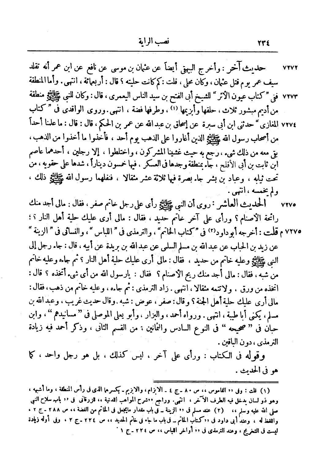 حَدِيثٌ آخَرُ: وَأَخْرَجَ الْبَيْهَقِيُّ أَيْضًا عَنْ عُثْمَانَ بْنِ مُوسَى عَنْ نَافِعٍ عَنْ ابْنِ عُمَرَ أَنَّهُ تَقَلَّدَ سَيْفَ عُمَرَ يَوْمَ قَتْلِ عُثْمَانَ، وَكَانَ مُحَلًّى، قُلْتُ: كَمْ كَانَتْ حِلْيَتُهُ؟ قَالَ: أَرْبَعُمِائَةٍ، انْتَهَى. وَأَمَّا الْمِنْطَقَةُ فَفِي كِتَابُ عُيُونِ الْأَثَرِ لِلشَّيْخِ أَبِي الْفَتْحِ بْنِ سَيِّدِ النَّاسِ الْيَعْمُرِيِّ، قَالَ: وَكَانَ لِلنَّبِيِّ صَلَّى اللَّهُ عَلَيْهِ وَسَلَّمَ مِنْطَقَةٌ مِنْ أَدِيمٍ مَنْشُورٍ ثَلَاثٌ، حِلَقُهَا وَإِبْزِيمهَا1، وَطَرَفُهَا فِضَّةٌ، انْتَهَى. وَرَوَى الْوَاقِدِيُّ فِي كِتَابِ الْمَغَازِي حَدَّثَنِي ابْنُ أَبِي سَبْرَةَ عَنْ إسْحَاقَ بْنِ عَبْدِ اللَّهِ عَنْ عُمَرَ بْنِ الْحَكَمِ، قَالَ: قَالَ: مَا عَلِمْنَا أَحَدًا مِنْ أَصْحَابِ رَسُولِ اللَّهِ صَلَّى اللَّهُ عَلَيْهِ وَسَلَّمَ الَّذِينَ أَغَارُوا عَلَى الذَّهَبِ يَوْمَ أُحُدٍ، فَأَخَذُوا مَا أَخَذُوا مِنْ الذَّهَبِ، بَقِيَ مَعَهُ مِنْ ذَلِكَ شَيْءٌ، رَجَعَ بِهِ حَيْثُ غَشِيَنَا الْمُشْرِكُونَ، وَاخْتَلَطُوا، إلَّا رَجُلَيْنِ، أَحَدُهُمَا عَاصِمُ بْنُ ثَابِتِ بْنِ أَبِي الْأَفْلَحِ، جَاءَ بِمِنْطَقَةٍ وَحْدَهَا فِي الْعَسْكَرِ، فِيهَا خَمْسُونَ دِينَارًا، شَدَّهَا عَلَى حَقْوَيْهِ، مِنْ تَحْتِ ثِيَابِهِ، وَعَبَّادُ بْنُ بِشْرٍ جَاءَ بِصُرَّةٍ فِيهَا ثَلَاثَةَ عَشَرَ مِثْقَالًا، فَنَفَلَهُمَا رَسُولُ اللَّهِ صَلَّى اللَّهُ عَلَيْهِ وَسَلَّمَ ذَلِكَ، وَلَمْ يُخَمِّسْهُ، انْتَهَى.
