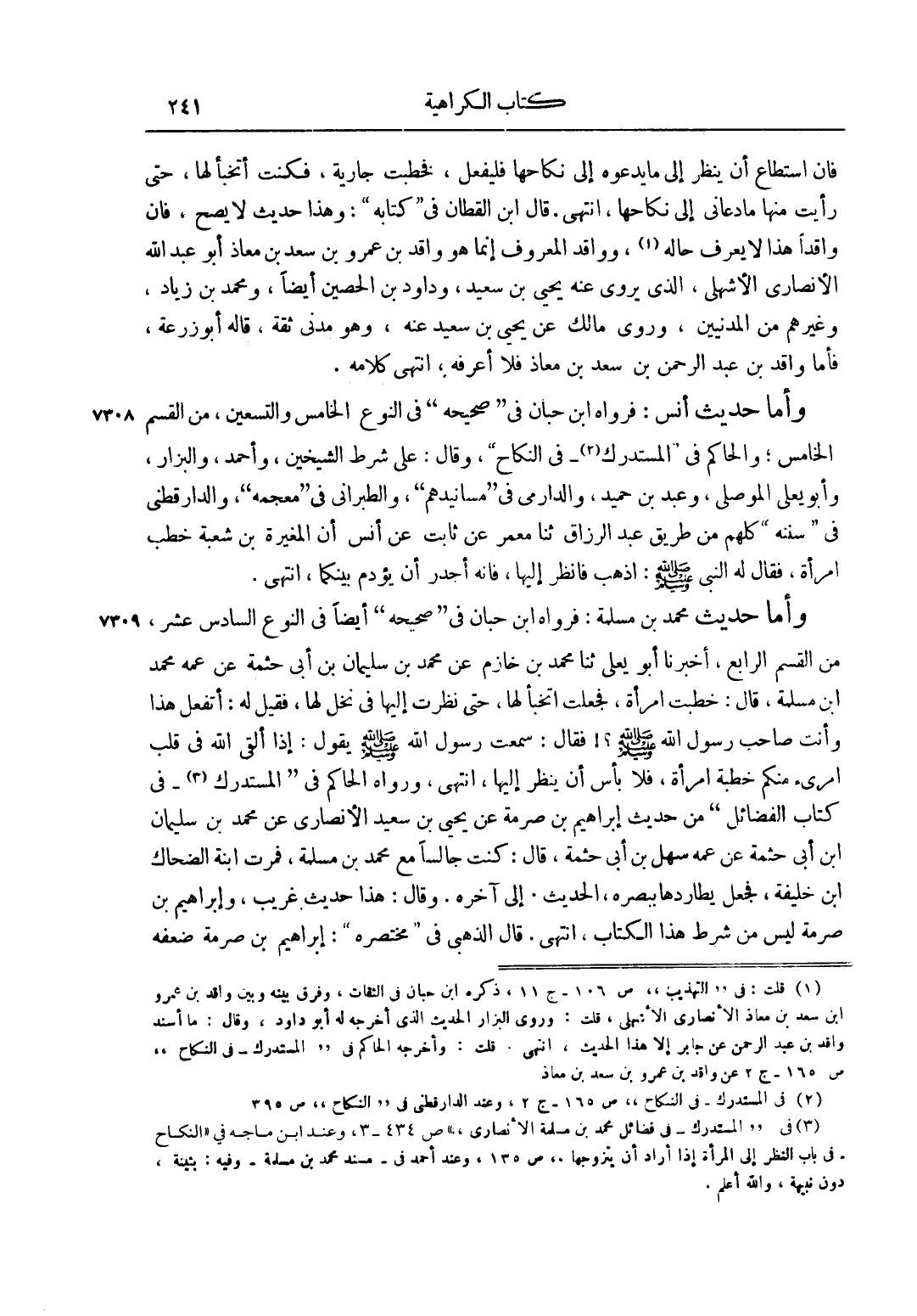 فَإِنْ اسْتَطَاعَ أَنْ يَنْظُرَ إلَى مَا يَدْعُوهُ إلَى نِكَاحِهَا فَلْيَفْعَلْ"، فَخَطَبْتُ جَارِيَةً، فَكُنْتُ أَتَخَبَّأُ لَهَا، حَتَّى رَأَيْتُ مِنْهَا مَا دَعَانِي إلَى نِكَاحِهَا، انْتَهَى. قَالَ ابْنُ الْقَطَّانِ فِي كِتَابِهِ: وَهَذَا حَدِيثٌ لَا يَصِحُّ، فَإِنَّ وَاقِدًا هَذَا لَا يُعْرَفُ حَالُهُ1 وَوَاقِدٌ الْمَعْرُوفُ إنَّمَا هُوَ وَاقِدُ بْنُ عَمْرِو بْنِ سَعْدِ بْنِ مُعَاذٍ أَبُو عَبْدِ اللَّهِ الْأَنْصَارِيُّ الْأَشْهَلِيُّ، الَّذِي يَرْوِي عَنْهُ يَحْيَى بْنُ سَعِيدٍ، وَدَاوُد بْنُ الْحُصَيْنِ أَيْضًا، وَمُحَمَّدُ بْنُ زِيَادٍ، وَغَيْرُهُمْ مِنْ الْمَدَنِيِّينَ، وَرَوَى مَالِكٌ عَنْ يَحْيَى بْنِ سَعِيدٍ عَنْهُ، وَهُوَ مَدَنِيٌّ ثِقَةٌ، قَالَهُ أَبُو زُرْعَةَ، فَأَمَّا وَاقِدُ بْنُ عَبْدِ الرَّحْمَنِ بْنِ سَعْدِ بْنِ مُعَاذٍ فَلَا أَعْرِفُهُ، انْتَهَى كَلَامُهُ.