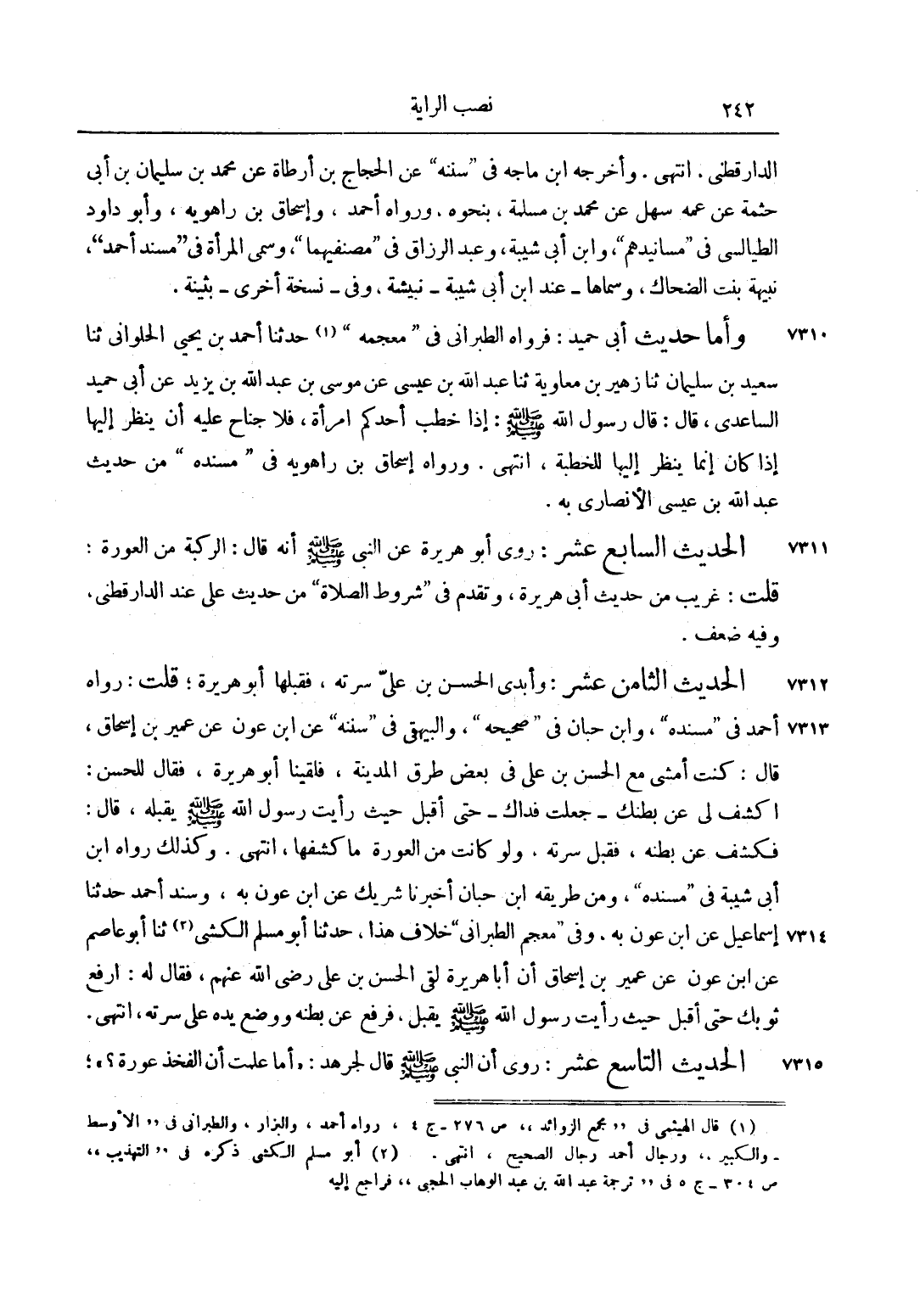 الْحَدِيثُ الثَّامِنُ عَشَرَ: وَأَبْدَى الْحُسَيْنُ بْنُ عَلِيٍّ سُرَّتَهُ، فَقَبَّلَهَا أَبُو هُرَيْرَةَ، قُلْت: رَوَاهُ أَحْمَدُ فِي مُسْنَدِهِ، وَابْنُ حِبَّانَ فِي صَحِيحِهِ، وَالْبَيْهَقِيُّ فِي سُنَنِهِ عَنْ ابن عَوْنٍ عَنْ عُمَيْرِ بْنِ إسْحَاقَ، قَالَ: كُنْتُ أَمْشِي مَعَ الْحَسَنِ بْنِ عَلِيٍّ فِي بَعْضِ طُرُقِ الْمَدِينَةِ، فَلَقِيَنَا أَبُو هُرَيْرَةَ، فَقَالَ لِلْحَسَنِ: اكْشِفْ لِي عَنْ بَطْنِك جُعِلْتُ فِدَاك حَتَّى أُقَبِّلَ حَيْثُ رَأَيْتُ رَسُولَ اللَّهِ صَلَّى اللَّهُ عَلَيْهِ وَسَلَّمَ يُقَبِّلُهُ، قَالَ: فَكَشَفَ عَنْ بَطْنِهِ، فَقَبَّلَ سُرَّتَهُ، وَلَوْ كَانَتْ مِنْ الْعَوْرَةِ مَا كَشَفَهَا، انْتَهَى. وَكَذَلِكَ رَوَاهُ ابْنُ أَبِي شَيْبَةَ فِي مُسْنَدِهِ، وَمِنْ طَرِيقِهِ ابْنُ حِبَّانَ أَخْبَرَنَا شَرِيكٌ عَنْ ابْنِ عَوْنٍ بِهِ، وَسَنَدُ أَحْمَدَ حَدَّثَنَا إسْمَاعِيلُ عَنْ ابْنِ عَوْنٍ بِهِ، وَفِي مُعْجَمِ الطَّبَرَانِيِّ خِلَافُ هَذَا، حَدَّثَنَا أَبُو مُسْلِمٍ الْكَشِّيُّ2 ثَنَا أَبُو عَاصِمٍ عَنْ ابْنِ عَوْنٍ عَنْ عُمَيْرِ بْنِ إسْحَاقَ أَنَّ أَبَا هُرَيْرَةَ لَقِيَ الْحَسَنَ بْنَ عَلِيٍّ رضي الله عنهم، فَقَالَ لَهُ: ارْفَعْ ثَوْبَك حَتَّى أُقَبِّلَ حَيْثُ رَأَيْتُ رَسُولَ اللَّهِ صَلَّى اللَّهُ عَلَيْهِ وَسَلَّمَ يُقَبِّلُ، فَرَفَعَ عَنْ بَطْنِهِ وَوَضَعَ يَدَهُ عَلَى سُرَّتِهِ، انْتَهَى.