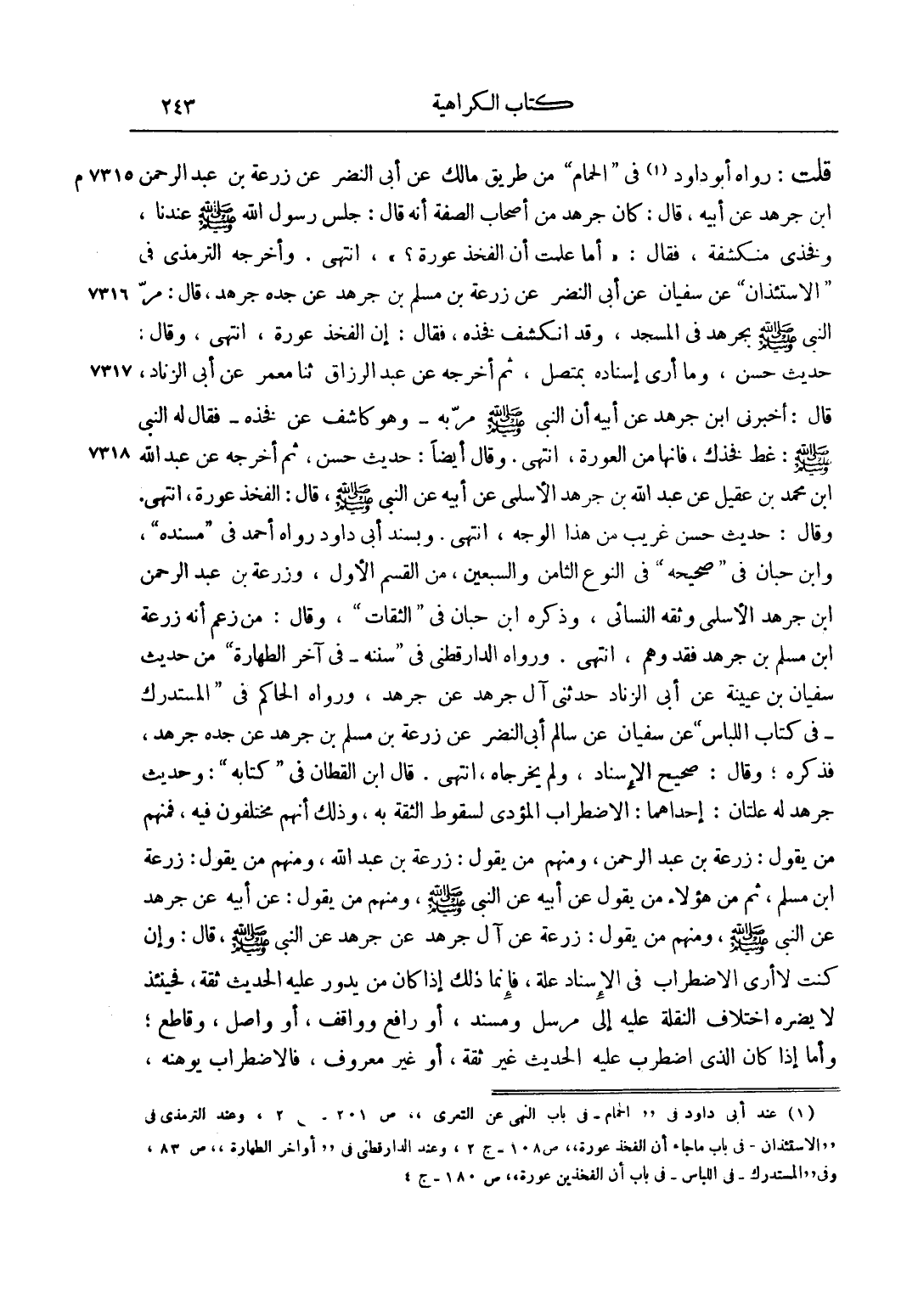 قُلْت: رَوَاهُ أَبُو دَاوُد1 فِي الْحَمَّامِ مِنْ طَرِيقِ مَالِكٍ عَنْ أَبِي النَّضْرِ عَنْ زُرْعَةَ بْنِ عَبْدِ الرَّحْمَنِ بْنِ جَرْهَدٍ عن أبيه، قال: كان جَرْهَدٍ مِنْ أَصْحَابِ الصُّفَّةِ أَنَّهُ قَالَ: جَلَسَ رَسُولُ اللَّهِ صَلَّى اللَّهُ عَلَيْهِ وَسَلَّمَ عِنْدَنَا، وَفَخِذِي مُنْكَشِفَةٌ، فَقَالَ: "أَمَا عَلِمْت أَنَّ الْفَخِذَ عَوْرَةٌ"؟ ، انْتَهَى. وَأَخْرَجَهُ التِّرْمِذِيُّ فِي الِاسْتِئْذَانِ عَنْ سُفْيَانَ عَنْ أَبِي النَّضْرِ عَنْ زُرْعَةَ بْنِ مُسْلِمِ بْنِ جَرْهَدٍ عَنْ جَدِّهِ جَرْهَدٍ، قَالَ: مَرَّ النَّبِيُّ صَلَّى اللَّهُ عَلَيْهِ وَسَلَّمَ بِجَرْهَدٍ فِي الْمَسْجِدِ، وَقَدْ انْكَشَفَ فَخِذُهُ، فَقَالَ: "إنَّ الْفَخِذَ عَوْرَةٌ"، انْتَهَى. وَقَالَ: حَدِيثٌ حَسَنٌ، وَمَا أَرَى إسْنَادَهُ بِمُتَّصِلٍ، ثُمَّ أَخْرَجَهُ عَنْ عَبْدِ الرَّزَّاقِ ثَنَا مَعْمَرٌ عَنْ أَبِي الزِّنَادِ، قَالَ: أَخْبَرَنِي ابْنُ جَرْهَدٍ عَنْ أَبِيهِ أَنَّ النَّبِيَّ صَلَّى اللَّهُ عَلَيْهِ وَسَلَّمَ مَرَّ بِهِ وَهُوَ كَاشِفٌ عَنْ فَخِذِهِ فَقَالَ لَهُ النَّبِيُّ صَلَّى اللَّهُ عَلَيْهِ وَسَلَّمَ: "غَطِّ فَخِذَك، فَإِنَّهَا مِنْ الْعَوْرَةِ"، انْتَهَى. وَقَالَ أَيْضًا: حَدِيثٌ حَسَنٌ، ثُمَّ أَخْرَجَهُ عَنْ عَبْدِ اللَّهِ بْنِ مُحَمَّدِ بْنِ عَقِيلٍ عَنْ عَبْدِ اللَّهِ بْنِ جَرْهَدٍ الْأَسْلَمِيِّ عَنْ أَبِيهِ عَنْ النَّبِيِّ صَلَّى اللَّهُ عَلَيْهِ وَسَلَّمَ، قَالَ: "الْفَخِذُ عَوْرَةٌ"، انْتَهَى. وَقَالَ: حَدِيثٌ حَسَنٌ غَرِيبٌ مِنْ هَذَا الْوَجْهِ، انْتَهَى. وَبِسَنَدِ أَبِي دَاوُد رَوَاهُ أَحْمَدُ فِي مُسْنَدِهِ، وَابْنُ حِبَّانَ فِي صَحِيحِهِ فِي النَّوْعِ الثَّامِنِ وَالسَّبْعِينَ، مِنْ الْقِسْمِ الْأَوَّلِ، وَزُرْعَةُ بْنُ عَبْدِ الرَّحْمَنِ بْنِ جَرْهَدٍ الْأَسْلَمِيُّ وَثَّقَهُ النَّسَائِيّ، وَذَكَرَهُ ابْنُ حِبَّانَ فِي الثِّقَاتِ، وَقَالَ: مَنْ زَعَمَ أَنَّهُ زُرْعَةُ بْنُ مُسْلِمِ بْنِ جَرْهَدٍ فَقَدْ وَهَمَ، انْتَهَى. وَرَوَاهُ الدَّارَقُطْنِيُّ فِي سُنَنِهِ فِي آخِرِ الطَّهَارَةِ مِنْ حَدِيثِ سُفْيَانَ بْنِ عُيَيْنَةَ عَنْ أَبِي الزِّنَادِ حَدَّثَنِي آلُ جَرْهَدٍ عَنْ جَرْهَدٍ، وَرَوَاهُ الْحَاكِمُ فِي الْمُسْتَدْرَكِ فِي كِتَابِ اللِّبَاسِ عَنْ سُفْيَانَ عَنْ سَالِمٍ أَبِي النَّضْرِ عَنْ زُرْعَةَ بْنِ مُسْلِمِ بْنِ جَرْهَدٍ عَنْ جَدِّهِ جَرْهَدٍ، فَذَكَرَهُ، وَقَالَ: صَحِيحُ الْإِسْنَادِ، وَلَمْ يُخْرِجَاهُ، انْتَهَى. قَالَ ابْنُ الْقَطَّانِ فِي كِتَابِهِ: وَحَدِيثُ جَرْهَدٍ لَهُ عِلَّتَانِ: إحْدَاهُمَا: الِاضْطِرَابُ الْمُؤَدِّي لِسُقُوطِ الثِّقَةِ بِهِ، وَذَلِكَ أَنَّهُمْ مُخْتَلِفُونَ فِيهِ، فَمِنْهُمْ مَنْ يَقُولُ: زُرْعَةُ بْنُ عَبْدِ الرَّحْمَنِ، وَمِنْهُمْ مَنْ يَقُولُ: زُرْعَةُ بْنُ عَبْدِ اللَّهِ، وَمِنْهُمْ مَنْ يَقُولُ: زُرْعَةُ بْنُ مُسْلِمٍ، ثُمَّ مِنْ هَؤُلَاءِ مَنْ يَقُولُ عَنْ أَبِيهِ عَنْ النَّبِيِّ صَلَّى اللَّهُ عَلَيْهِ وَسَلَّمَ، وَمِنْهُمْ مَنْ يَقُولُ: عَنْ أَبِيهِ عَنْ جَرْهَدٍ عَنْ النَّبِيِّ صَلَّى اللَّهُ عَلَيْهِ وَسَلَّمَ، وَمِنْهُمْ مَنْ يَقُولُ: زُرْعَةُ عَنْ آلِ جَرْهَدٍ عَنْ جَرْهَدٍ عَنْ النَّبِيِّ صَلَّى اللَّهُ عَلَيْهِ وَسَلَّمَ، قَالَ: وَإِنْ كُنْت لَا أَرَى الِاضْطِرَابَ فِي الْإِسْنَادِ عِلَّةً، فَإِنَّمَا ذَلِكَ إذَا كَانَ مَنْ يَدُورُ عَلَيْهِ الْحَدِيثُ ثِقَةً، فَحِينَئِذٍ لَا يَضُرُّهُ اخْتِلَافُ النَّقَلَةِ عَلَيْهِ إلَى مُرْسَلٍ وَمُسْنَدٍ، أَوْ رَافِعٍ وَوَاقِفٍ، أَوْ وَاصِلٍ، وَقَاطِعٍ، وَأَمَّا إذَا كَانَ الَّذِي اضْطَرَبَ عَلَيْهِ الْحَدِيثُ غَيْرَ ثِقَةٍ، أَوْ غَيْرَ مَعْرُوفٍ، فَالِاضْطِرَابُ يُوه