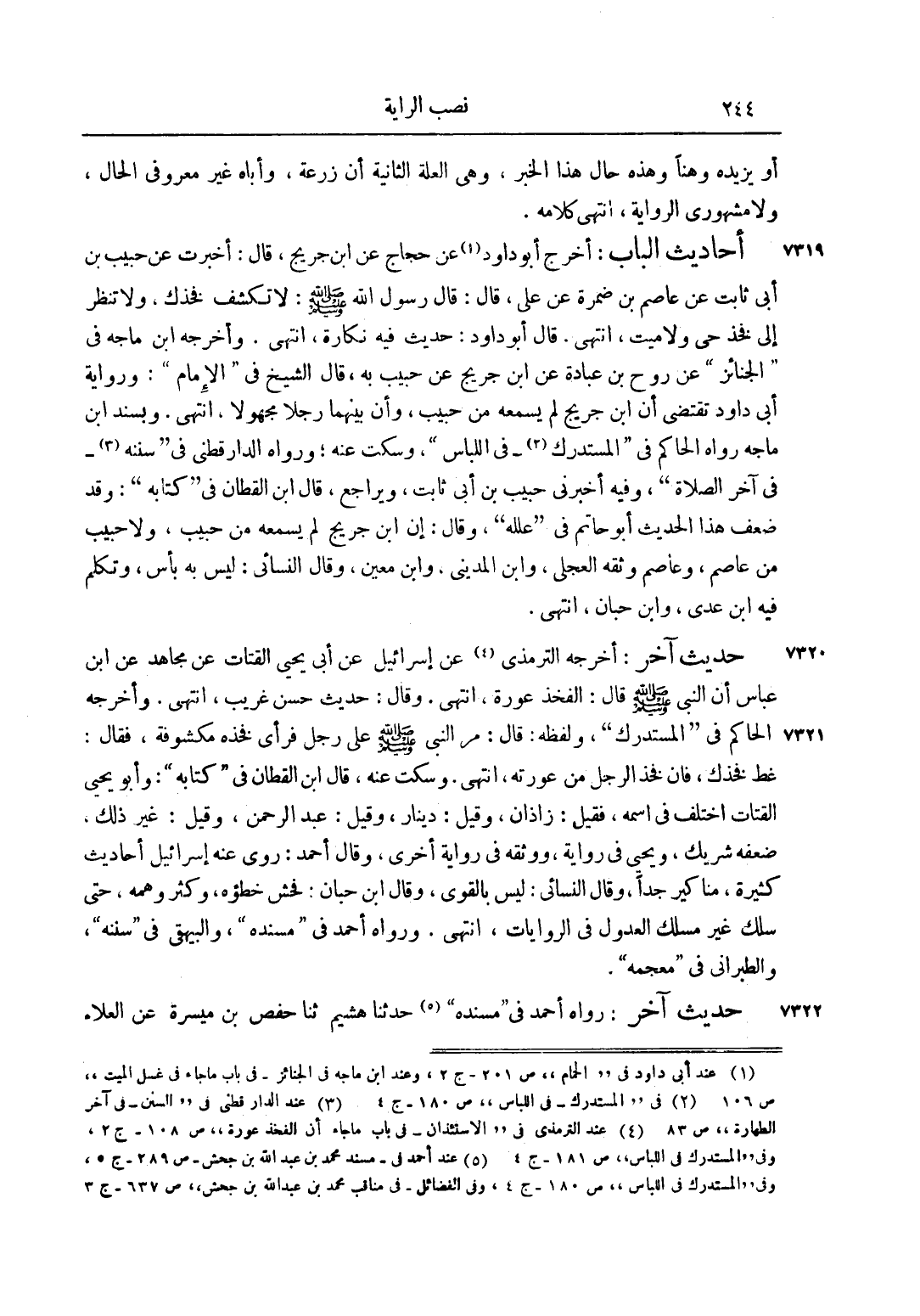 أَحَادِيثُ الْبَابِ: أَخْرَجَ أَبُو دَاوُد1 عَنْ حَجَّاجٍ عَنْ ابْنِ جُرَيْجٍ، قَالَ: أُخْبِرْتُ عَنْ حَبِيبِ بْنِ أَبِي ثَابِتٍ عَنْ عَاصِمِ بْنِ ضَمْرَةَ عَنْ عَلِيٍّ، قَالَ: قَالَ رَسُولُ اللَّهِ صَلَّى اللَّهُ عَلَيْهِ وَسَلَّمَ: "لَا تَكْشِفْ فَخِذَك، وَلَا تَنْظُرْ إلَى فخذ حي ولاميت"، انْتَهَى. قَالَ أَبُو دَاوُد: حَدِيثٌ فِيهِ نَكَارَةٌ، انْتَهَى. وَأَخْرَجَهُ ابْنُ مَاجَهْ فِي الْجَنَائِزِ عَنْ رَوْحِ بْنِ عُبَادَةَ عَنْ ابْنِ جُرَيْجٍ عَنْ حَبِيبٍ بِهِ، قَالَ الشَّيْخُ فِي الْإِمَامِ: وَرِوَايَةُ أَبِي دَاوُد تَقْتَضِي أَنَّ ابْنَ جُرَيْجٍ لَمْ يَسْمَعْهُ مِنْ حَبِيبٍ، وَأَنَّ بَيْنَهُمَا رَجُلًا مَجْهُولًا، انْتَهَى. وَبِسَنَدِ ابْنِ مَاجَهْ رَوَاهُ الْحَاكِمُ فِي الْمُسْتَدْرَكِ2 فِي اللِّبَاسِ، وَسَكَتَ عَنْهُ، وَرَوَاهُ الدَّارَقُطْنِيُّ فِي سُنَنِهِ3 فِي آخِرِ الصَّلَاةِ، وَفِيهِ أَخْبَرَنِي حَبِيبُ بْنُ أَبِي ثَابِتٍ، وَيُرَاجَعُ، قَالَ ابْنُ الْقَطَّانِ فِي كِتَابِهِ: وَقَدْ ضَعَّفَ هَذَا الْحَدِيثَ أَبُو حَاتِمٍ فِي عِلَلِهِ، وَقَالَ: إنَّ ابْنَ جُرَيْجٍ لَمْ يَسْمَعْهُ مِنْ حَبِيبٍ، وَلَا حَبِيبٌ مِنْ عَاصِمٍ، وَعَاصِمٌ وَثَّقَهُ الْعِجْلِيّ، وَابْنُ الْمَدِينِيِّ، وَابْنُ مَعِينٍ، وَقَالَ النَّسَائِيّ: لَيْسَ بِهِ بَأْسٌ، وَتَكَلَّمَ فِيهِ ابْنُ عَدِيٍّ، وَابْنُ حِبَّانَ، انْتَهَى.
