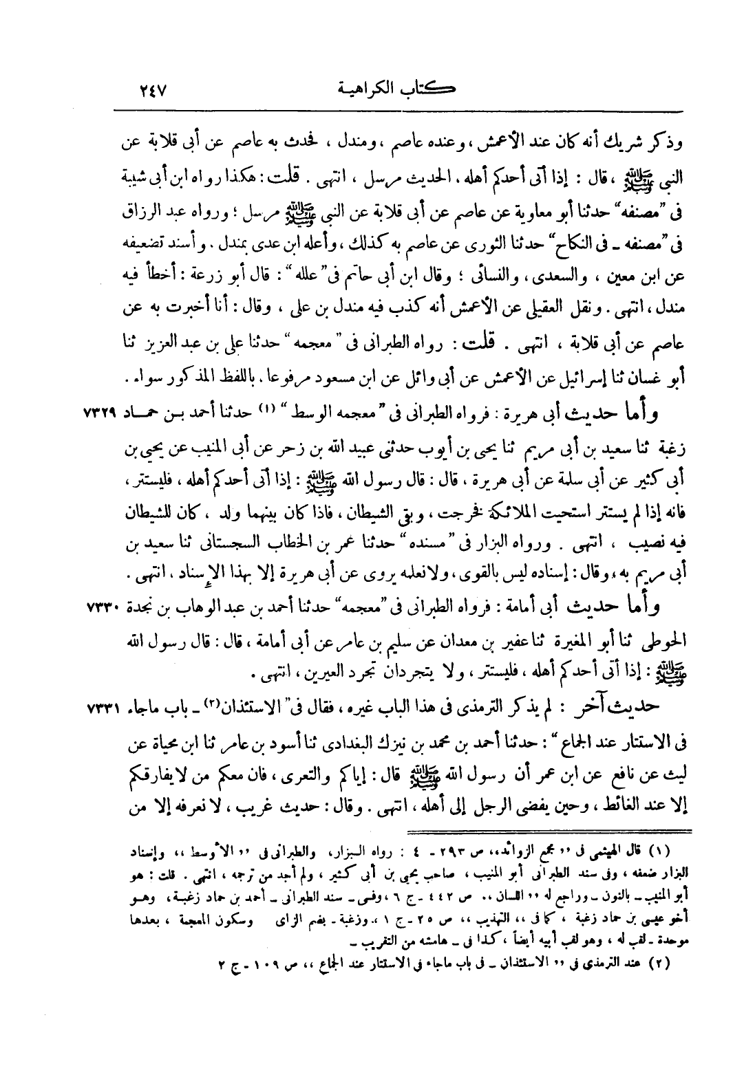وَذَكَرَ شَرِيكٌ أَنَّهُ كَانَ عِنْدَ الْأَعْمَشِ، وَعِنْدَهُ عَاصِمٌ، وَمِنْدَلٌ، فَحَدَّثَ بِهِ عَاصِمٌ عَنْ أَبِي قِلَابَةَ عَنْ النَّبِيِّ صَلَّى اللَّهُ عَلَيْهِ وَسَلَّمَ، قَالَ: "إذَا أَتَى أَحَدُكُمْ أَهْلَهُ"، الْحَدِيثَ مُرْسَلٌ، انْتَهَى. قُلْتُ: هَكَذَا رَوَاهُ ابْنُ أَبِي شَيْبَةَ فِي مُصَنَّفِهِ حَدَّثَنَا أَبُو مُعَاوِيَةَ عَنْ عَاصِمٍ عَنْ أَبِي قِلَابَةَ عَنْ النَّبِيِّ صَلَّى اللَّهُ عَلَيْهِ وَسَلَّمَ مُرْسَلٌ، وَرَوَاهُ عَبْدُ الرَّزَّاقِ فِي مُصَنَّفِهِ فِي النِّكَاحِ حَدَّثَنَا الثَّوْرِيُّ عَنْ عَاصِمٍ بِهِ كَذَلِكَ، وَأَعَلَّهُ ابْنُ عَدِيٍّ بِمِنْدَلٍ، وأسند تضعيفه عن ابن مَعِينٍ، وَالسَّعْدِيِّ، وَالنَّسَائِيُّ، وَقَالَ ابْنُ أَبِي حَاتِمٍ فِي عِلَلِهِ: قَالَ أَبُو زُرْعَةَ: أَخْطَأَ فِيهِ مِنْدَلٌ، انْتَهَى. والسعدي، والنسائي، وَنَقَلَ الْعُقَيْلِيُّ عَنْ الْأَعْمَشِ أَنَّهُ كَذَبَ فِيهِ مِنْدَلُ بْنُ عَلِيٍّ، وَقَالَ: أَنَا أُخْبِرْتُ بِهِ عَنْ عَاصِمٍ عَنْ أَبِي قِلَابَةَ، انْتَهَى. قُلْتُ: رَوَاهُ الطَّبَرَانِيُّ فِي مُعْجَمِهِ حَدَّثَنَا عَلِيُّ بْنُ عَبْدِ الْعَزِيزِ ثَنَا أَبُو غَسَّانَ ثَنَا إسْرَائِيلُ عَنْ الْأَعْمَشِ عَنْ أَبِي وَائِلٍ عَنْ ابْنِ مَسْعُودٍ مَرْفُوعًا، بِاللَّفْظِ الْمَذْكُورِ سَوَاءً.