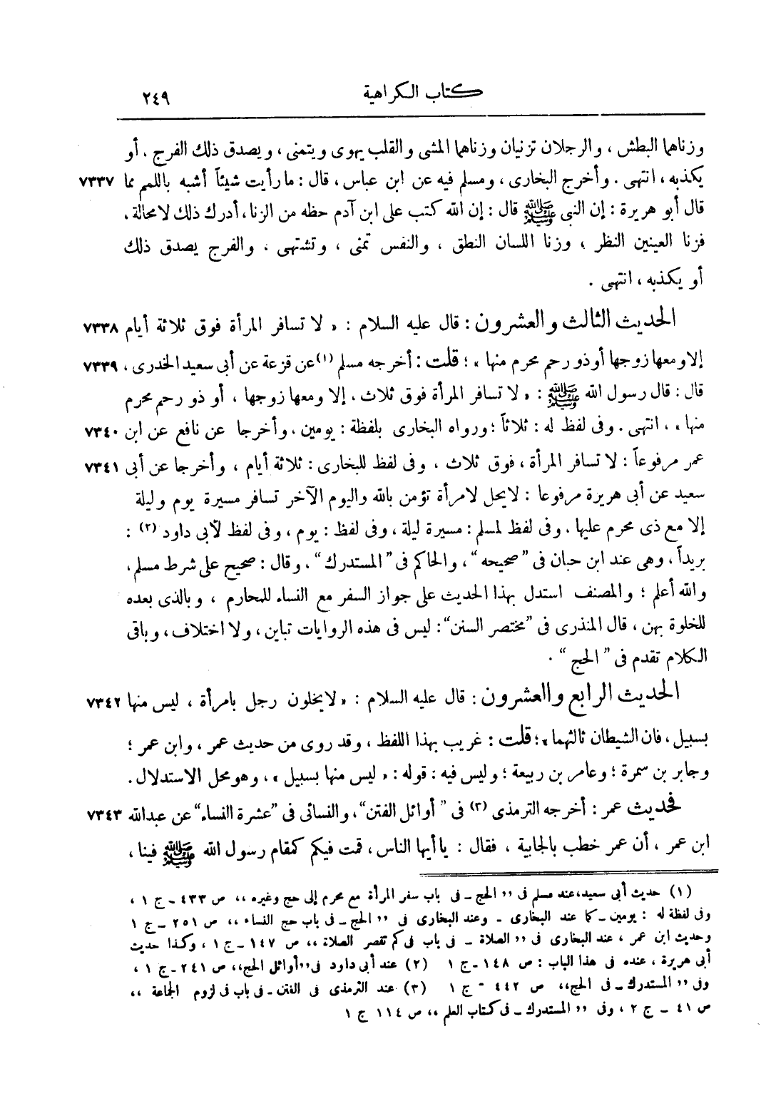 1 حديث أبي سعيد، عند مسلم في الحج في باب سفر المرأة مع محرم إلى حج وغيره ص 433 ج 1، وفي لفظة له: يومين كما عند البخاري وعند البخاري في الحج في باب حج النساء ص 251 ج 1 وحديث ابن عمر، وعند البخاري في الصلاة في باب في كم تقصر الصلاة ص 147 ج 1، وكذا حديث أبي هريرة، عنده في هذا الباب: ص 148 ج 1.