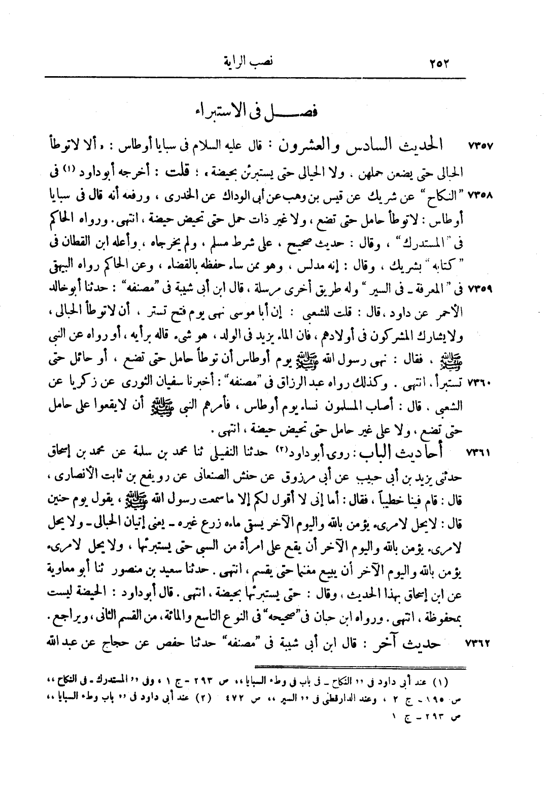 1 عند أبي داود في النكاح في باب في وطء السبايا ص 293 ج 1، وفي المستدرك في النكاح ص 195 ج 2، وعند الدارقطني في السير ص 472.