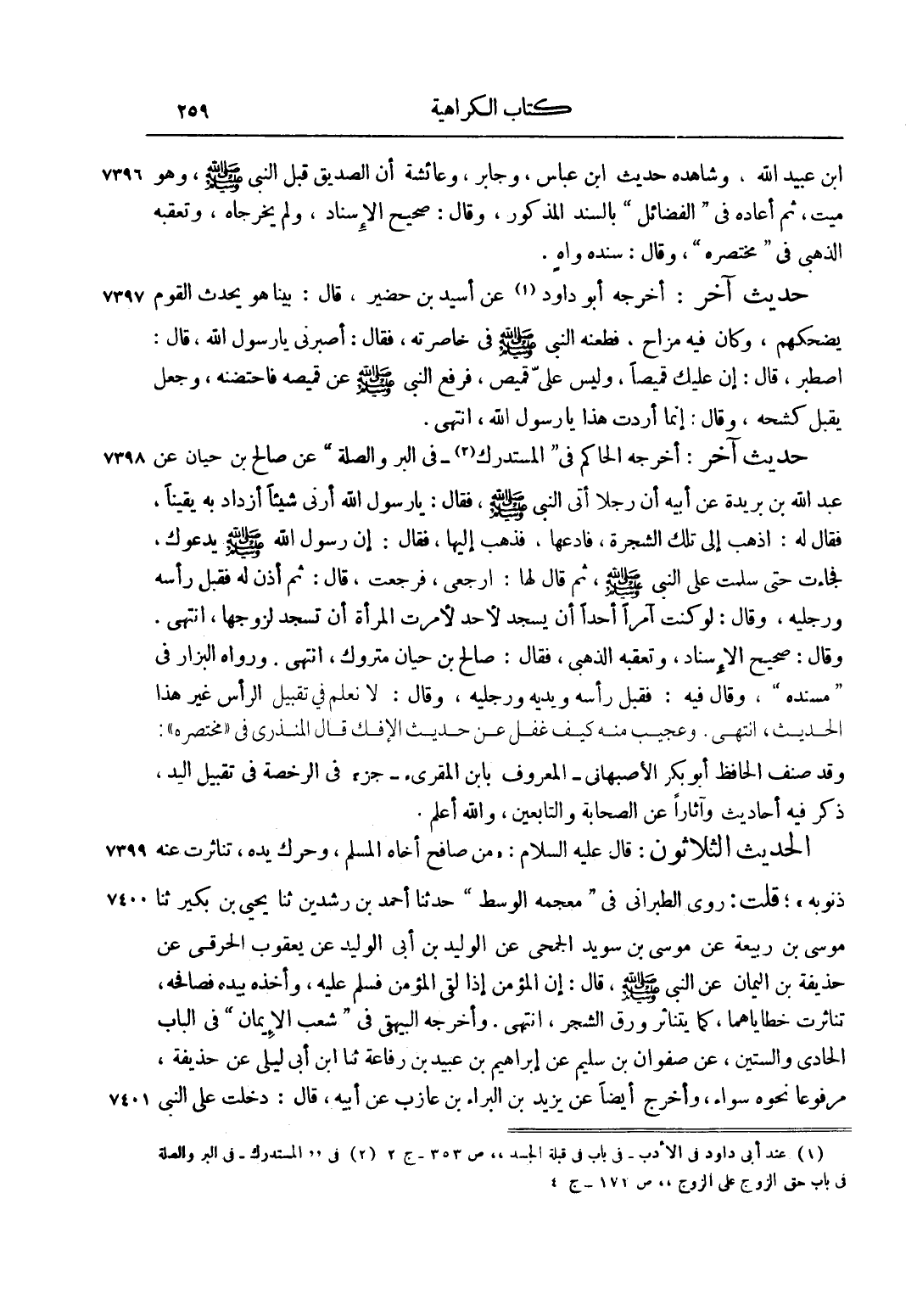 - حَدِيثٌ آخَرُ: أَخْرَجَهُ الْحَاكِمُ فِي "الْمُسْتَدْرَكِ 2 - فِي الْبِرِّ وَالصِّلَةِ" عَنْ صَالح بن حَيَّان عَنْ عَبْدِ اللَّهِ بْنِ بُرَيْدَةَ عَنْ أَبِيهِ أَنَّ رجلا أَتَى النَّبِي صَلَّى الله عَلَيْهِ وَسلم، فَقَالَ: يَا رَسُولَ اللَّهِ أَرِنِي شَيْئا أزداد بِهِ يَقِينًا، فَقَالَ لَهُ: اذْهَبْ إلَى تِلْكَ الشَّجَرَةِ، فَادْعُهَا، فَذَهَبَ إلَيْهَا، فَقَالَ: إِن رَسُول الله صَلَّى الله عَلَيْهِ وَسلم يَدْعُوكِ، فَجَاءَتْ حَتَّى سَلَّمَتْ عَلَى النَّبِي صَلَّى الله عَلَيْهِ وَسلم، ثُمَّ قَالَ لَهَا: ارْجِعِي، فَرَجَعَتْ، قَالَ: ثُمَّ أَذِنَ لَهُ فَقَبَّلَ رَأْسَهُ وَرِجْلَيْهِ، وَقَالَ: لَوْ كُنْتُ آمِرًا أَحَدًا أَنْ يَسْجُدَ لِأَحَدٍ لَأَمَرْتُ الْمَرْأَةَ أَنْ تَسْجُدَ لِزَوْجِهَا، انْتَهَى. وَقَالَ: صَحِيحُ الْإِسْنَادِ، وَتَعَقَّبَهُ الذَّهَبِيُّ، فَقَالَ: صَالح بن حَيَّان مَتْرُوكٌ، انْتَهَى. وَرَوَاهُ الْبَزَّارُ فِي "مُسْنَدِهِ"، وَقَالَ فِيهِ: فَقَبَّلَ رَأْسَهُ وَيَدَيْهِ وَرِجْلَيْهِ، وَقَالَ: لَا يُعْلَمُ فِي تَقْبِيلِ الرَّأْسِ غَيْرُ هَذَا الْحَدِيثِ، انْتَهَى. وَأَعْجَبُ مِنْهُ كَيْفَ غَفَلَ عَنْ - حَدِيثِ الْإِفْكِ - قَالَ الْمُنْذِرِيُّ فِي "مُخْتَصَرِهِ": وَقَدْ صَنَّفَ الْحَافِظُ أَبُو بَكْرٍ الْأَصْبَهَانِيُّ - الْمَعْرُوفُ بِابْن الْمُقْرِئ - جُزْء فِي الرُّخْصَةِ فِي تَقْبِيلِ الْيَدِ، ذَكَرَ فِيهِ أَحَادِيثَ وآثار عَنْ الصَّحَابَةِ وَالتَّابِعِينَ، وَاَللَّهُ أَعْلَمُ.