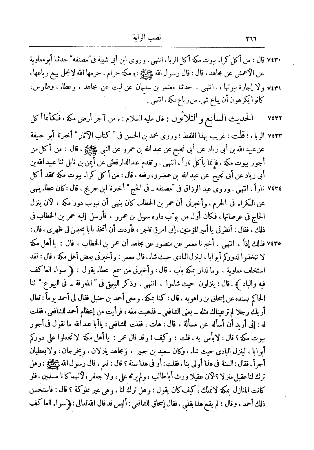 الْحَدِيثُ السَّابِعُ وَالثَّلَاثُونَ: قَالَ عليه السلام: "مَنْ آجَرَ أَرْضَ مَكَّةَ، فَكَأَنَّمَا أَكَلَ الرِّبَا"، قُلْتُ: غَرِيبٌ بِهَذَا اللَّفْظِ، وَرَوَى مُحَمَّدُ بْنُ الْحَسَنِ فِي كِتَابِ الْآثَارِ أَخْبَرَنَا أَبُو حَنِيفَةَ عَنْ عُبَيْدِ اللَّهِ بْنِ أَبِي زِيَادٍ عَنْ أَبِي نَجِيحٍ عَنْ عبد الله بن عمر عَنْ النَّبِيِّ صَلَّى اللَّهُ عَلَيْهِ وَسَلَّمَ، قَالَ: "مَنْ أَكَلَ مِنْ أُجُورِ بُيُوتِ مَكَّةَ، فَإِنَّمَا يَأْكُلُ نَارًا"، انْتَهَى. وَتَقَدَّمَ عِنْدَ الدَّارَقُطْنِيِّ عَنْ أَيْمَنَ بْنِ نَابِلٍ ثَنَا عُبَيْدُ اللَّهِ بْنُ أَبِي زِيَادٍ عَنْ أَبِي نَجِيحٍ عَنْ عَبْدِ اللَّهِ بْنِ عُمَرَ، وَرَفَعَهُ، قَالَ: "مَنْ أَكَلَ كِرَاءَ بُيُوتِ مَكَّةَ فَقَدْ أَكَلَ نَارًا"، انْتَهَى. وَرَوَى عَبْدُ الرَّزَّاقِ فِي مُصَنَّفِهِ فِي الْحَجِّ أَخْبَرَنَا ابْنُ جُرَيْجٍ، قَالَ: كَانَ عَطَاءٌ يَنْهَى عَنْ الْكِرَاءِ فِي الْحَرَمِ، وَأَخْبَرَنِي أَنَّ عُمَرَ بْنَ الْخَطَّابِ كَانَ يَنْهَى أَنْ تُبَوَّبَ دُورُ مَكَّةَ، لَأَنْ يَنْزِلَ الْحَاجُّ فِي عَرَصَاتِهَا، فَكَانَ أَوَّلَ مَنْ بَوَّبَ دَارِهِ سُهَيْلُ بْنُ عَمْرٍو، فَأَرْسَلَ إلَيْهِ عُمَرُ بْنُ الْخَطَّابِ فِي ذَلِكَ، فَقَالَ: أَنْظَرَنِي يَا أَمِيرَ الْمُؤْمِنِينَ، إنِّي امْرُؤٌ تَاجِرٌ، فَأَرَدْتُ أَنْ أَتَّخِذَ بَابًا يَحْبِسُ لِي ظَهْرِي، قَالَ: فَذَلِكَ إذًا، انْتَهَى. أَخْبَرَنَا مَعْمَرٌ عَنْ مَنْصُورٍ عَنْ مُجَاهِدٍ أَنَّ عُمَرَ بْنَ الْخَطَّابِ، قَالَ: يَا أَهْلَ مَكَّةَ لَا تَتَّخِذُوا لِدُورِكُمْ أَبْوَابًا، لِيَنْزِلَ الْبَادِي حَيْثُ شَاءَ، قَالَ مَعْمَرٌ: وَأَخْبَرَنِي بَعْضُ أَهْلِ مَكَّةَ، قَالَ: لَقَدْ اُسْتُخْلِفَ مُعَاوِيَةُ، وَمَا لِدَارٍ بِمَكَّةَ بَابٌ، قَالَ: وَأَخْبَرَنِي مَنْ سَمِعَ عَطَاءً يَقُولُ: {سَوَاءً الْعَاكِفُ فِيهِ وَالْبَادِ} ، قَالَ: يَنْزِلُونَ حَيْثُ شَاءُوا، انْتَهَى. وَذَكَرَ الْبَيْهَقِيُّ فِي الْمَعْرِفَةِ فِي الْبُيُوعِ ثَنَا الْحَاكِمُ بِسَنَدِهِ عَنْ إسْحَاقَ بْنِ رَاهْوَيْهِ، قَالَ: كُنَّا بِمَكَّةَ، وَمَعِي أَحْمَدُ بْنُ حَنْبَلٍ فَقَالَ لِي أَحْمَدُ يَوْمًا: تَعَالَ أُرِيك رَجُلًا لَمْ تَرَ عَيْنَاك مِثْلَهُ يَعْنِي الشَّافِعِيَّ فَذَهَبْت مَعَهُ، فَرَأَيْتُ مِنْ إعْظَامِ أَحْمَدَ لِلشَّافِعِيِّ، فَقُلْت لَهُ: إنِّي أُرِيدُ أَنْ أَسْأَلَهُ عَنْ مَسْأَلَةٍ، قَالَ: هَاتِ، فَقُلْتُ لِلشَّافِعِيِّ: يَا أَبَا عَبْدِ اللَّهِ مَا تَقُولُ فِي أُجُورِ بُيُوتِ مَكَّةَ؟ قَالَ: لَا بَأْسَ بِهِ، قُلْتُ، وَكَيْفَ! وَقَدْ قَالَ عُمَرُ: يَا أَهْلَ مَكَّةَ لَا تَجْعَلُوا عَلَى دُورِكُمْ أَبْوَابًا، لِيَنْزِلَ الْبَادِي حَيْثُ شَاءَ، وَكَانَ سَعِيدُ بْنُ جُبَيْرٍ، وَمُجَاهِدٌ يَنْزِلَانِ، وَيَخْرُجَانِ، وَلَا يُعْطِيَانِ أَجْرًا، فَقَالَ: السُّنَّةُ فِي هَذَا أَوْلَى بِنَا، فَقُلْتُ: أَوَ فِي هَذَا سُنَّةٌ؟ قَالَ: نَعَمْ، قَالَ رَسُولُ اللَّهِ صَلَّى اللَّهُ عَلَيْهِ وَسَلَّمَ: "وَهَلْ تَرَكَ لَنَا عَقِيلٌ مَنْزِلًا"؟ لِأَنَّ عَقِيلًا وَرِثَ أَبَا طَالِبٍ، وَلَمْ يَرِثْهُ عَلِيٌّ، وَلَا جَعْفَرٌ، لِأَنَّهُمَا كَانَا مُسْلِمَيْنِ، فَلَوْ كَانَتْ الْمَنَازِلُ بِمَكَّةَ لَا تُمْلَكُ، كَيْفَ كَانَ يَقُولُ: وَهَلْ تَرَكَ لَنَا، وَهِيَ غَيْرُ مَمْلُوكَةٍ؟ قَالَ: فَاسْتَحْسَنَ ذَلِكَ أَحْمَدُ، وَقَالَ: لَمْ يَقَعْ هَذَا بِقَلْبِي، فَقَالَ إسْحَاقُ لِلشَّافِعِيِّ: أَلَيْسَ قَدْ قَالَ اللَّهُ تَعَالَى: {سَوَاءً الْعَاكِفُ