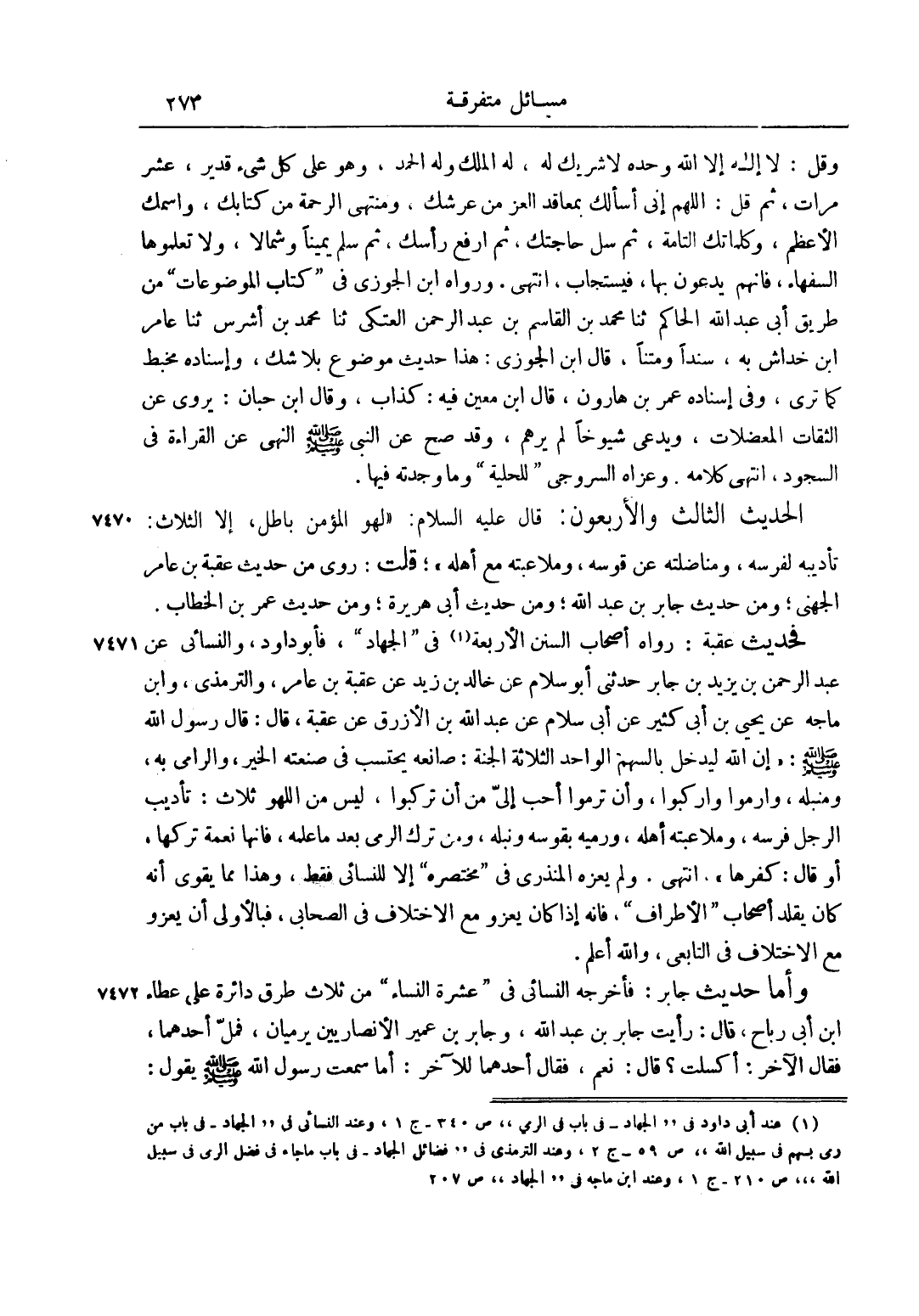 الْحَدِيثُ الثَّالِثُ وَالْأَرْبَعُونَ: قَالَ عليه السلام: "لَهْوُ الْمُؤْمِنِ بَاطِلٌ، إلَّا ثلاث: تَأْدِيبُهُ لِفَرَسِهِ، وَمُنَاضَلَتُهُ عَنْ قَوْسِهِ، وَمُلَاعَبَتُهُ مَعَ أَهْلِهِ"، قُلْتُ: رُوِيَ مِنْ حَدِيثِ عُقْبَةَ بْنِ عَامِرٍ الْجُهَنِيِّ، وَمِنْ حَدِيثِ جَابِرِ بْنِ عَبْدِ اللَّهِ، وَمِنْ حَدِيثِ أَبِي هُرَيْرَةَ، وَمِنْ حَدِيثِ عُمَرَ بْنِ الْخَطَّابِ.